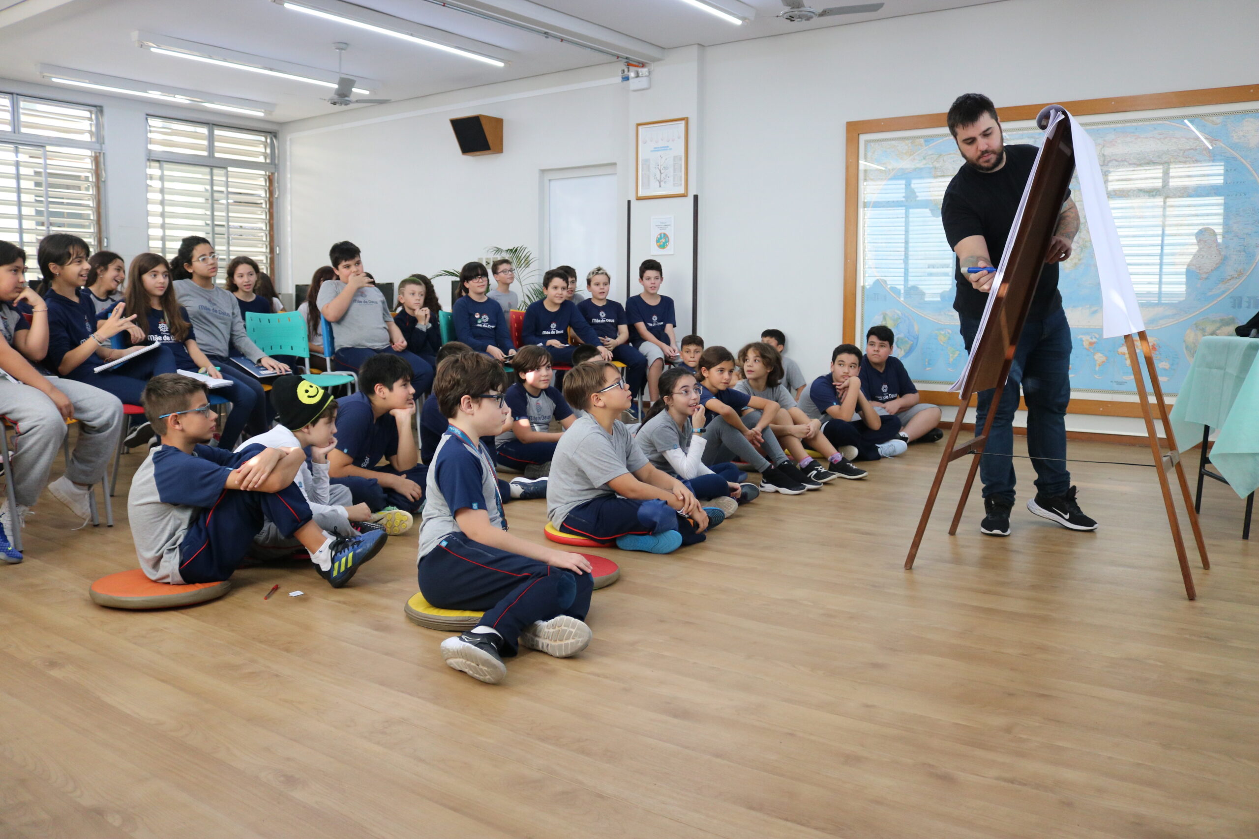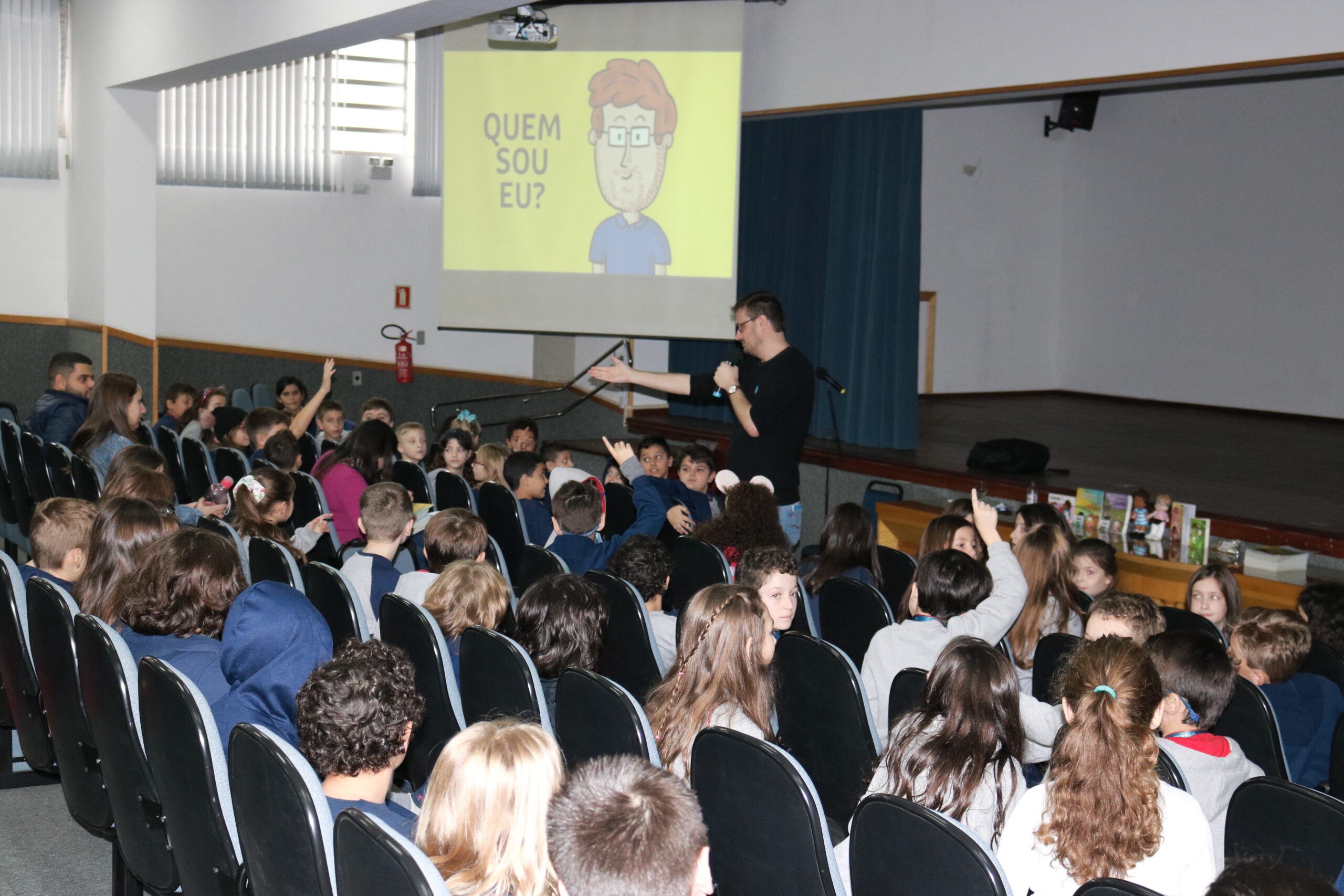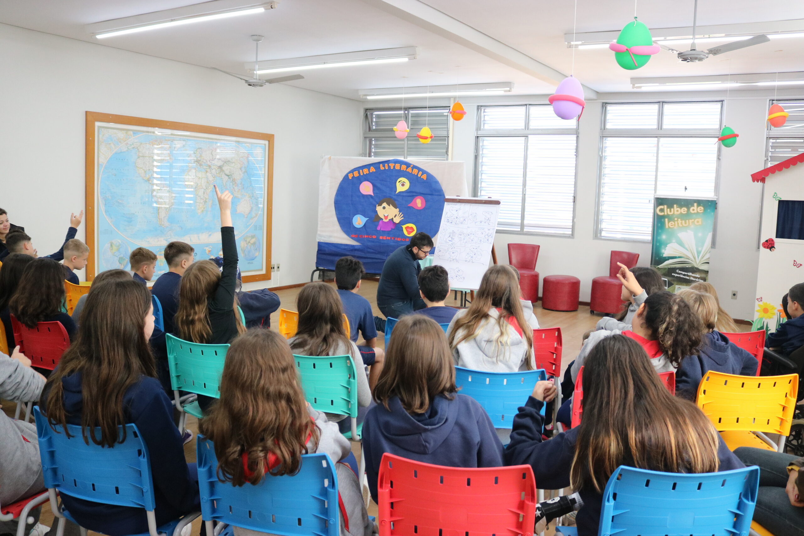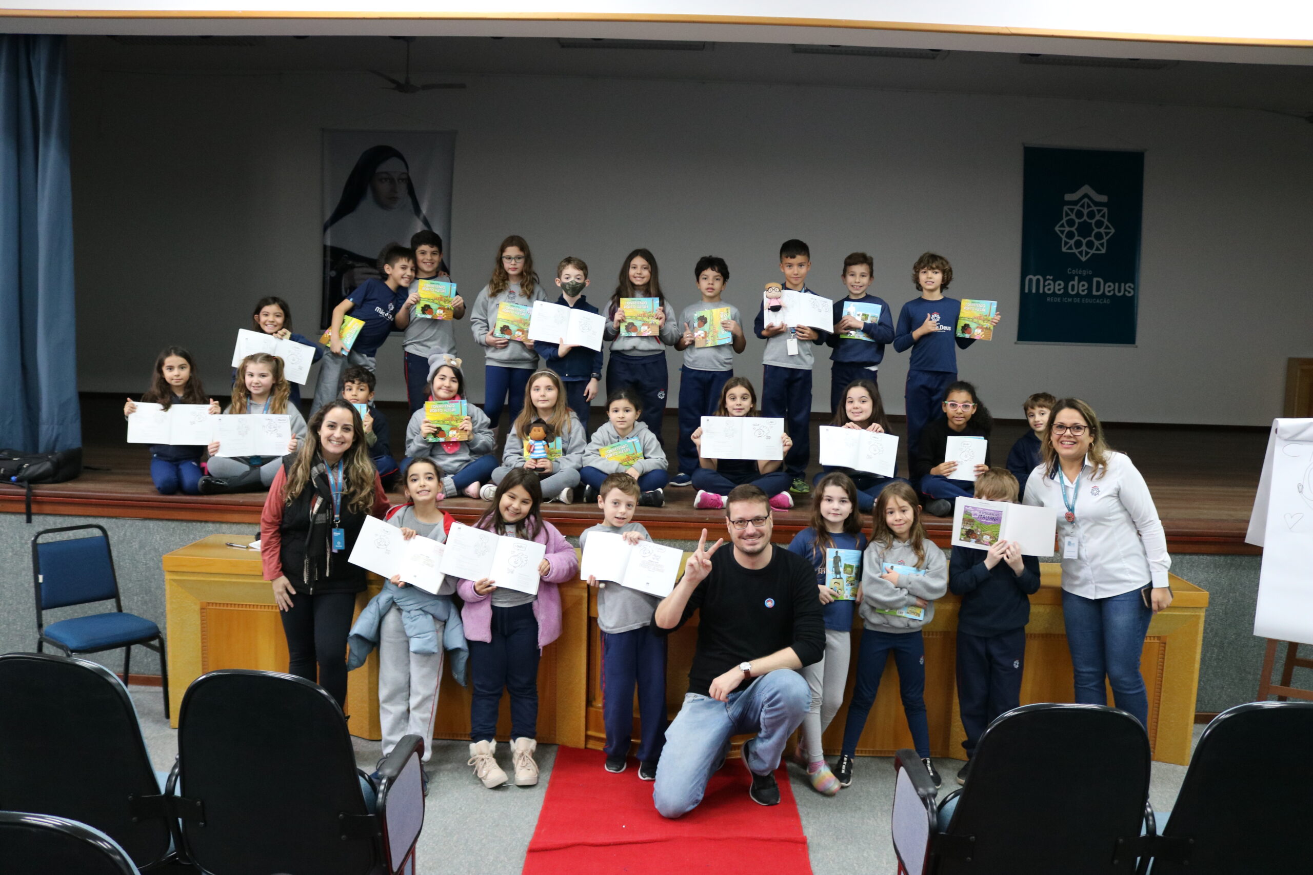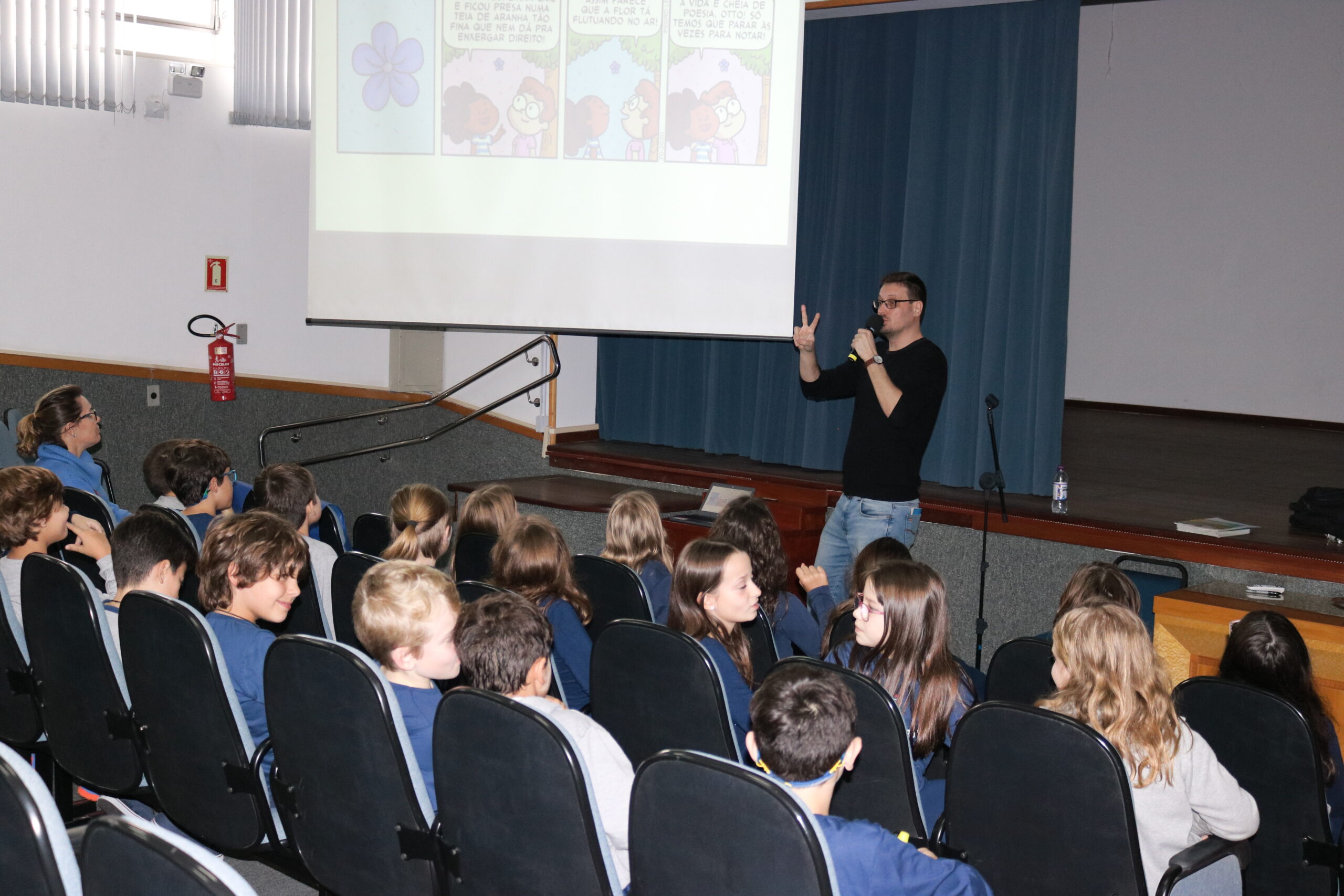 Alunos do 3º e 4º Ano Ensino do Fundamental participaram do bate papo com o cartunista, ilustrador e publicitário, Pedro Leite. O colorido tomou conta do auditório do colégio. Pedro contou com riqueza de detalhes, através de ilustrações criativas, as aventuras dos personagens da série “Sofia e Otto”, conhecendo Porto Alegre, a partir dos principais pontos turísticos da Capital dos gaúchos. Já no segundo livro, sobre a imigração italiana no Rio Grande do Sul, o autor apresentou a história de superação e esforço que foi a vinda dos imigrantes italianos ao Brasil, em especial os que migraram para a Serra Gaúcha. Os alunos adoraram o encontro, ficaram ainda mais motivados a pesquisar e aprender sobre as histórias da nossa cidade e Estado.