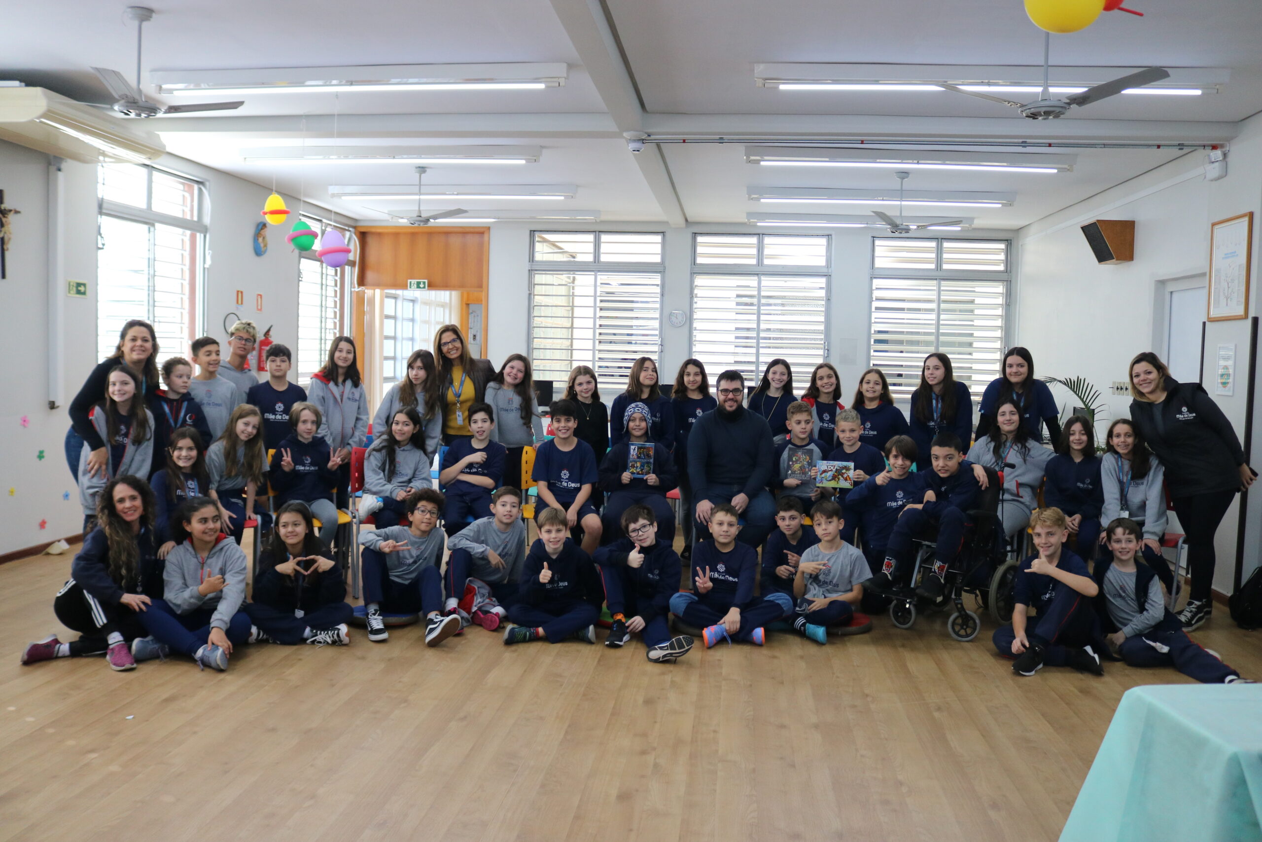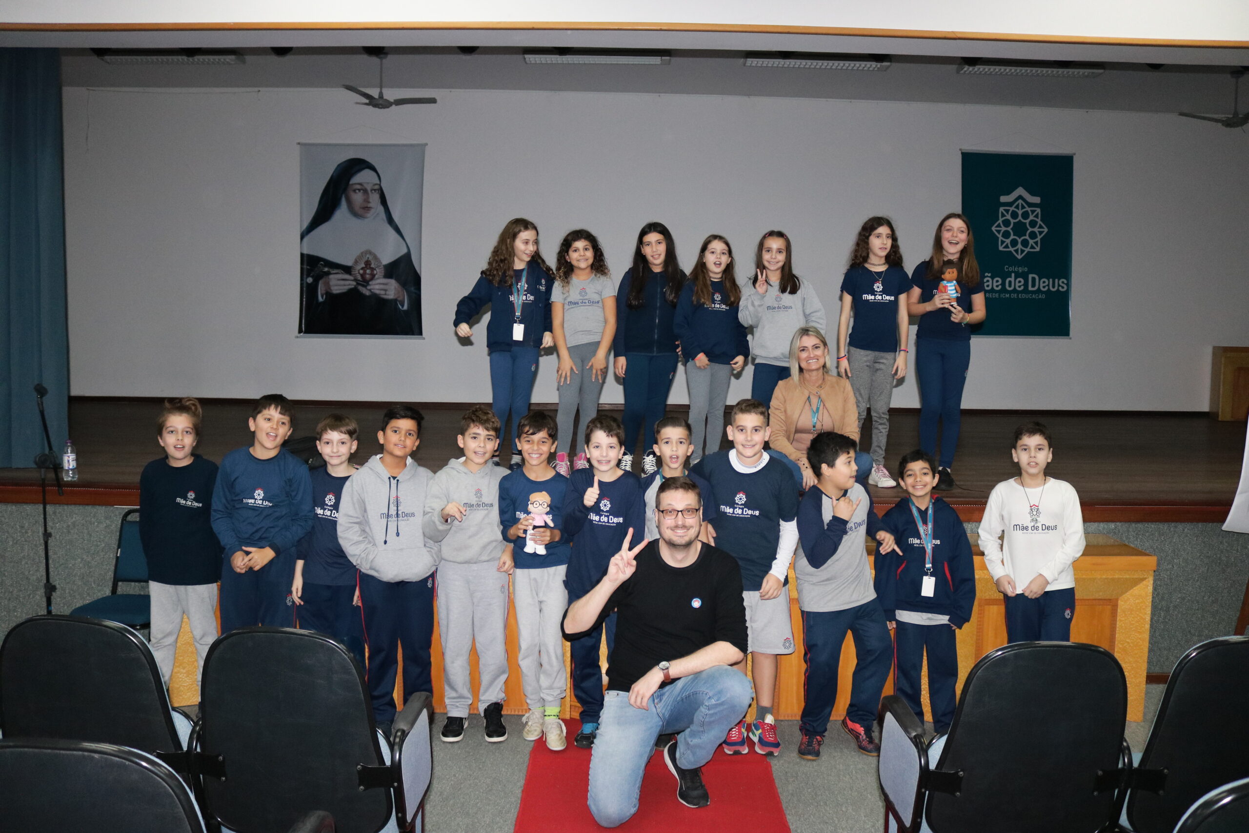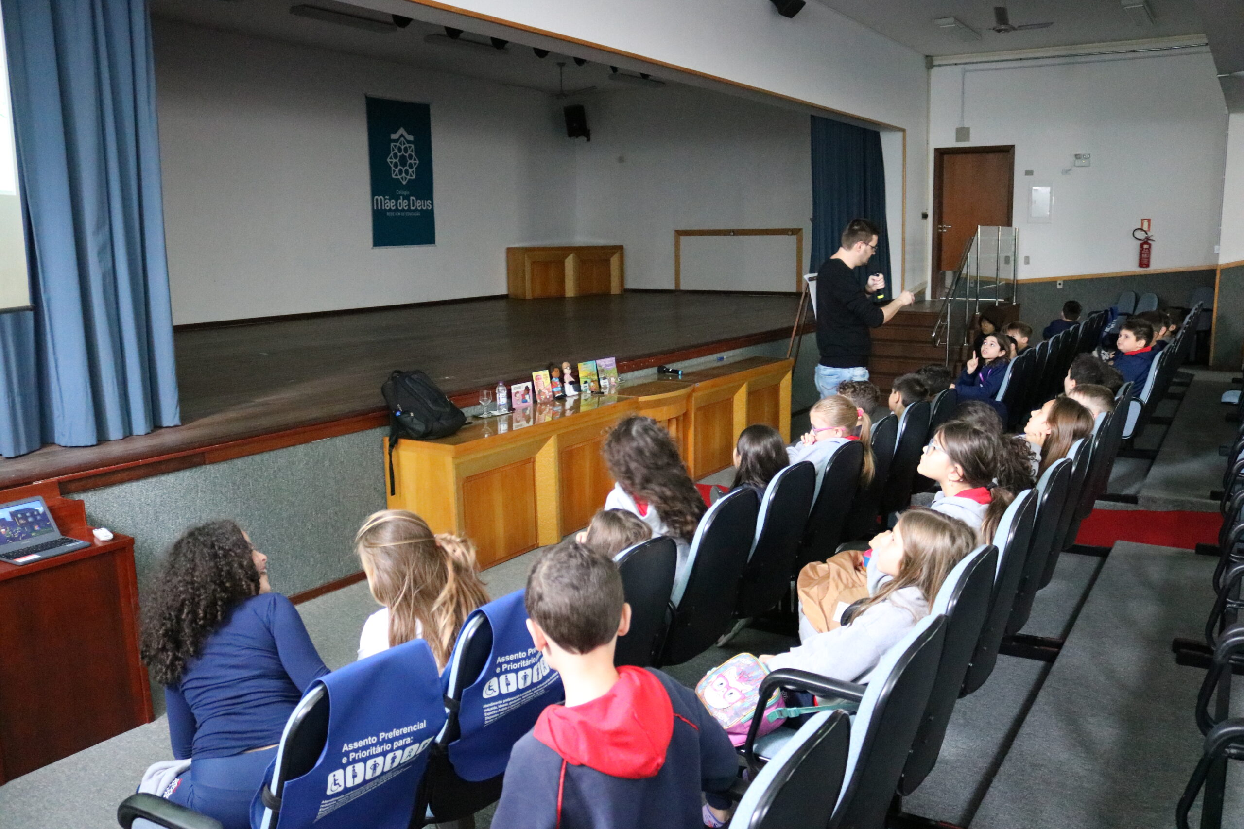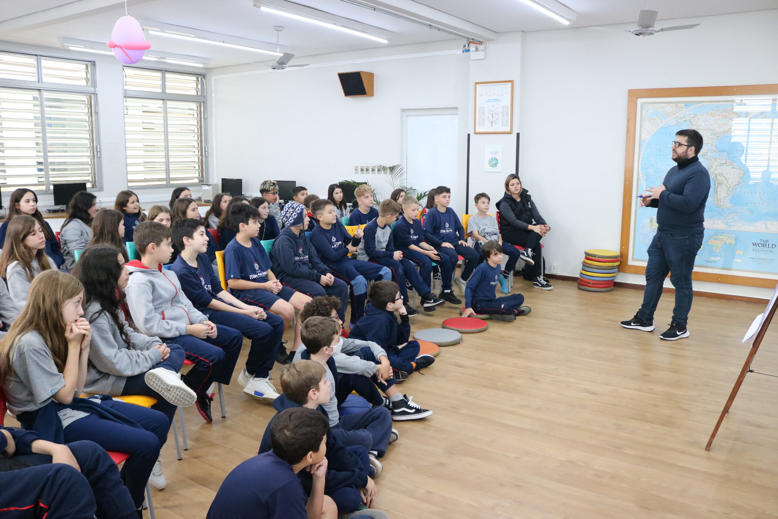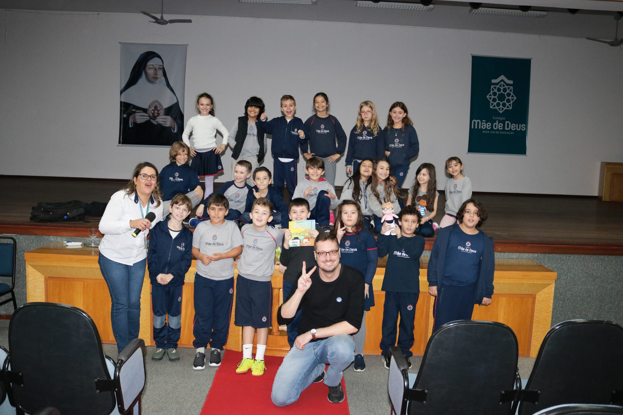 Alunos do 3º e 4º Ano Ensino do Fundamental participaram do bate papo com o cartunista, ilustrador e publicitário, Pedro Leite. O colorido tomou conta do auditório do colégio. Pedro contou com riqueza de detalhes, através de ilustrações criativas, as aventuras dos personagens da série “Sofia e Otto”, conhecendo Porto Alegre, a partir dos principais pontos turísticos da Capital dos gaúchos. Já no segundo livro, sobre a imigração italiana no Rio Grande do Sul, o autor apresentou a história de superação e esforço que foi a vinda dos imigrantes italianos ao Brasil, em especial os que migraram para a Serra Gaúcha. Os alunos adoraram o encontro, ficaram ainda mais motivados a pesquisar e aprender sobre as histórias da nossa cidade e Estado.