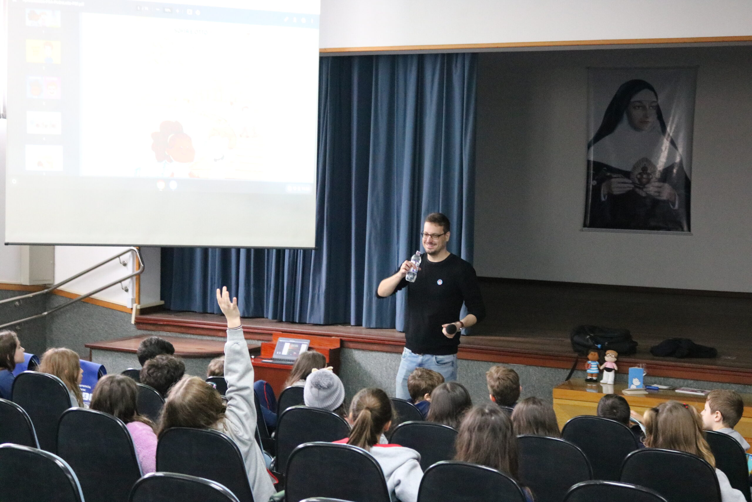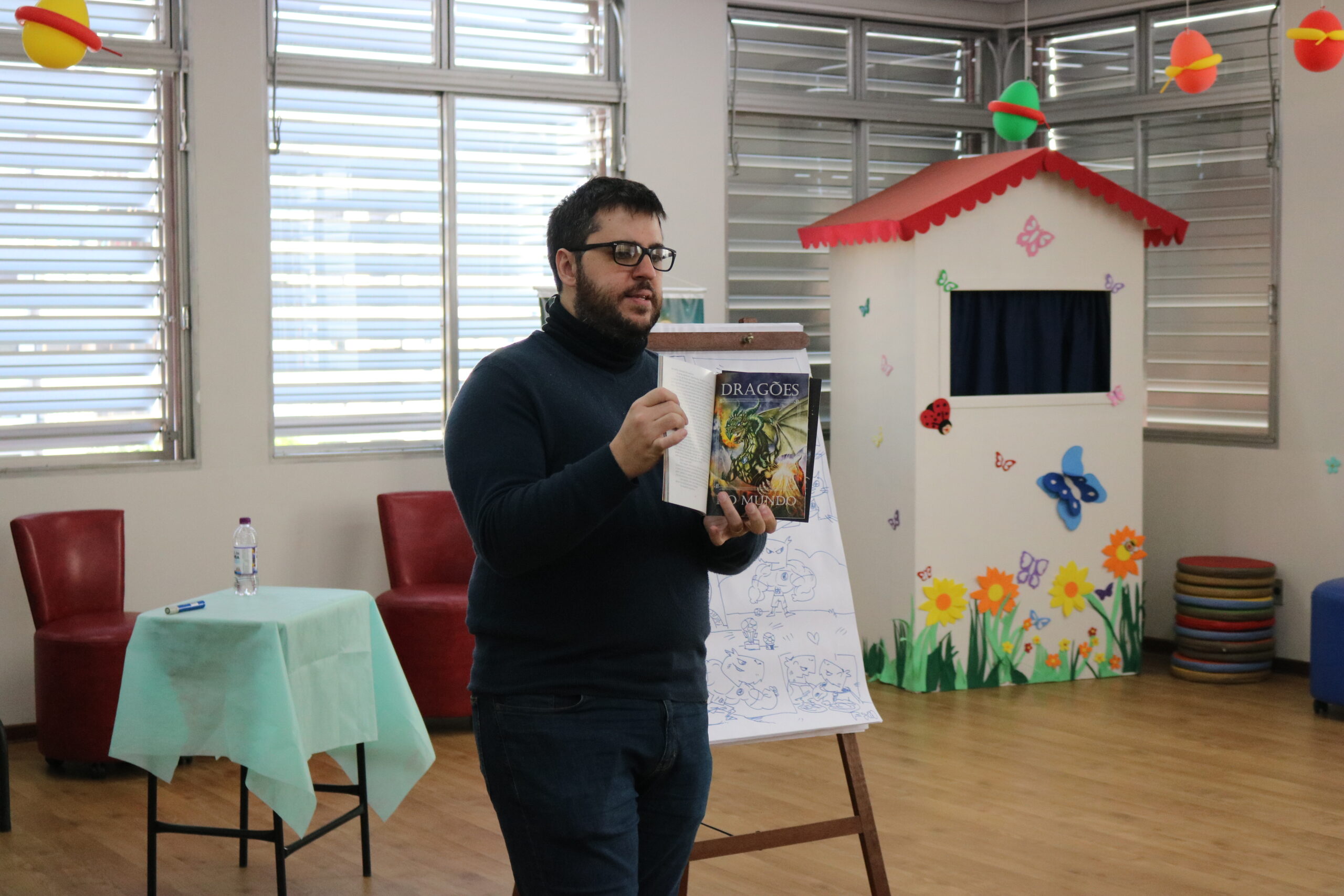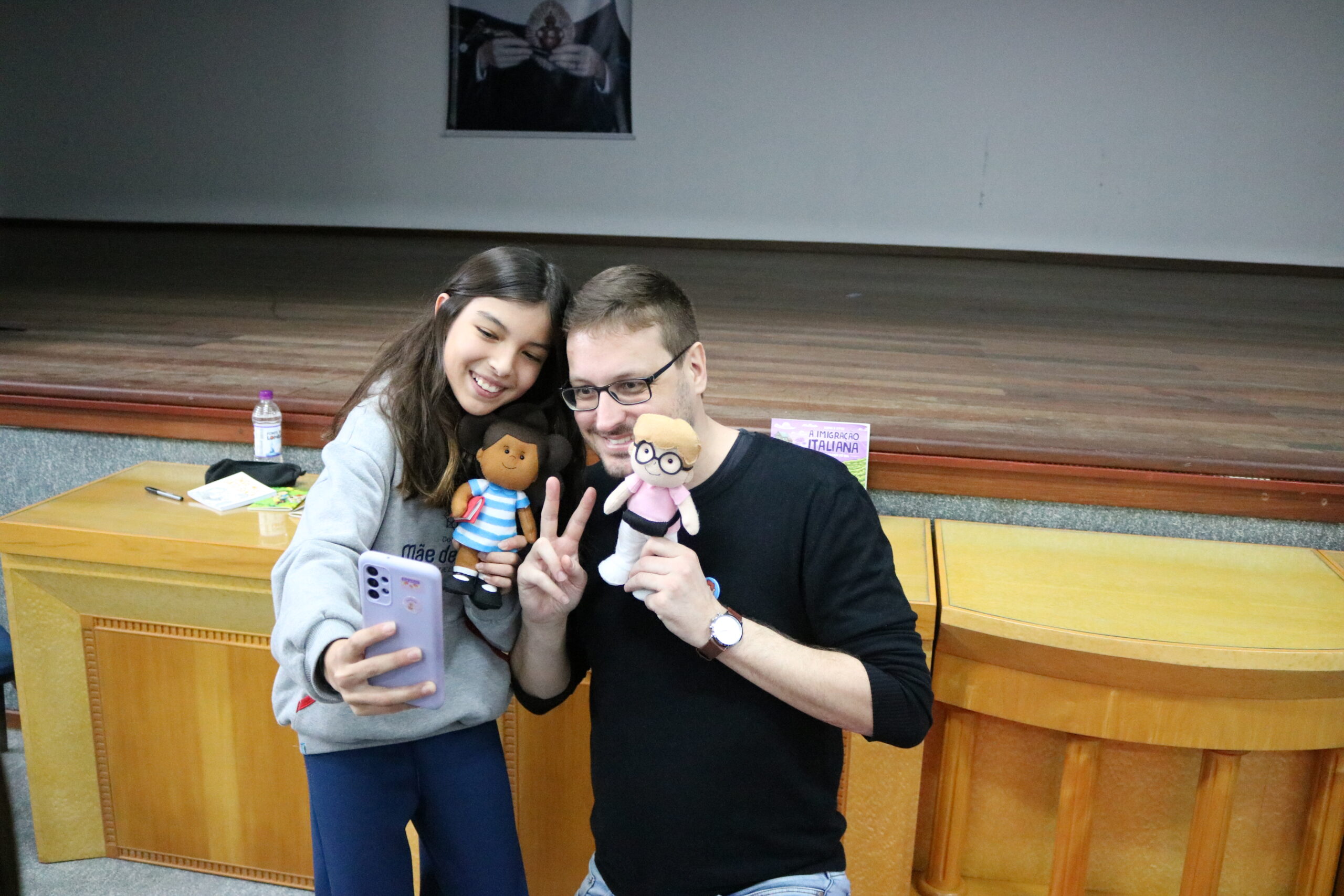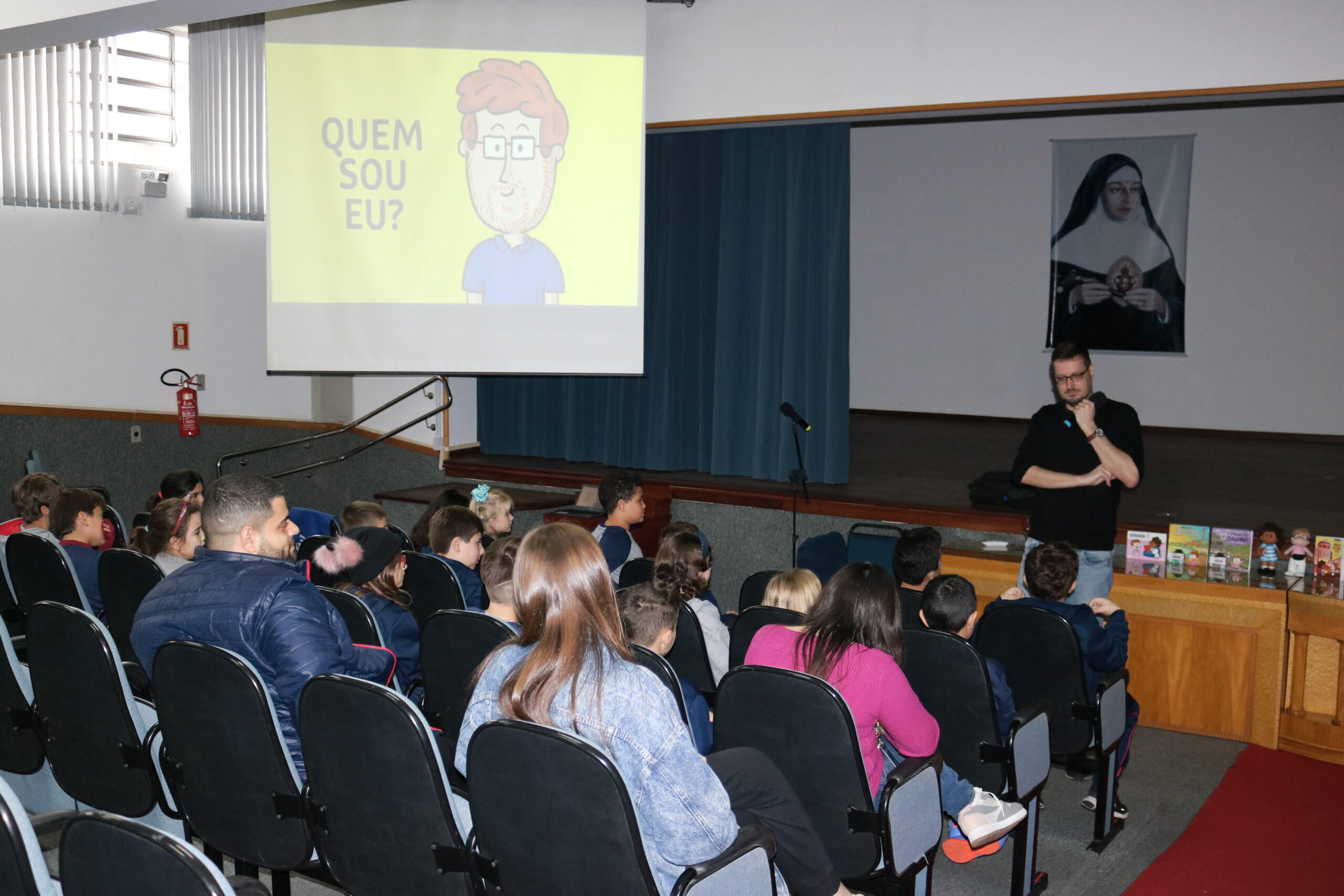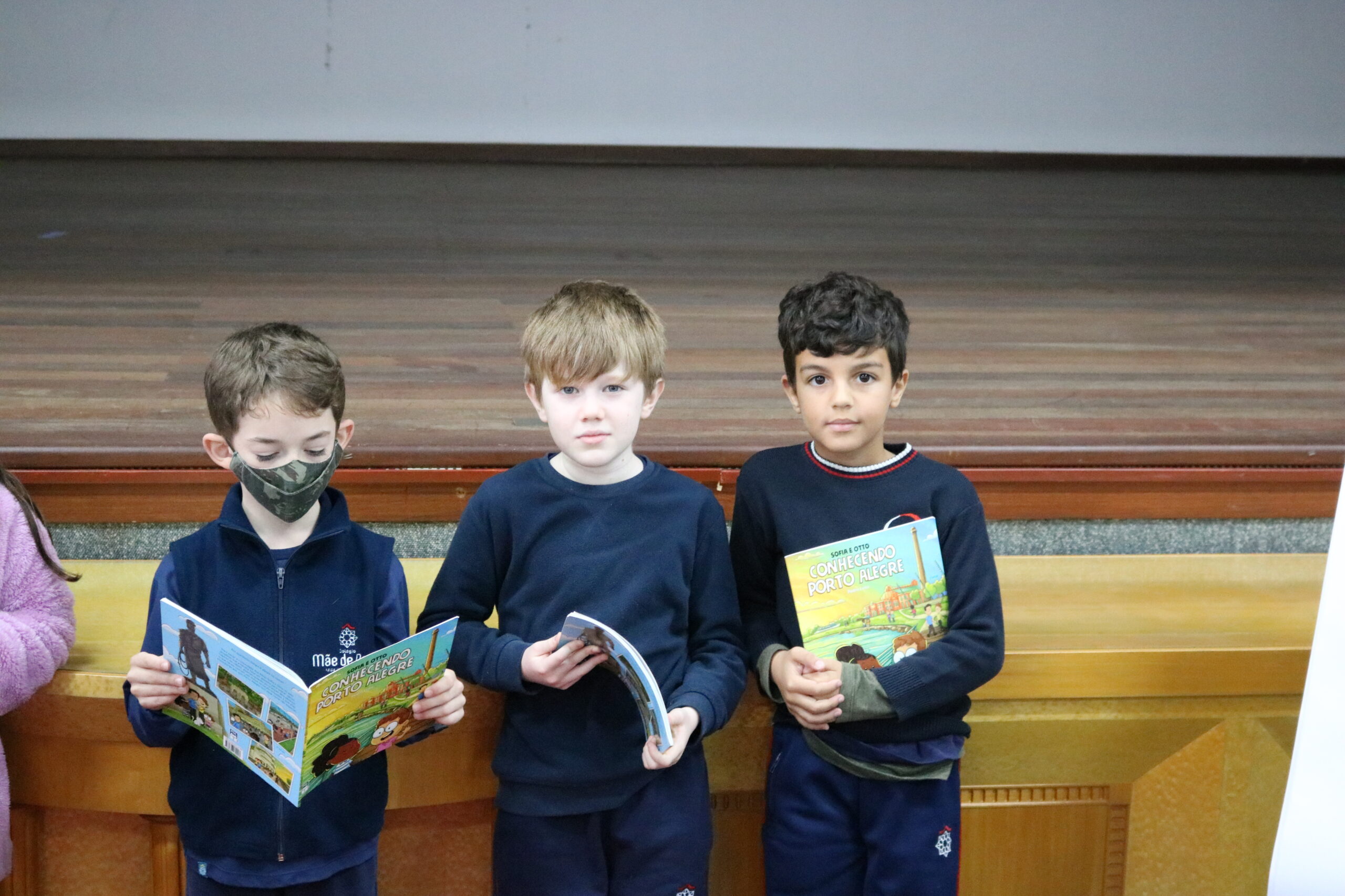 Alunos do 3º e 4º Ano Ensino do Fundamental participaram do bate papo com o cartunista, ilustrador e publicitário, Pedro Leite. O colorido tomou conta do auditório do colégio. Pedro contou com riqueza de detalhes, através de ilustrações criativas, as aventuras dos personagens da série “Sofia e Otto”, conhecendo Porto Alegre, a partir dos principais pontos turísticos da Capital dos gaúchos. Já no segundo livro, sobre a imigração italiana no Rio Grande do Sul, o autor apresentou a história de superação e esforço que foi a vinda dos imigrantes italianos ao Brasil, em especial os que migraram para a Serra Gaúcha. Os alunos adoraram o encontro, ficaram ainda mais motivados a pesquisar e aprender sobre as histórias da nossa cidade e Estado.