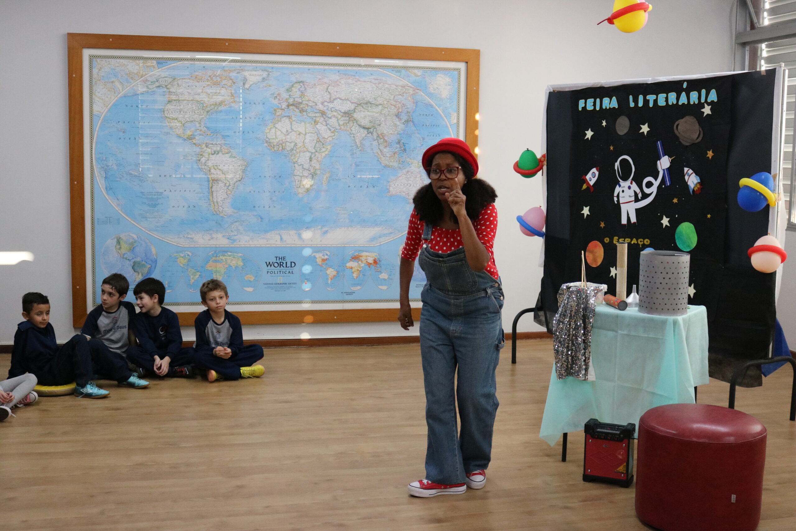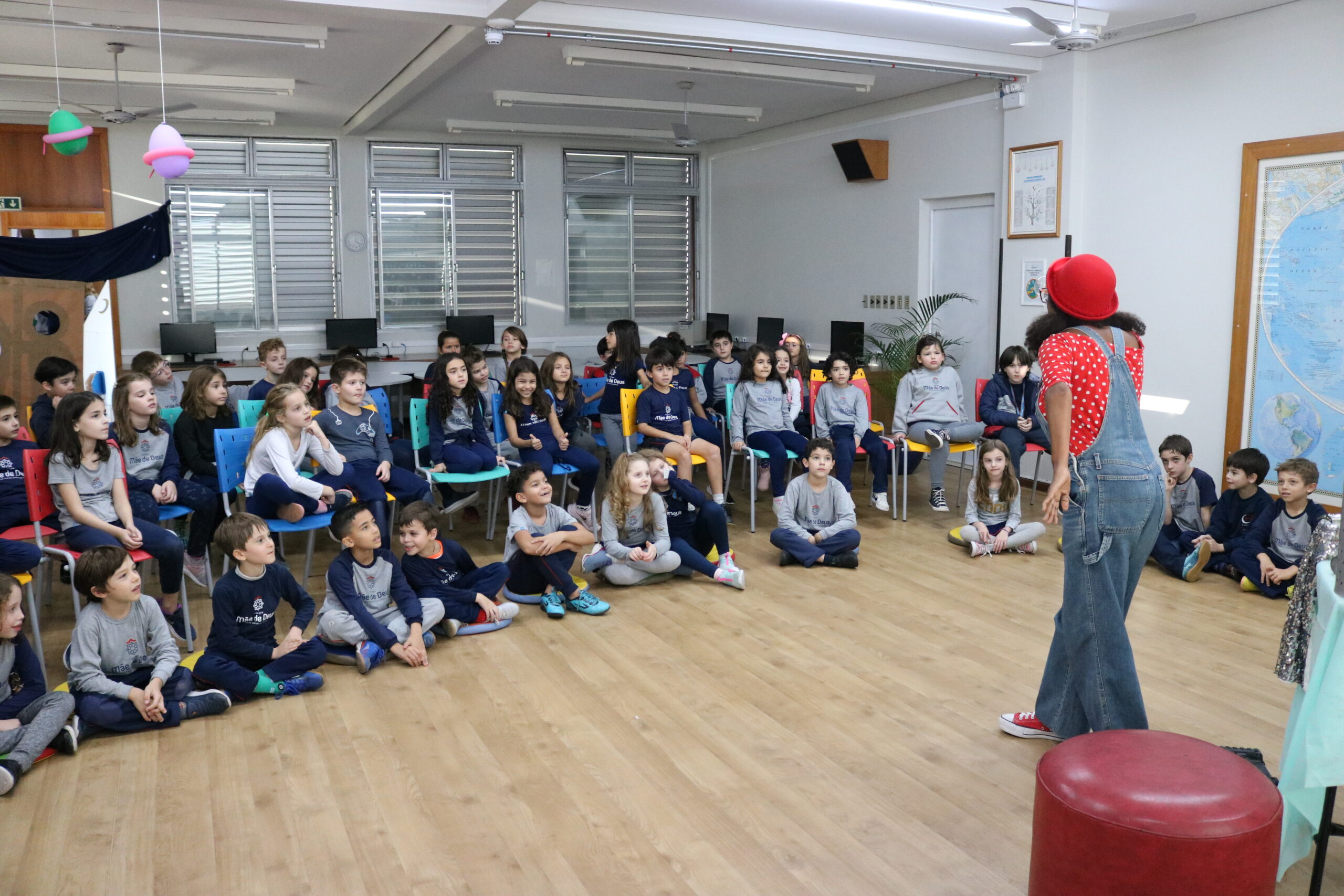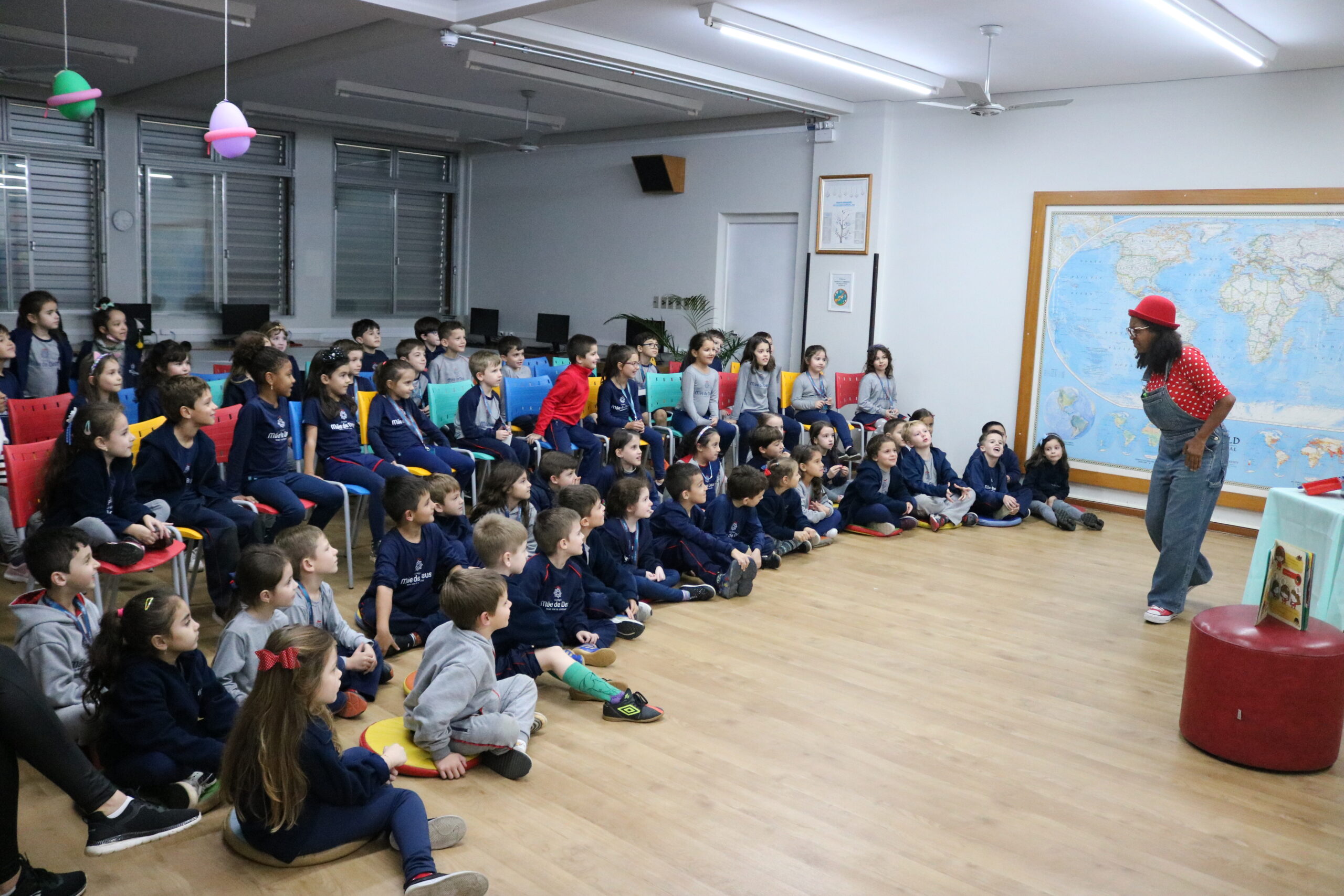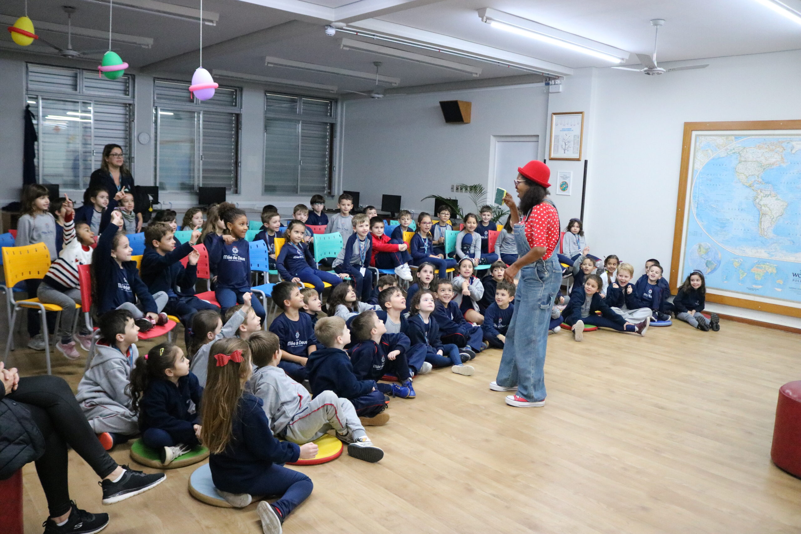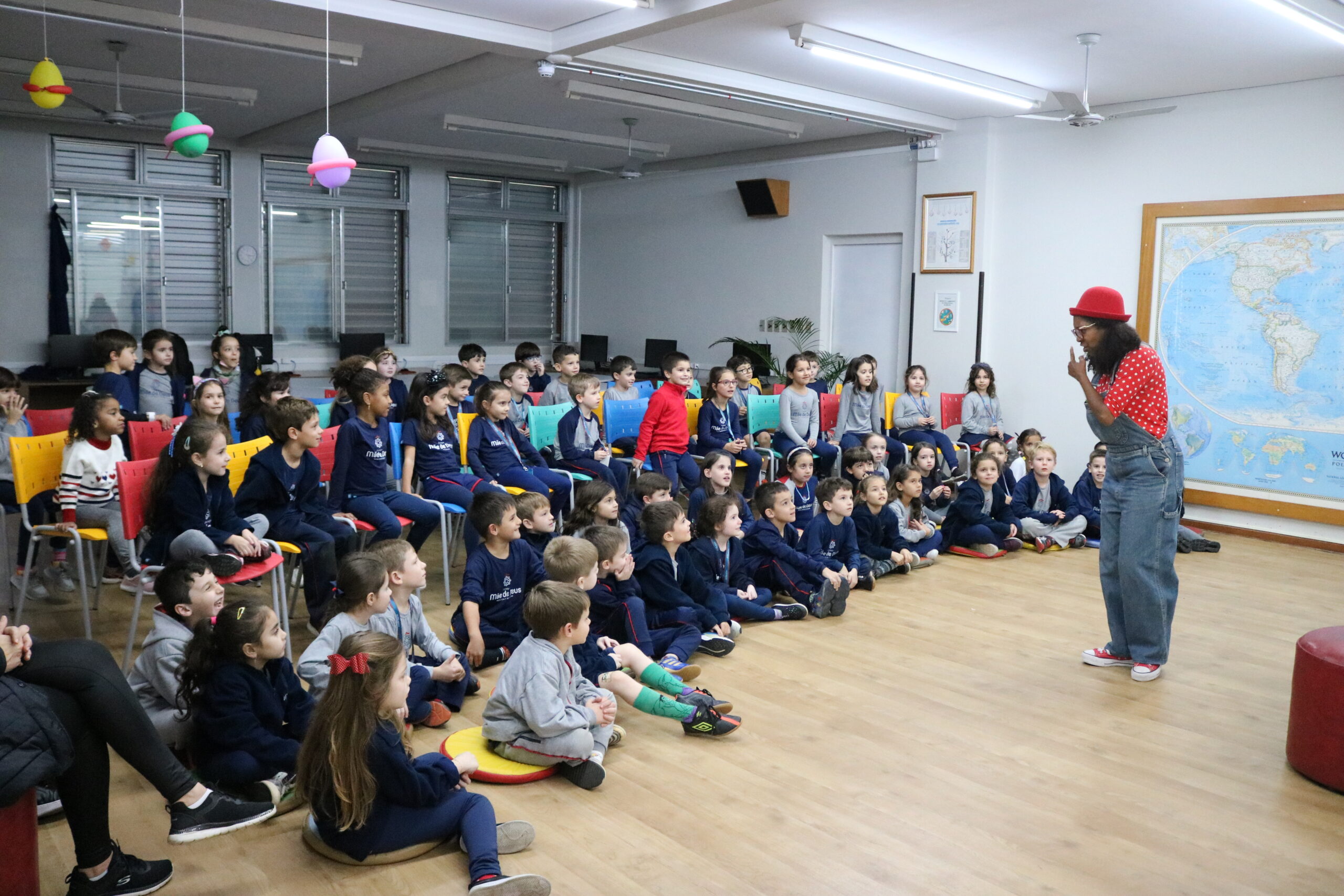Os cinco sentidos dos alunos do 1º Ano do Ensino Fundamental foram aguçados com a apresentação da contadora de histórias Carmem Lima, através da narrativa do livro: “Perdidos na mata: explorando os cinco sentidos”, de Ricardo Dreguer. Os alunos mostraram-se perceptivos, permitindo-se captar as informações do ambiente através dos sentidos da visão, audição, paladar, olfato e tato. Já na segunda contação, os alunos do 2º Ano do Ensino Fundamental viajaram pelo “Espaço”. A artista envolveu os estudantes em um universo de conhecimento e curiosidades.