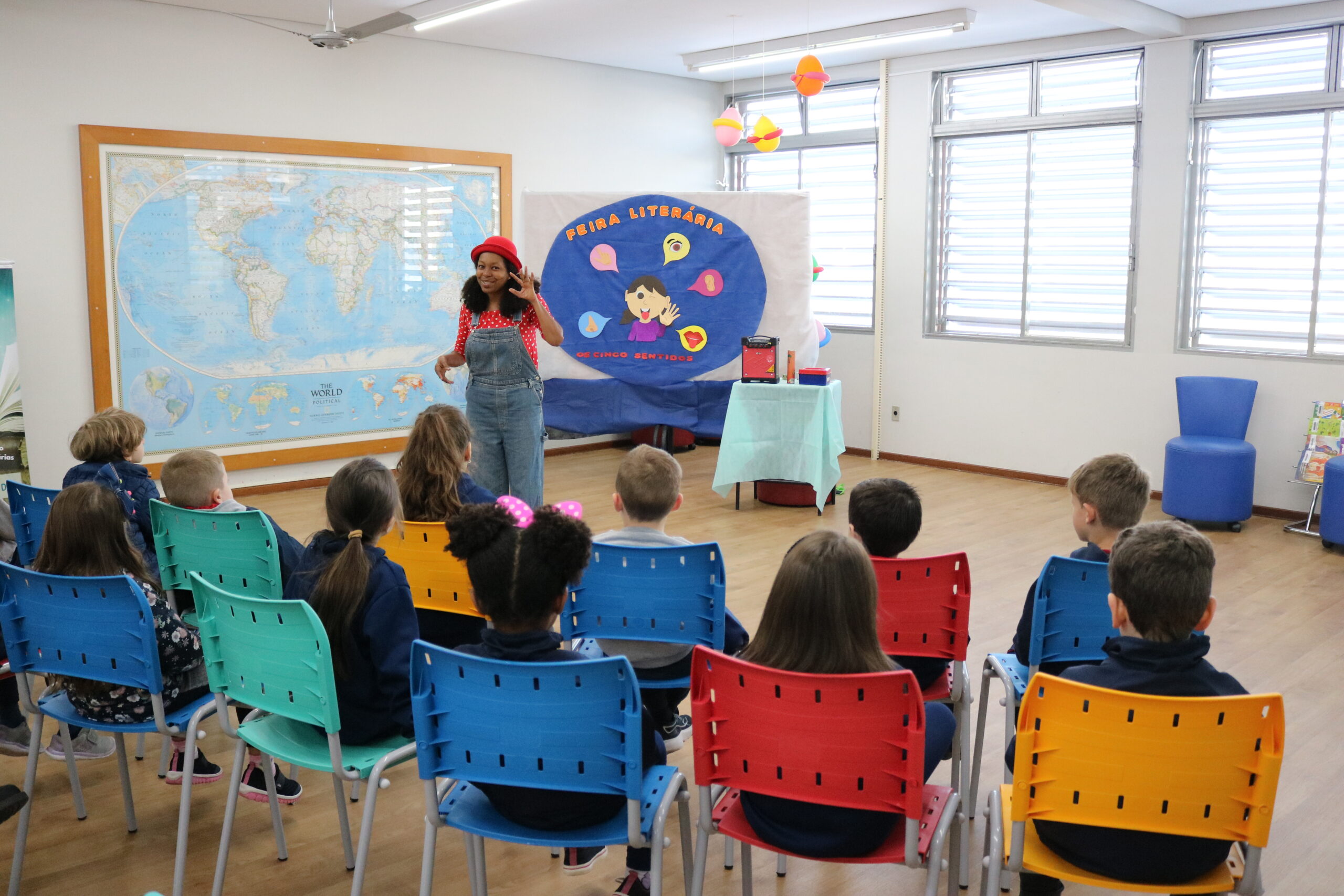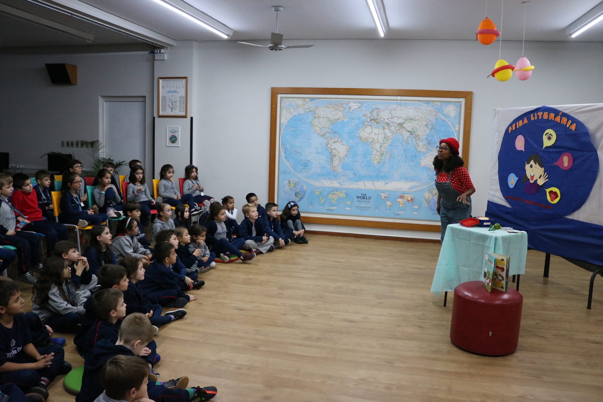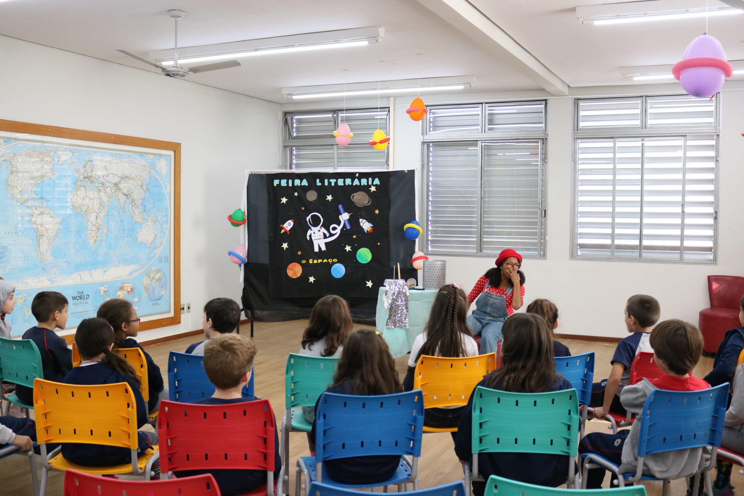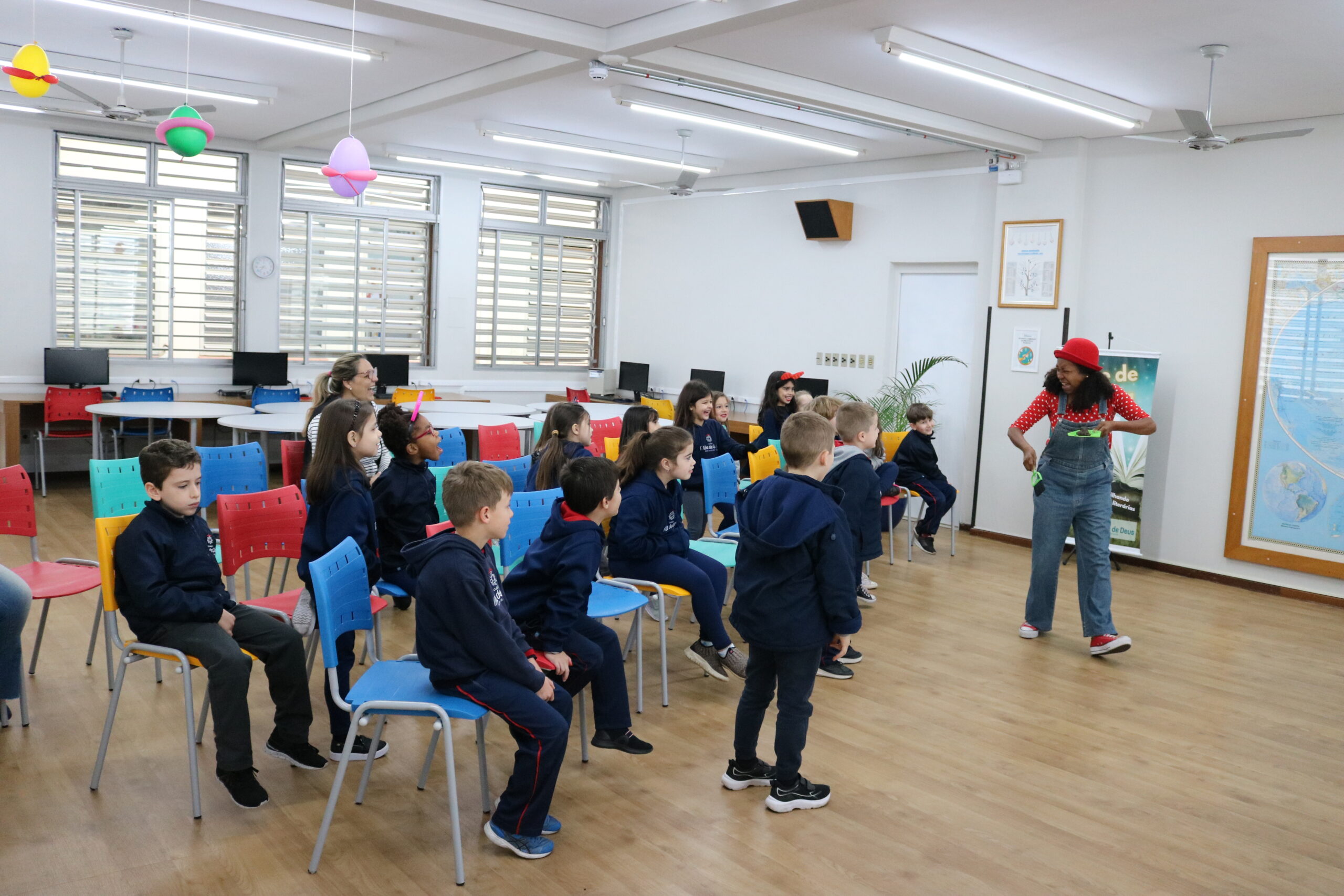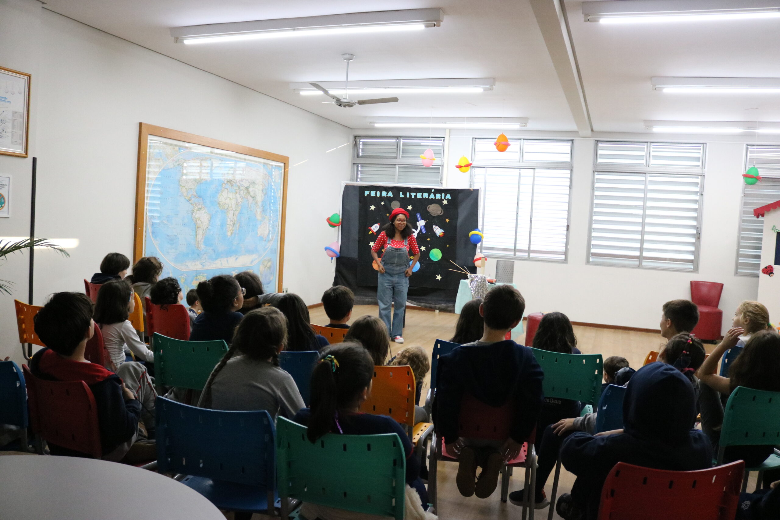 Os cinco sentidos dos alunos do 1º Ano do Ensino Fundamental foram aguçados com a apresentação da contadora de histórias Carmem Lima, através da narrativa do livro: “Perdidos na mata: explorando os cinco sentidos”, de Ricardo Dreguer. Os alunos mostraram-se perceptivos, permitindo-se captar as informações do ambiente através dos sentidos da visão, audição, paladar, olfato e tato. Já na segunda contação, os alunos do 2º Ano do Ensino Fundamental viajaram pelo “Espaço”. A artista envolveu os estudantes em um universo de conhecimento e curiosidades.
