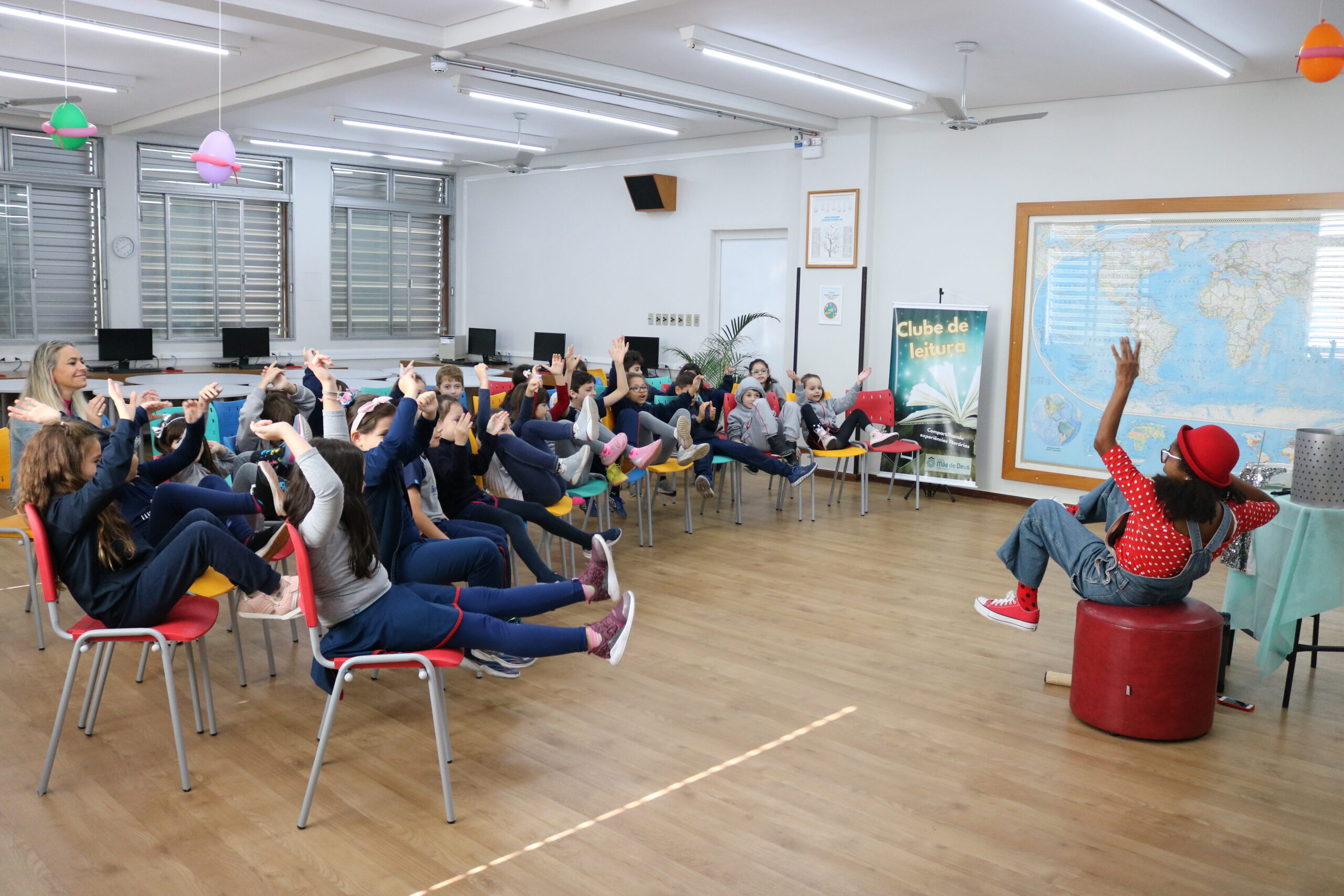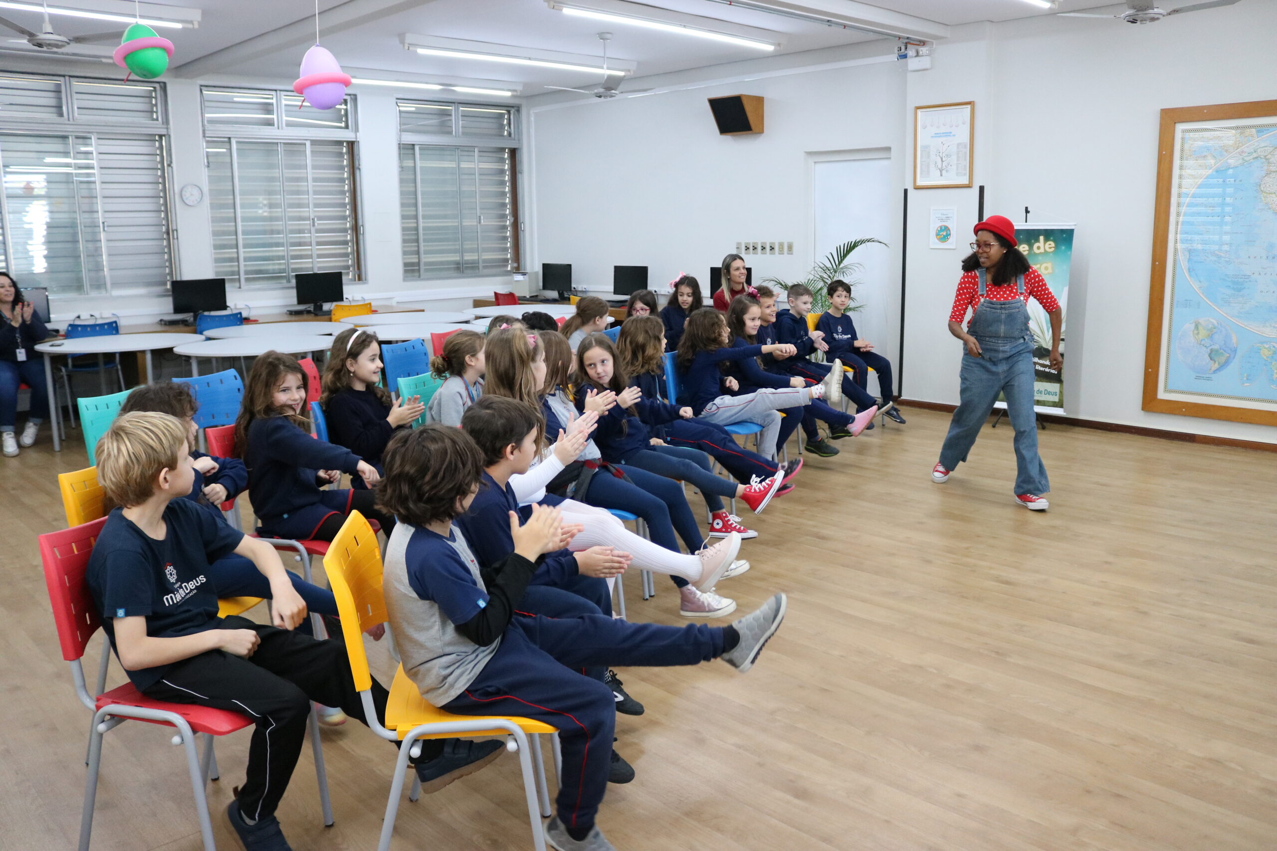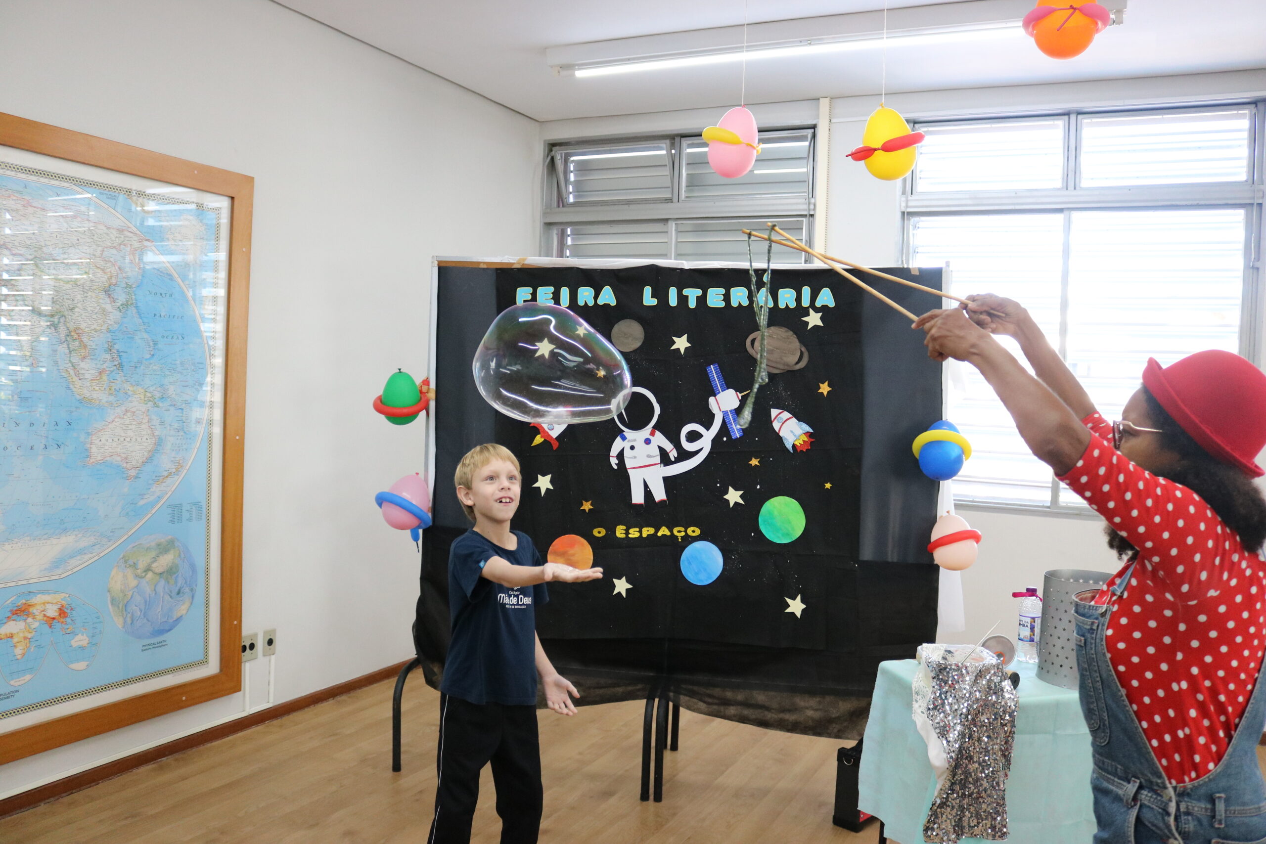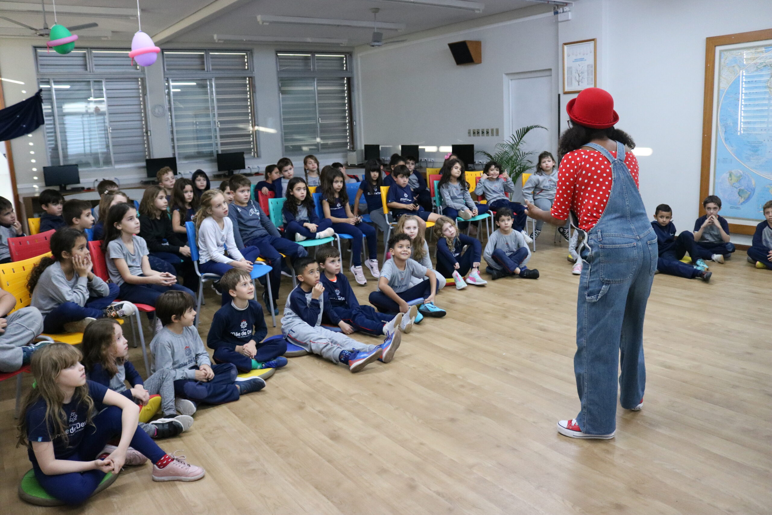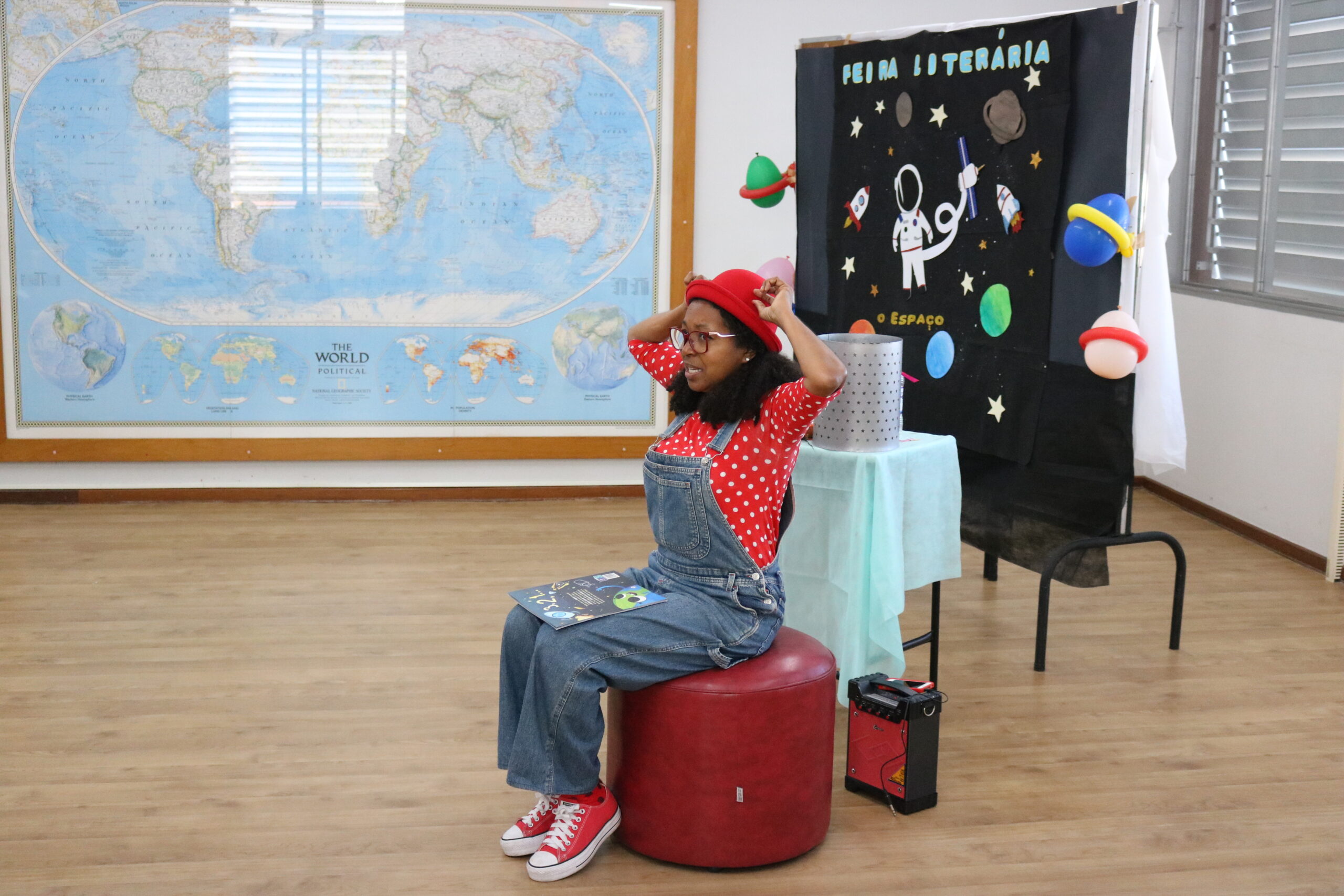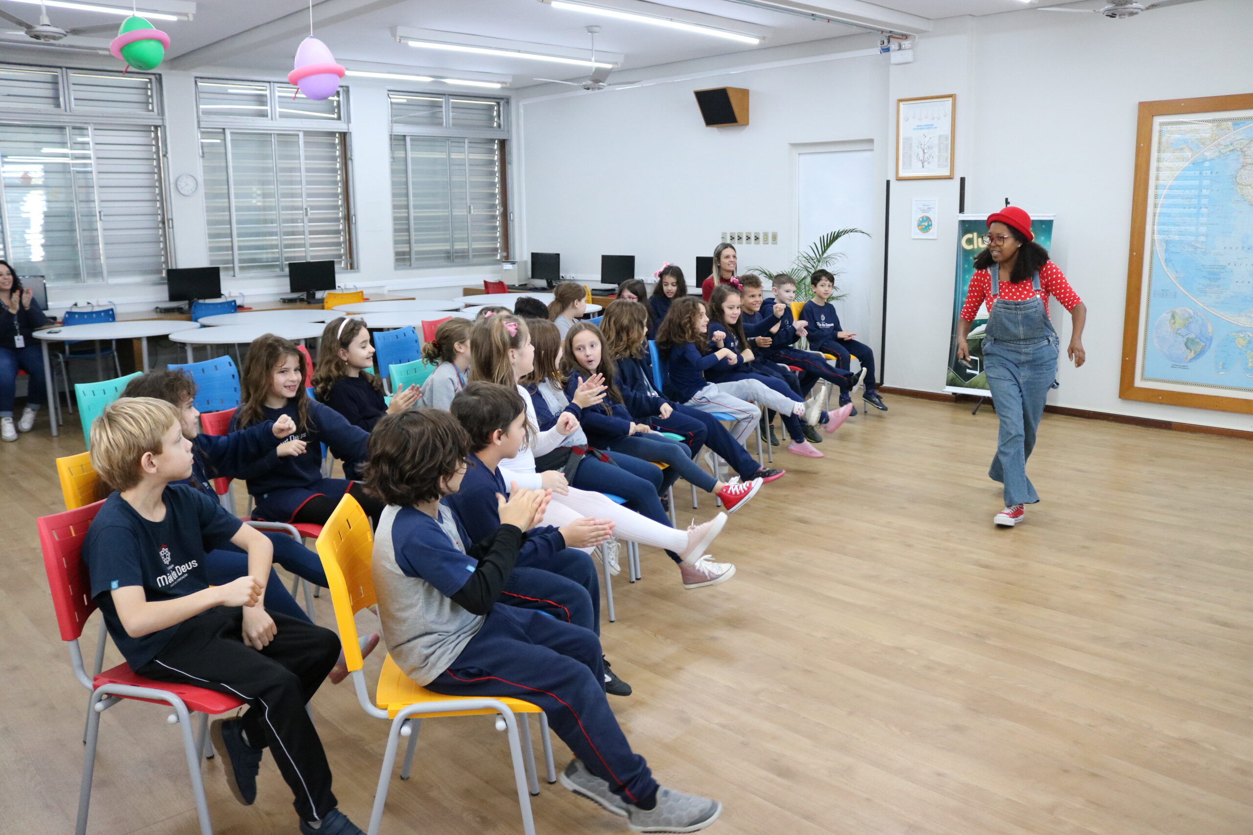 Os cinco sentidos dos alunos do 1º Ano do Ensino Fundamental foram aguçados com a apresentação da contadora de histórias Carmem Lima, através da narrativa do livro: “Perdidos na mata: explorando os cinco sentidos”, de Ricardo Dreguer. Os alunos mostraram-se perceptivos, permitindo-se captar as informações do ambiente através dos sentidos da visão, audição, paladar, olfato e tato. Já na segunda contação, os alunos do 2º Ano do Ensino Fundamental viajaram pelo “Espaço”. A artista envolveu os estudantes em um universo de conhecimento e curiosidades.