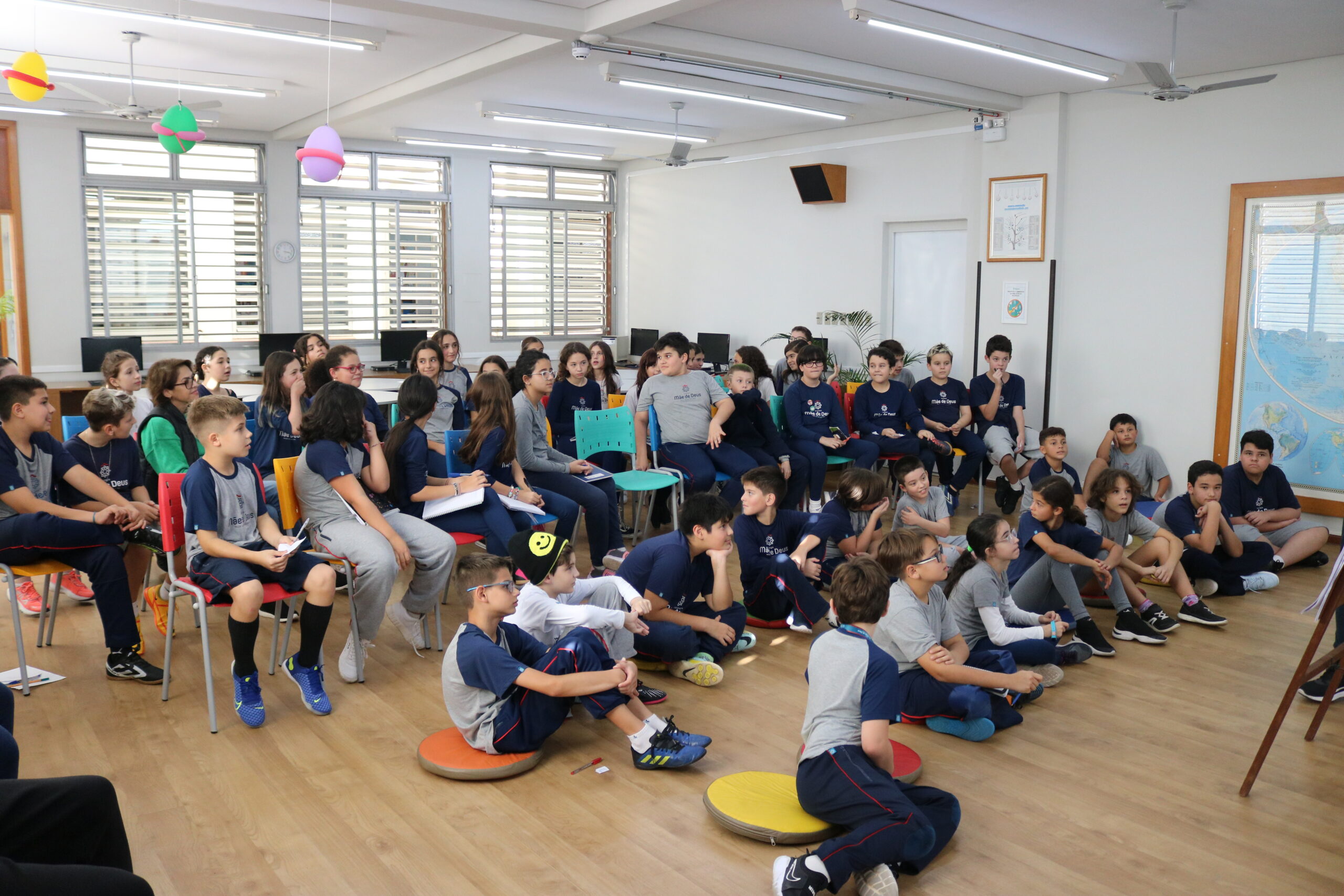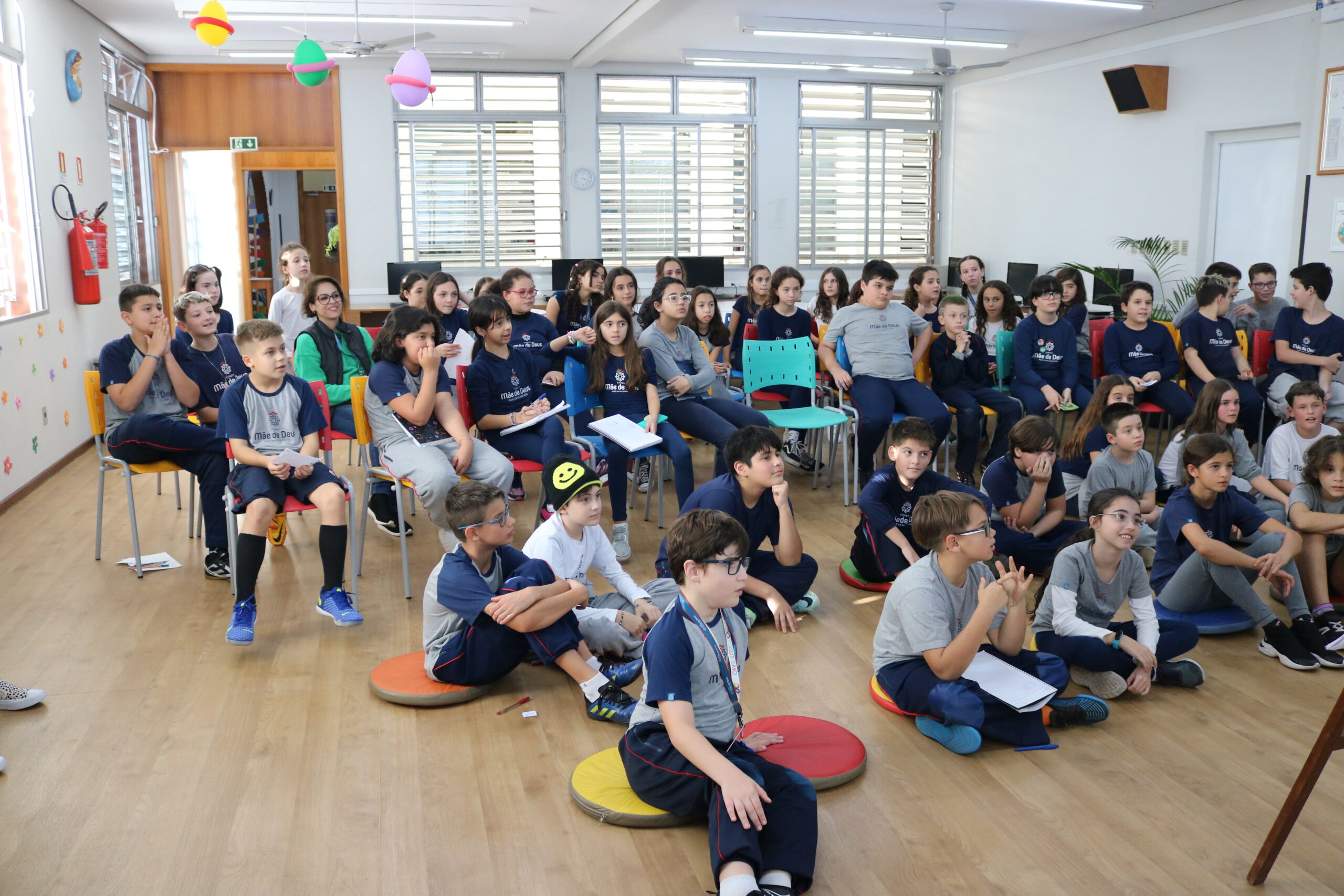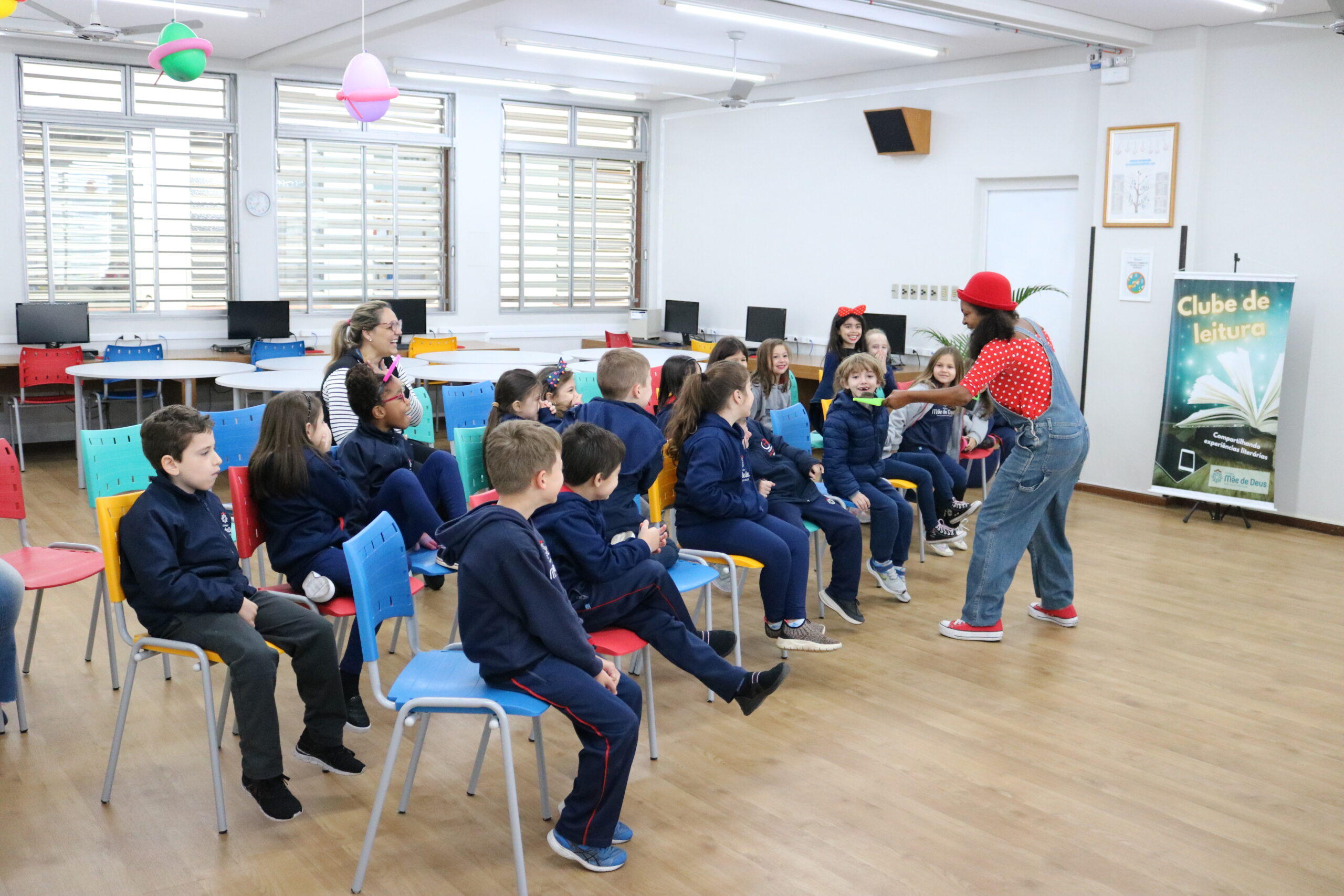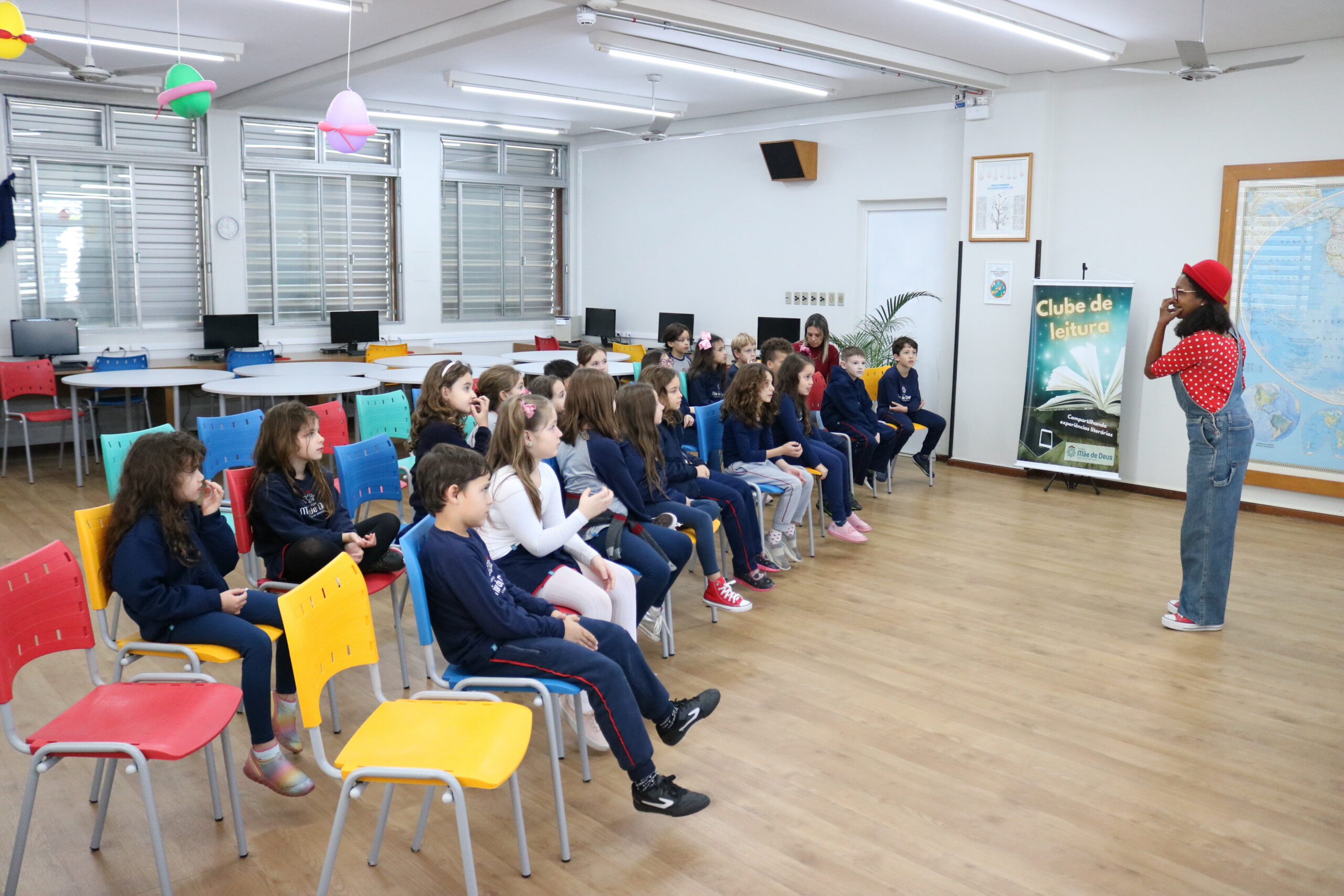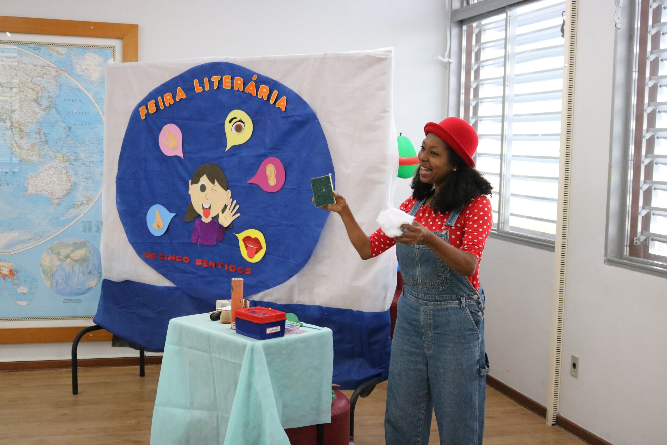 Os cinco sentidos dos alunos do 1º Ano do Ensino Fundamental foram aguçados com a apresentação da contadora de histórias Carmem Lima, através da narrativa do livro: “Perdidos na mata: explorando os cinco sentidos”, de Ricardo Dreguer. Os alunos mostraram-se perceptivos, permitindo-se captar as informações do ambiente através dos sentidos da visão, audição, paladar, olfato e tato. Já na segunda contação, os alunos do 2º Ano do Ensino Fundamental viajaram pelo “Espaço”. A artista envolveu os estudantes em um universo de conhecimento e curiosidades.