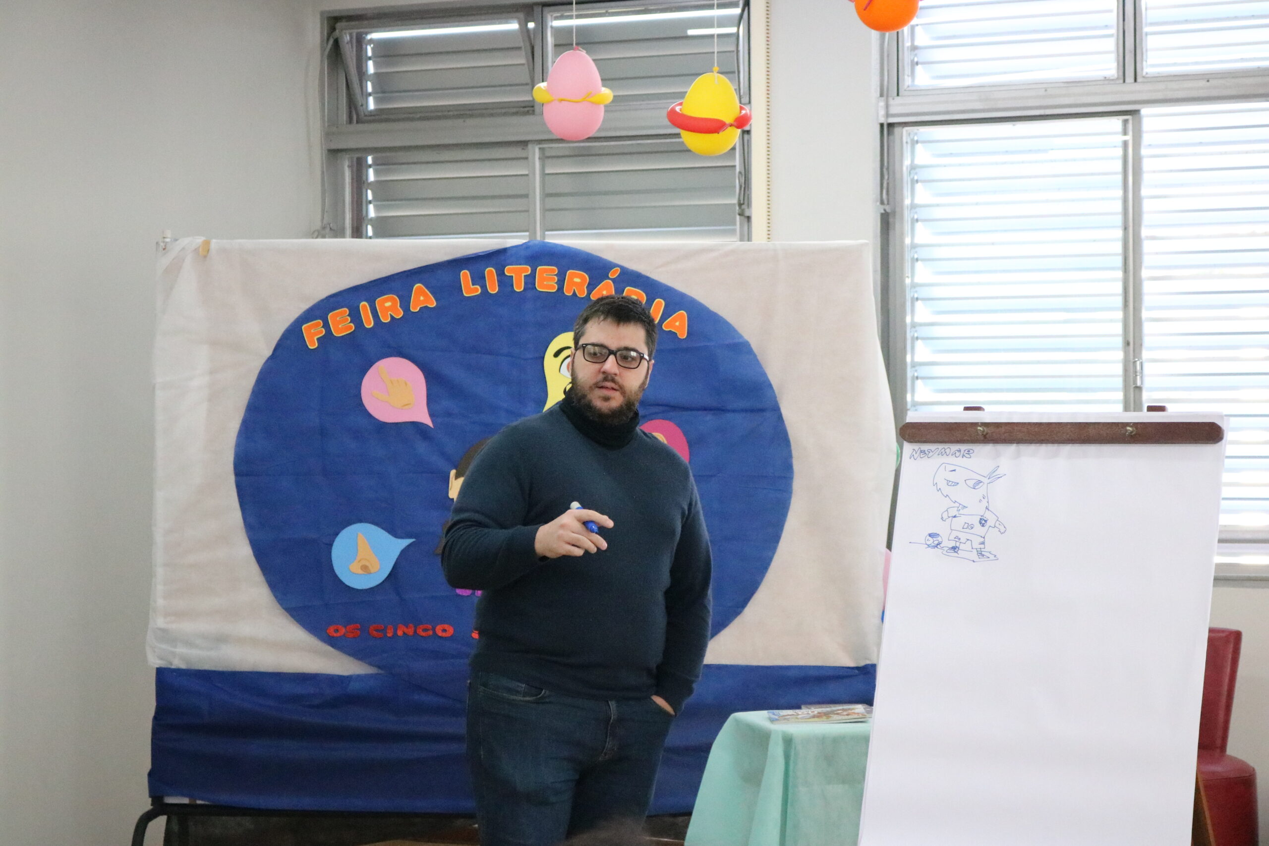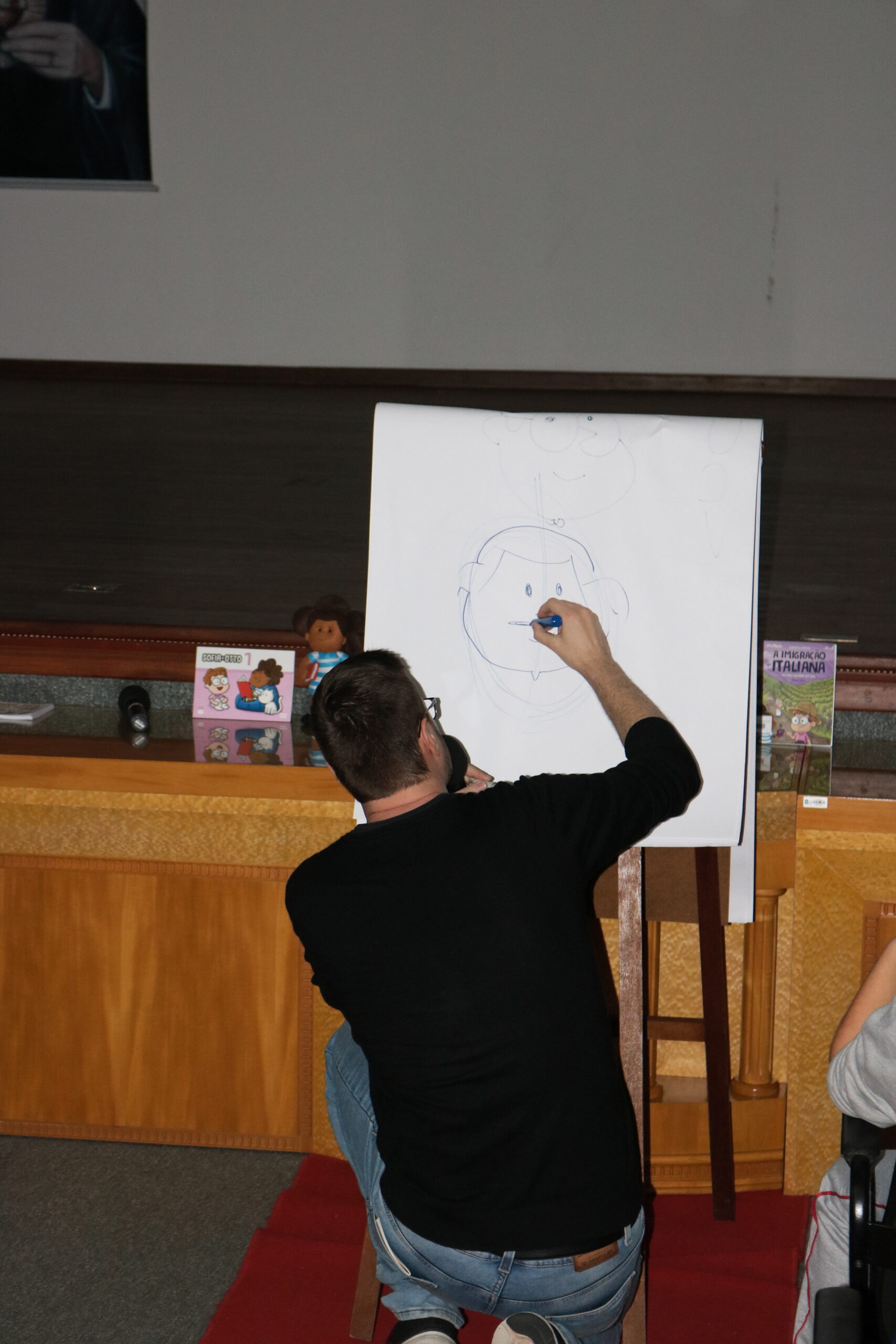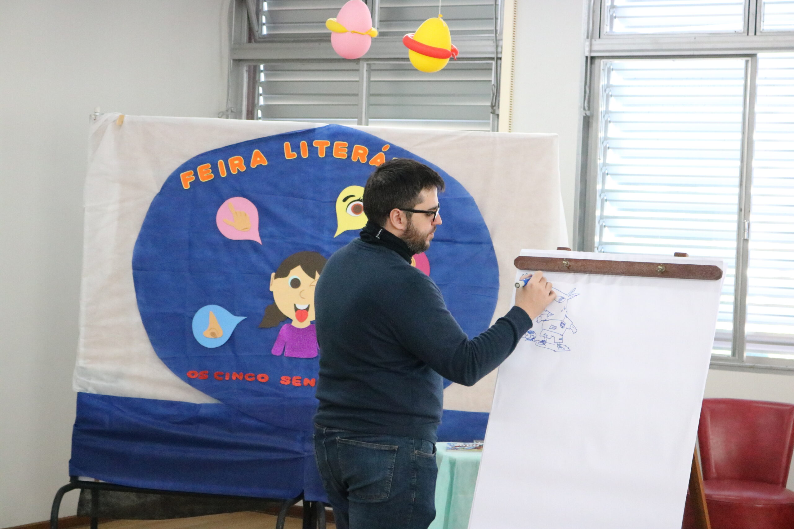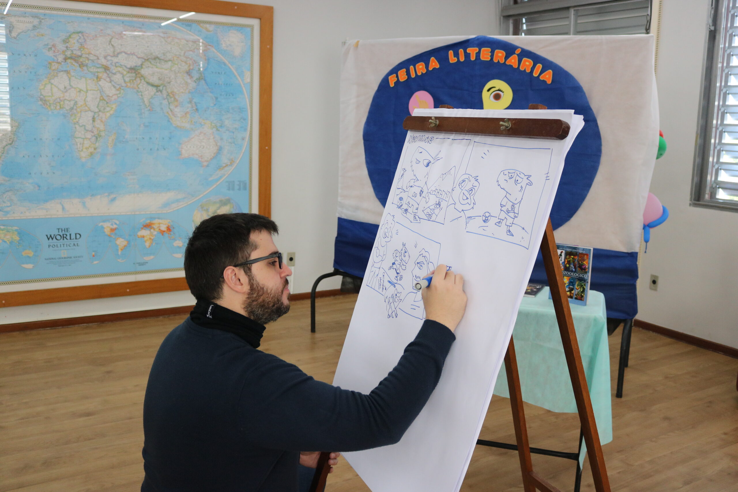 No último dia de Feira, os alunos do 5º Ano do Ensino Fundamental tiveram a satisfação de participar do encontro com o talentoso escritor e ilustrador, Carlos Augusto Pessoas de Brum, conhecido como “Cadu dos Livros”. Com desenhos criativos, as histórias em quadrinhos foram tomando forma, a partir da contribuição ativa dos alunos as histórias criadas iam dialogando com o imaginário dos leitores.