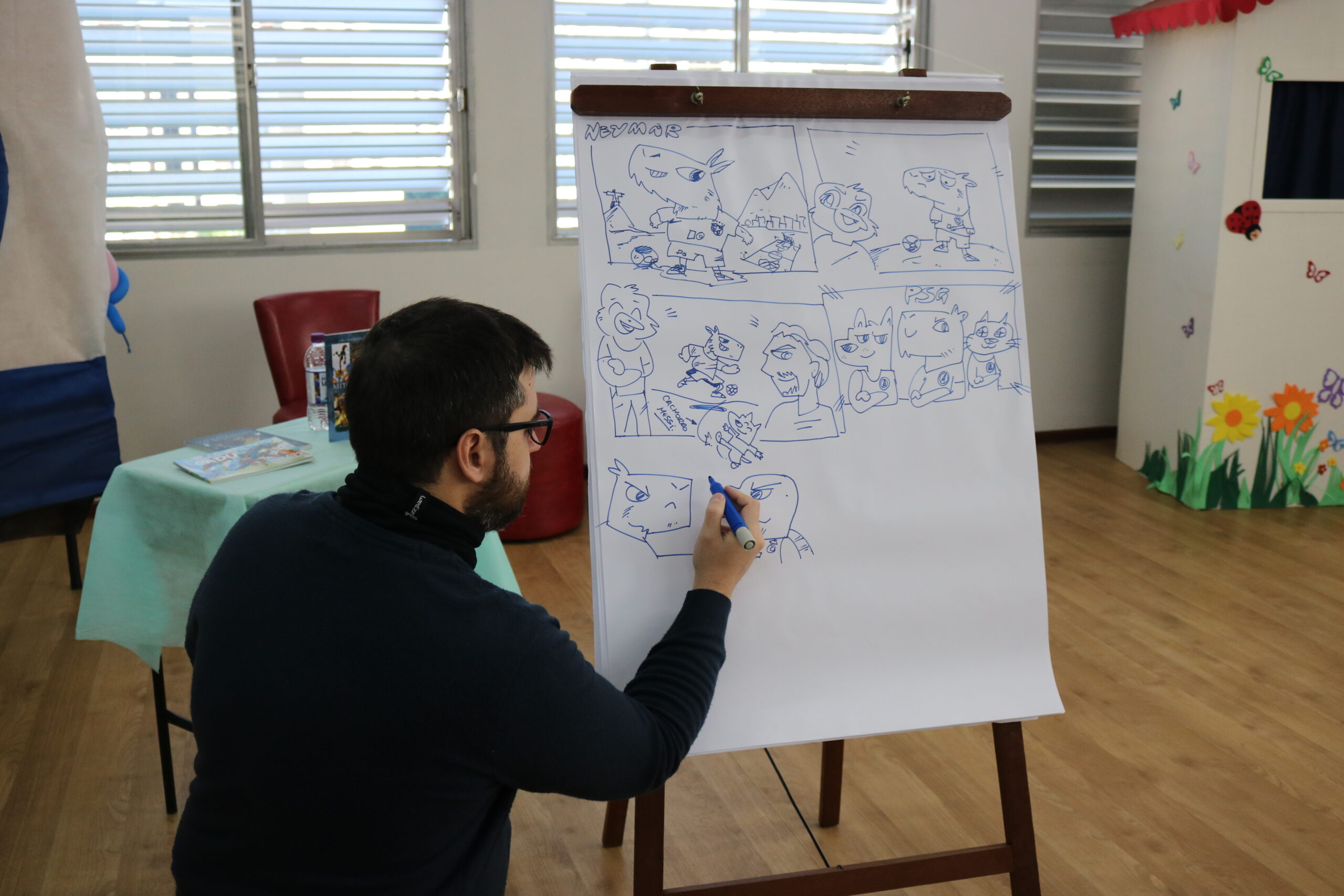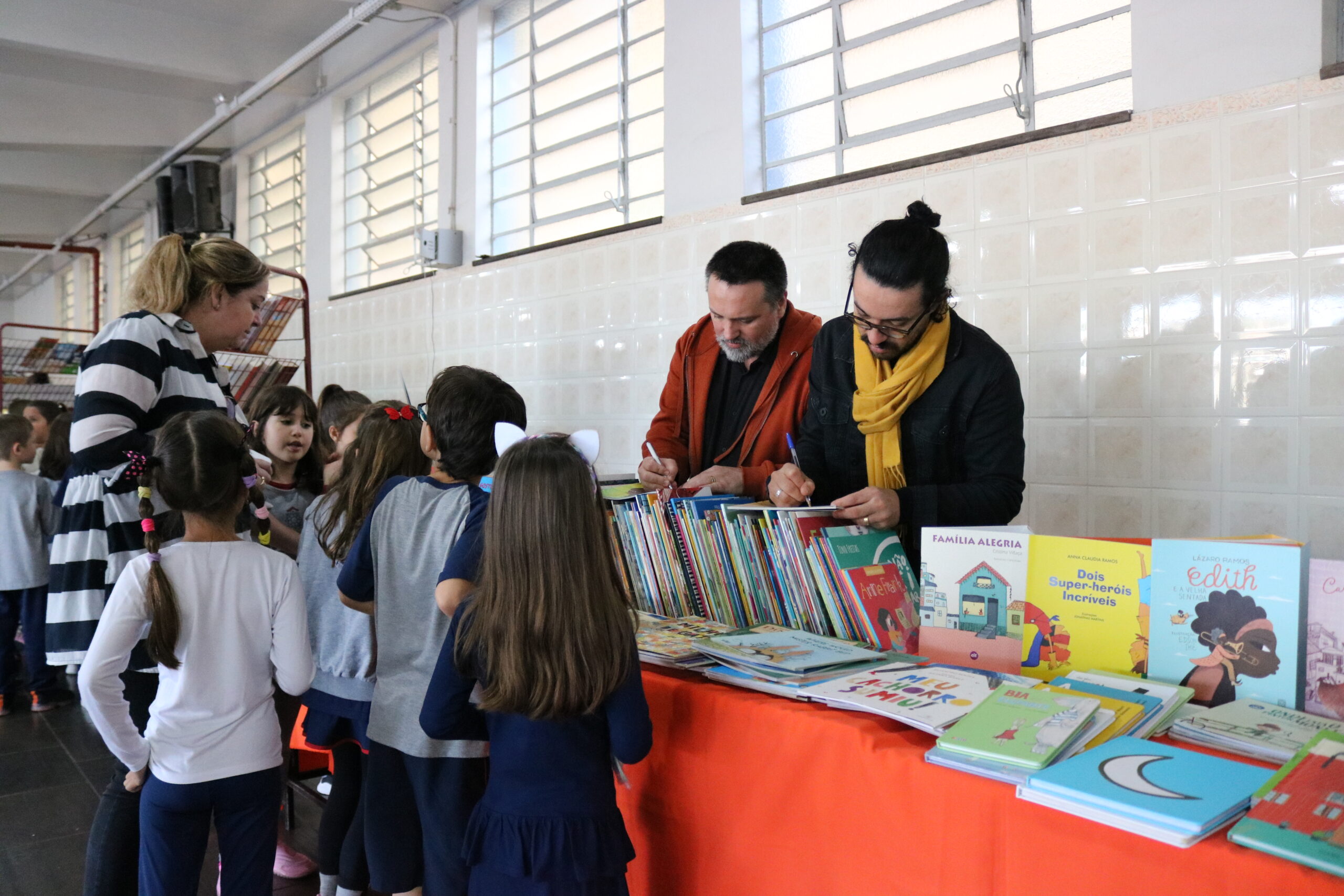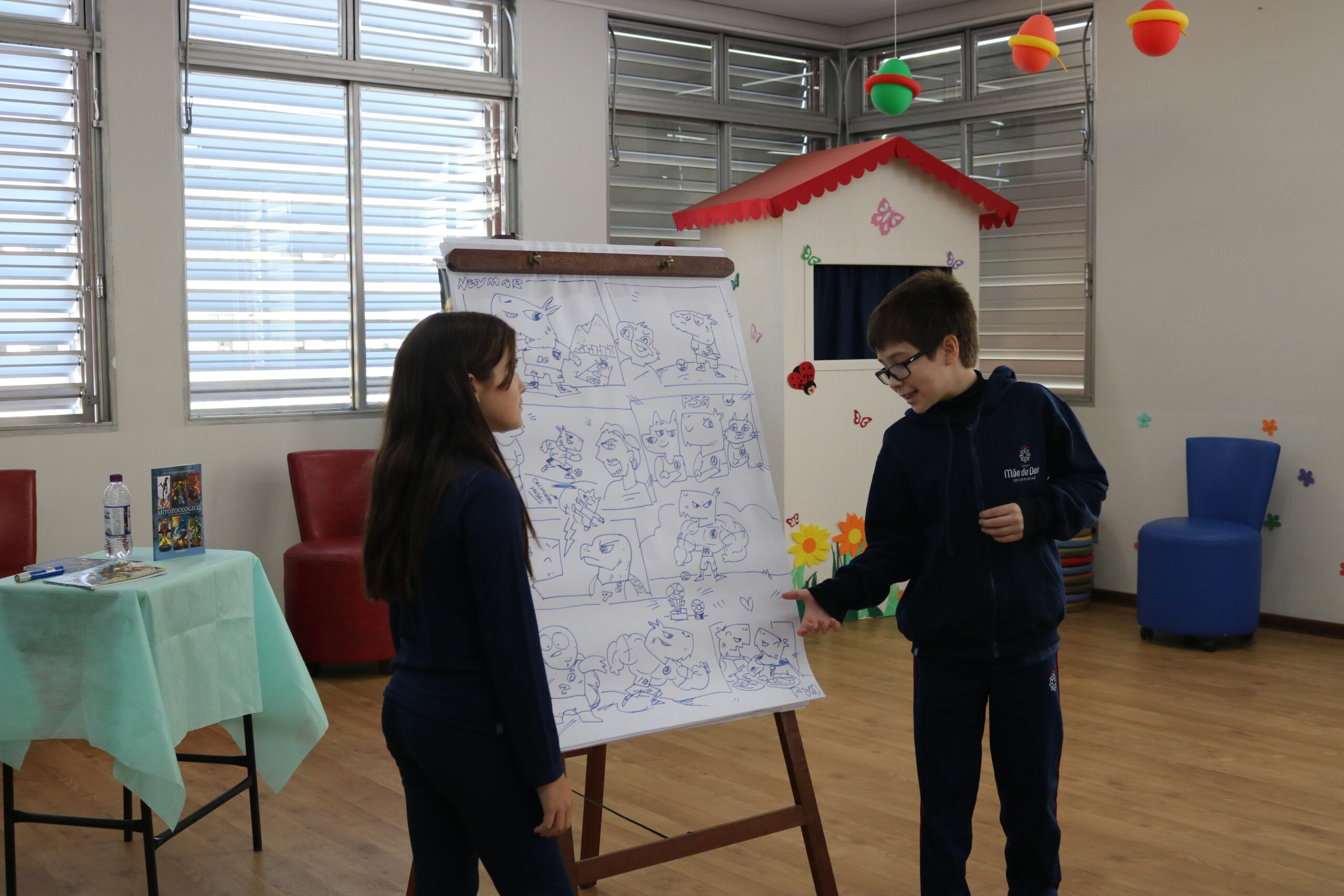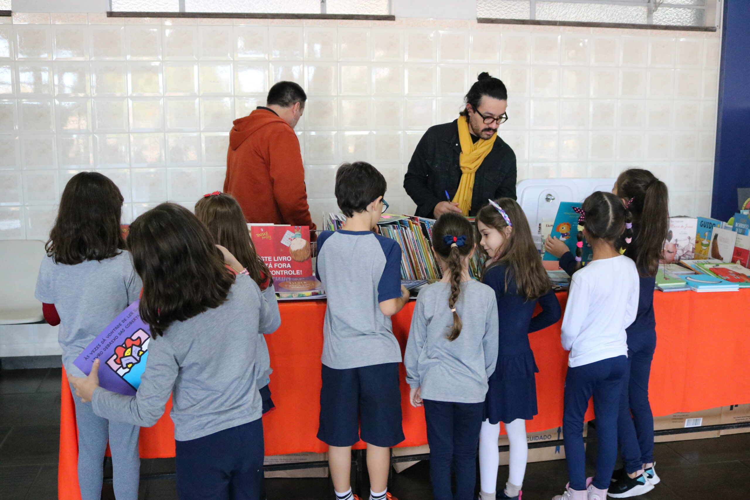No último dia de Feira, os alunos do 5º Ano do Ensino Fundamental tiveram a satisfação de participar do encontro com o talentoso escritor e ilustrador, Carlos Augusto Pessoas de Brum, conhecido como “Cadu dos Livros”. Com desenhos criativos, as histórias em quadrinhos foram tomando forma, a partir da contribuição ativa dos alunos as histórias criadas iam dialogando com o imaginário dos leitores.