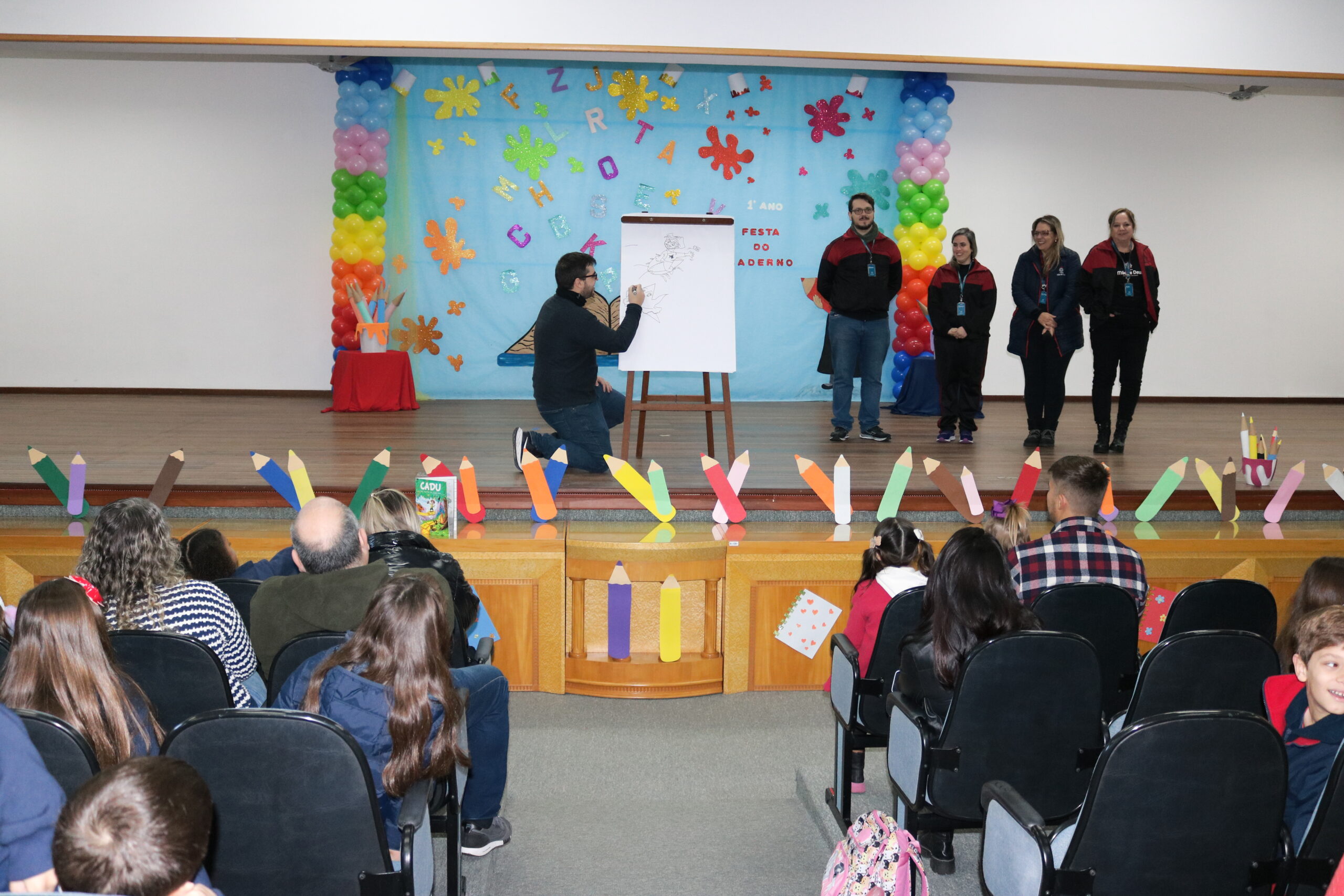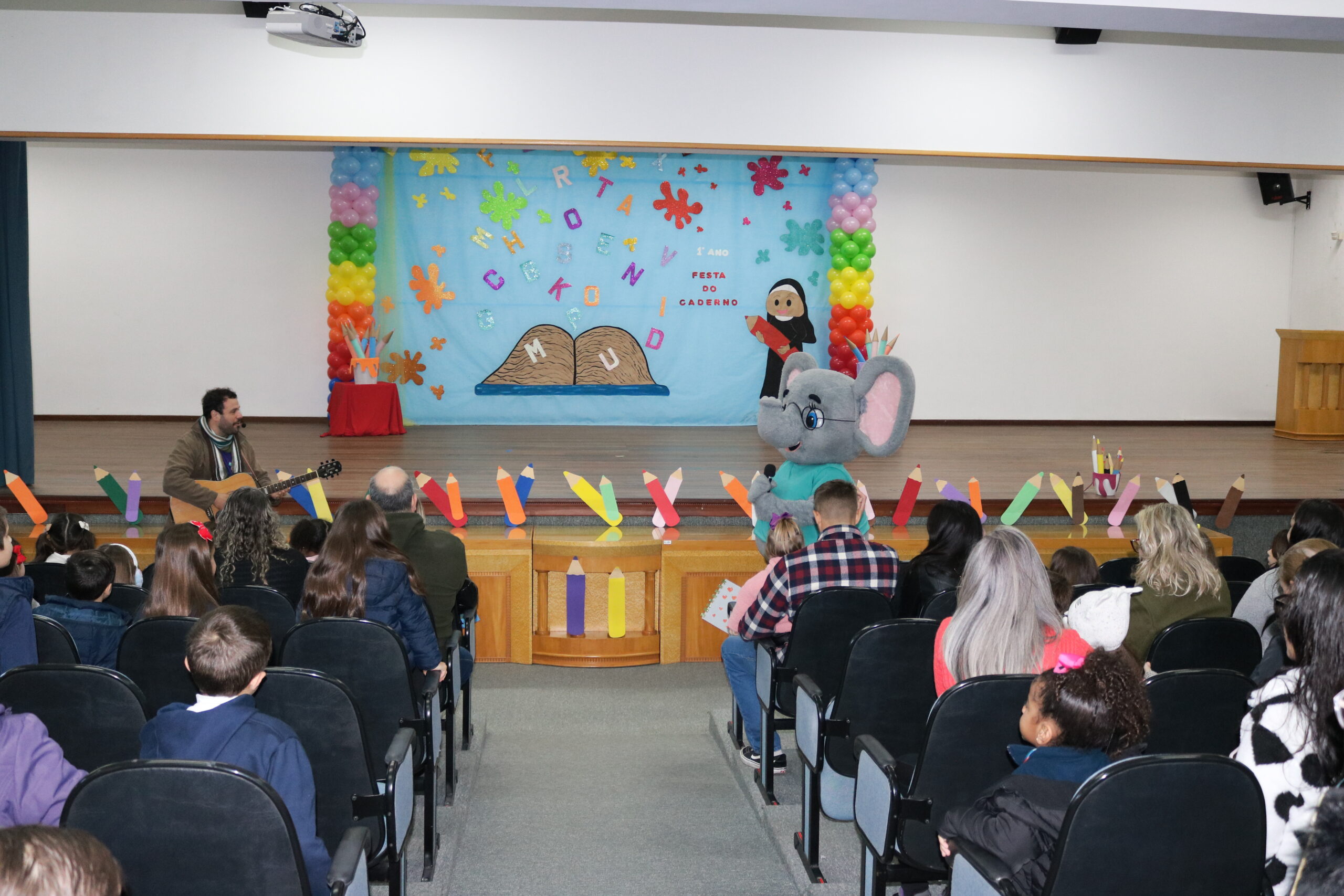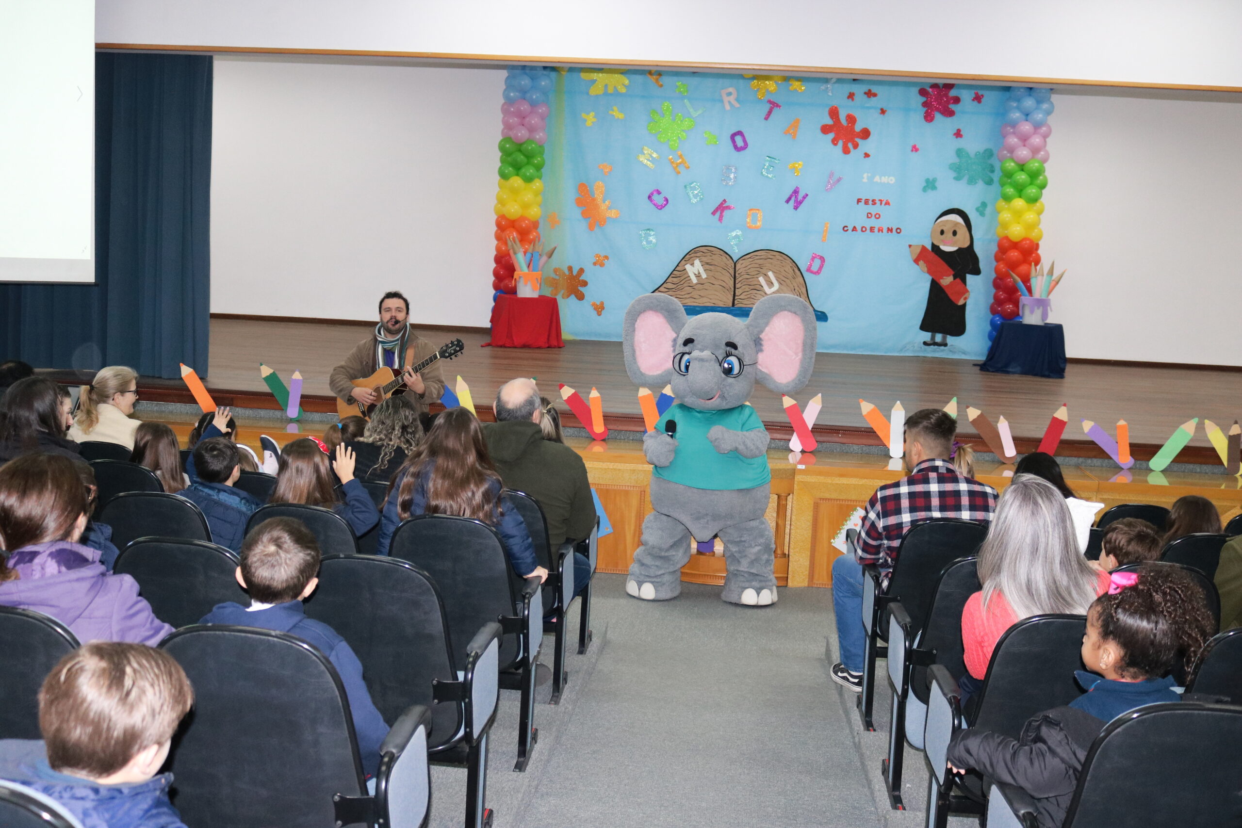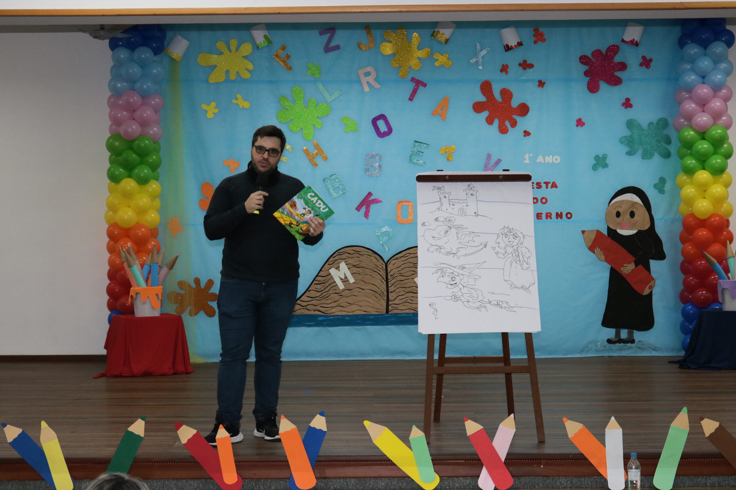 A Diretora do Colégio, a Ir. Sueli Gonzatti, realizou a abertura do evento, com palavras de acolhimento e um momento de oração. Após isso, o Sr. Elefante chegou para animar o público, com músicas, danças e muita alegria. Para fechar esse primeiro momento, recebemos o escritor e ilustrador “Cadu”, que contou uma história muito especial aos nossos alunos e criou um desenho personalizado com as ideias dos professores do 1 Ano.
