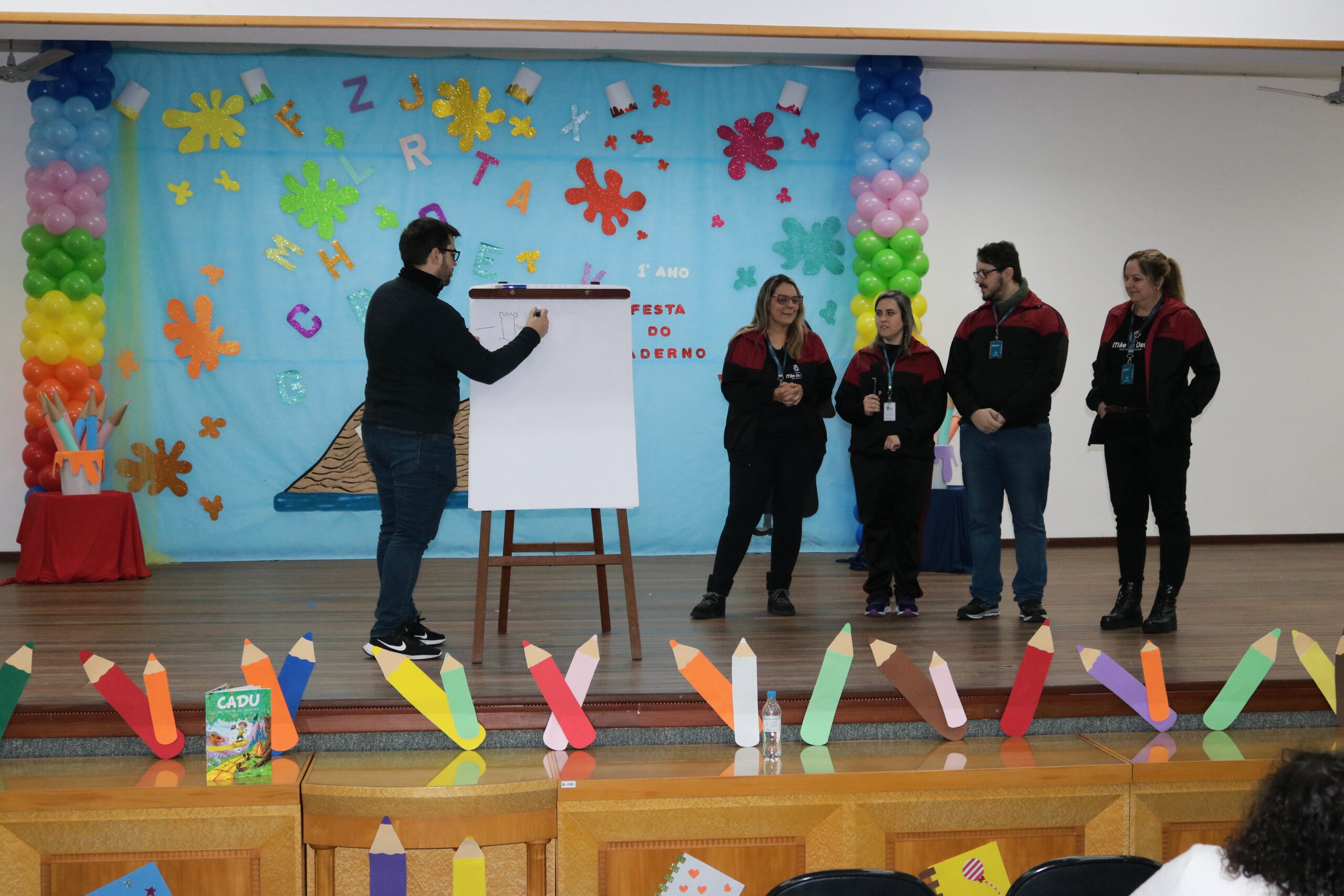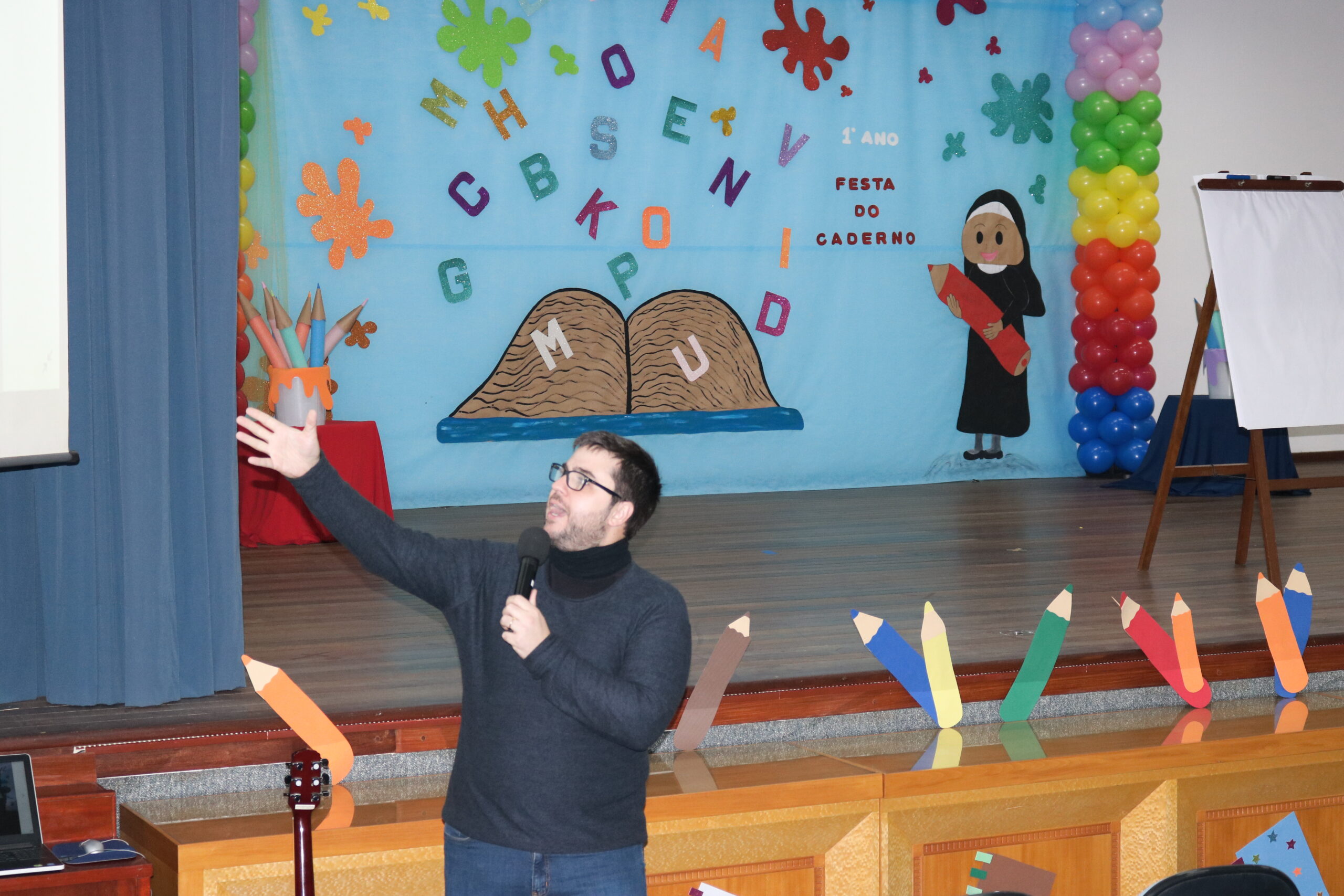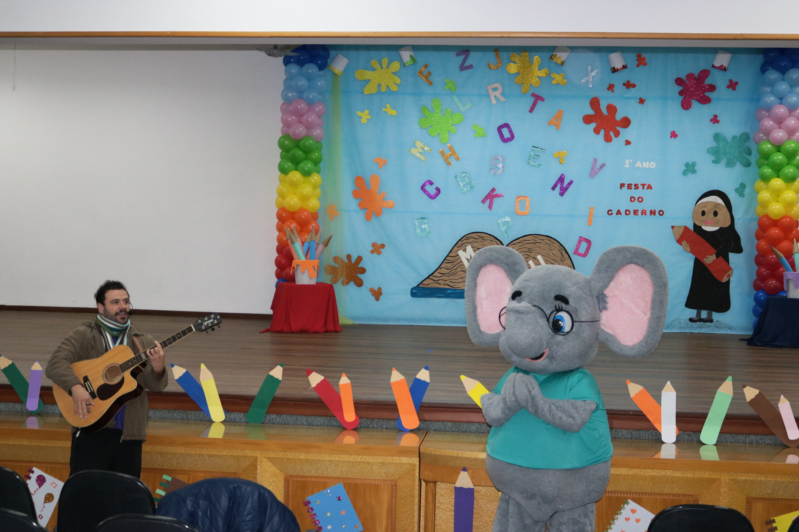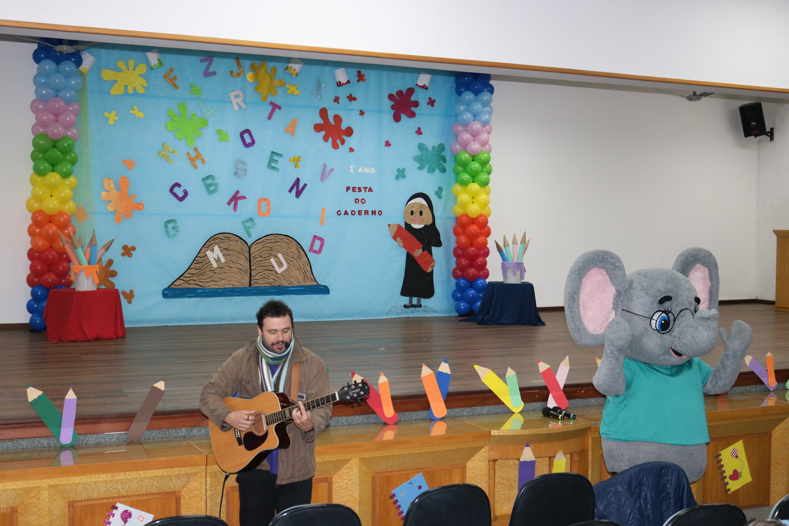 A Diretora do Colégio, a Ir. Sueli Gonzatti, realizou a abertura do evento, com palavras de acolhimento e um momento de oração. Após isso, o Sr. Elefante chegou para animar o público, com músicas, danças e muita alegria. Para fechar esse primeiro momento, recebemos o escritor e ilustrador “Cadu”, que contou uma história muito especial aos nossos alunos e criou um desenho personalizado com as ideias dos professores do 1 Ano.
