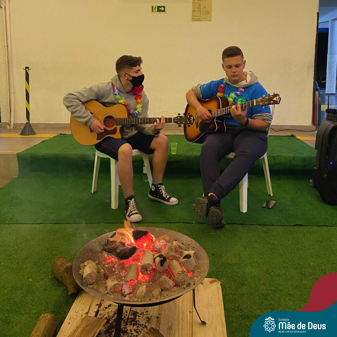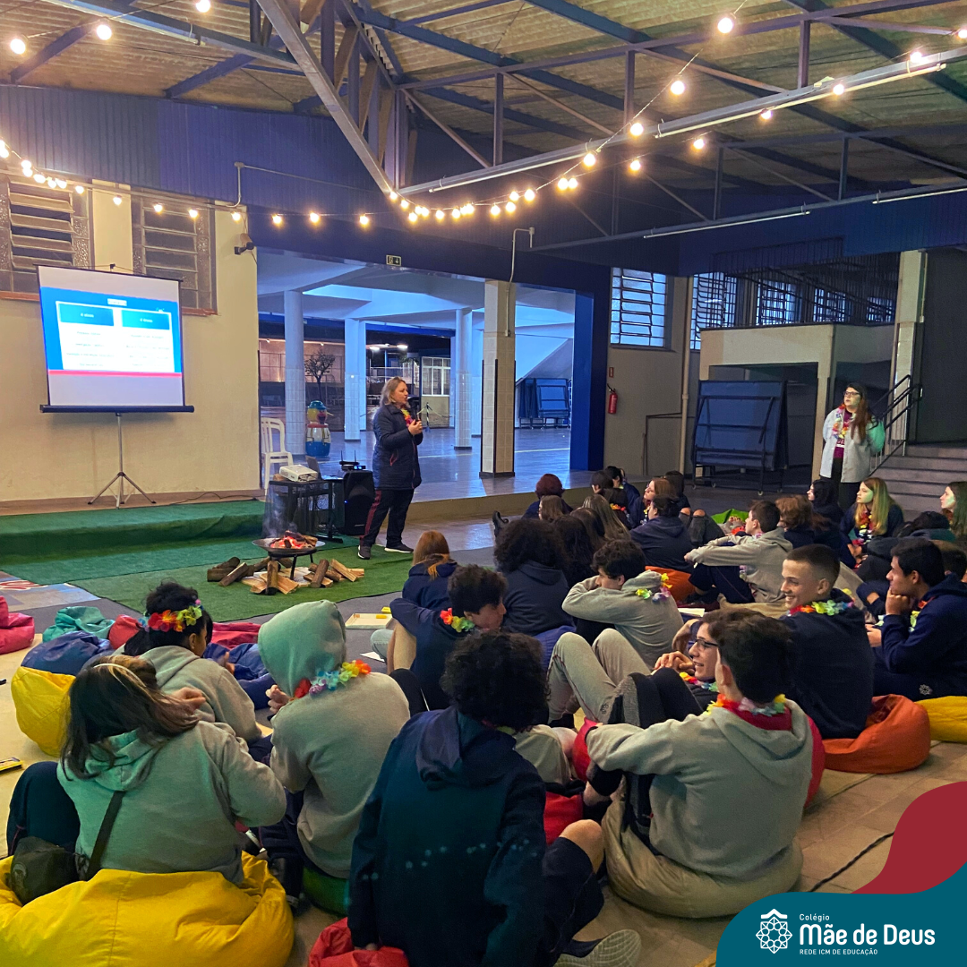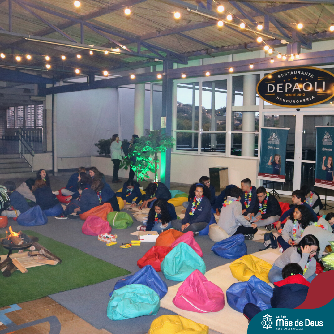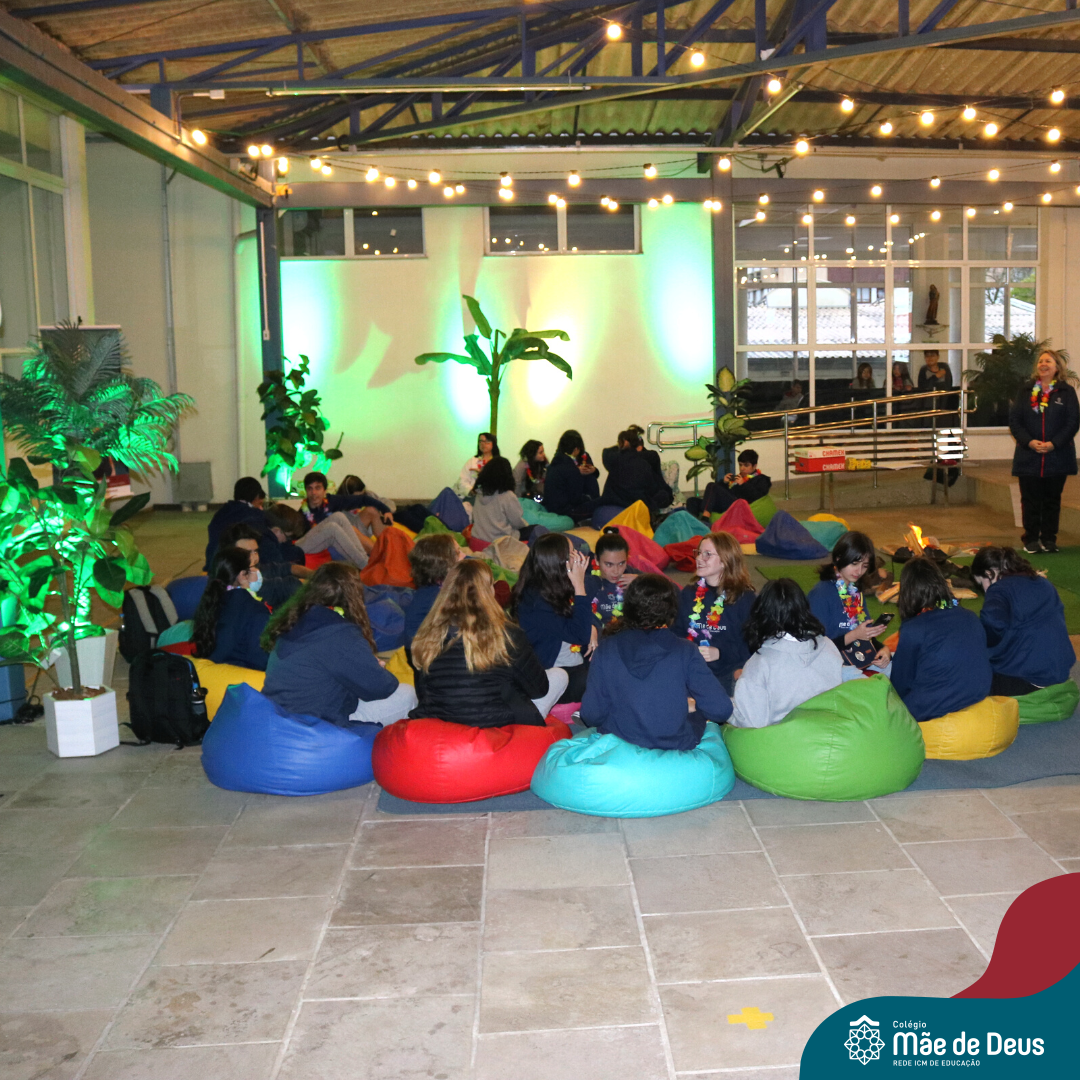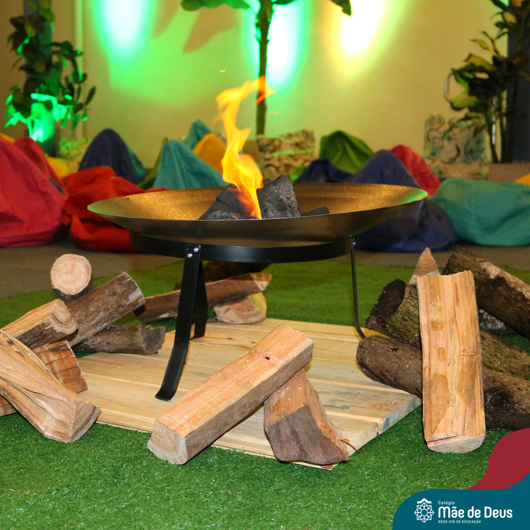 O cenário foi montado com luzes coloridas, plantas, fogueira e puffs, cada detalhe pensado com muito carinho para receber os nossos alunos.