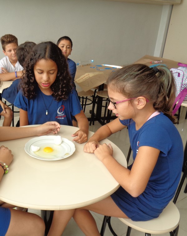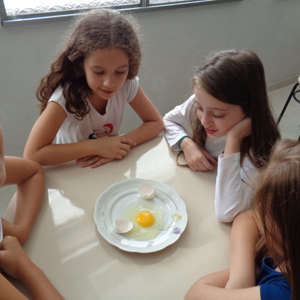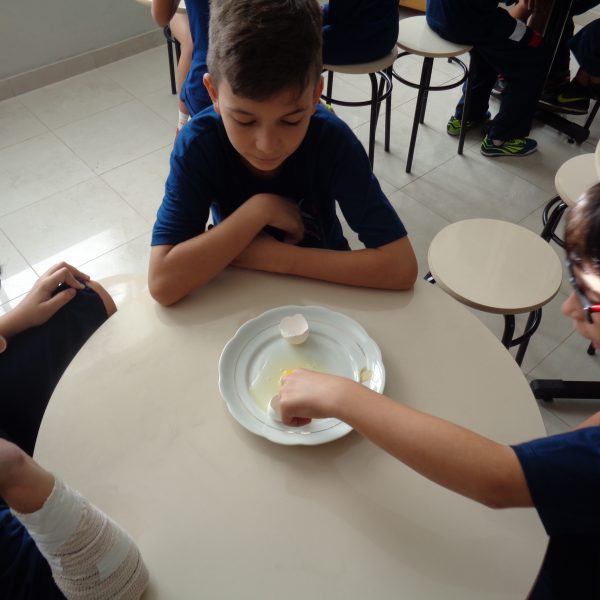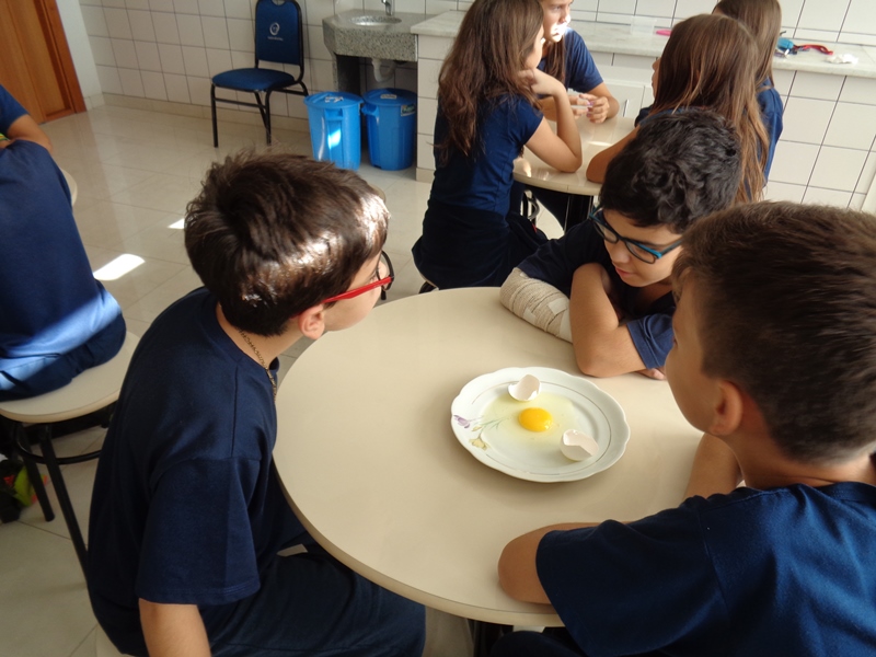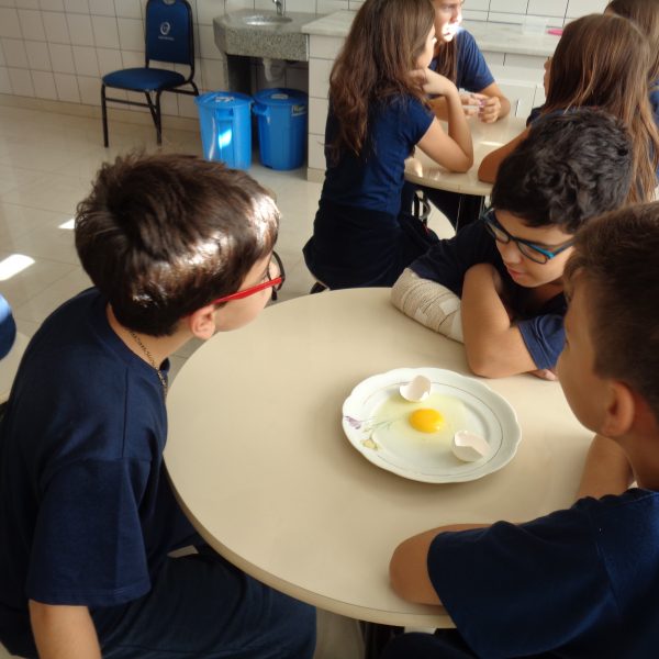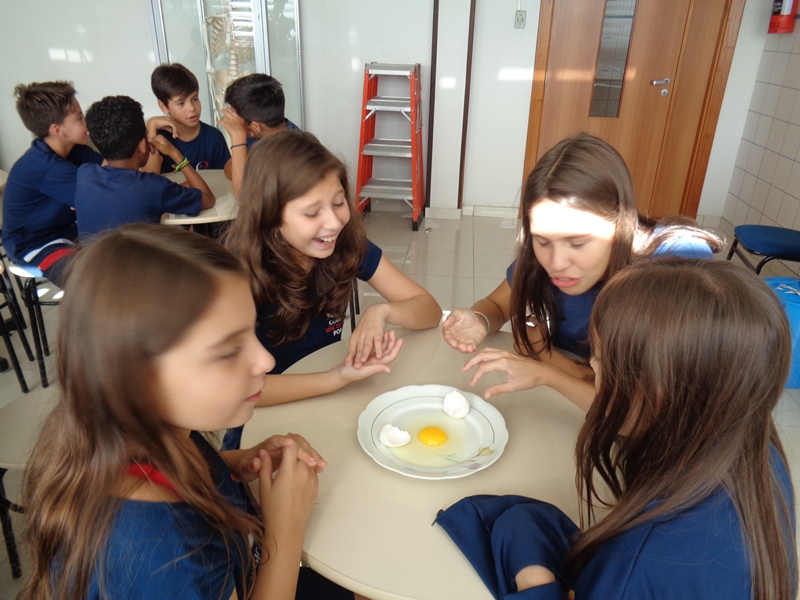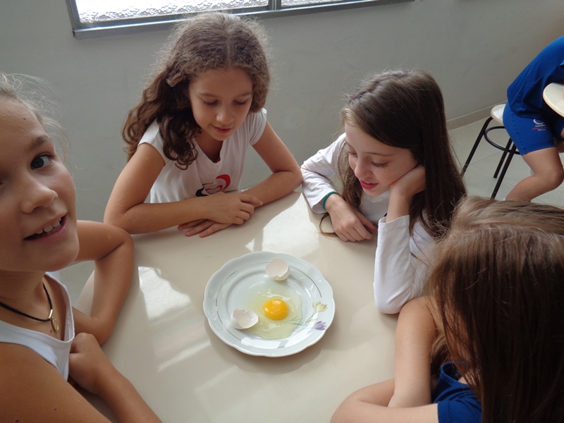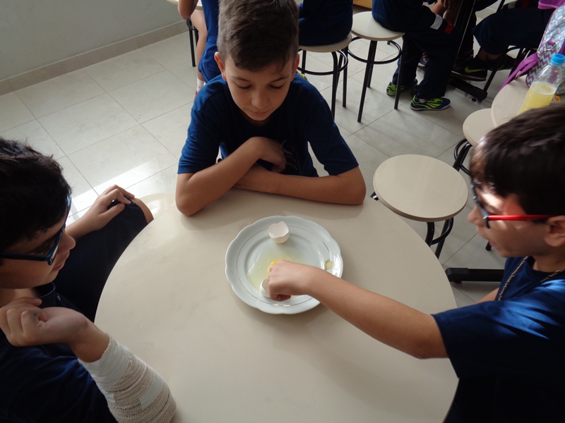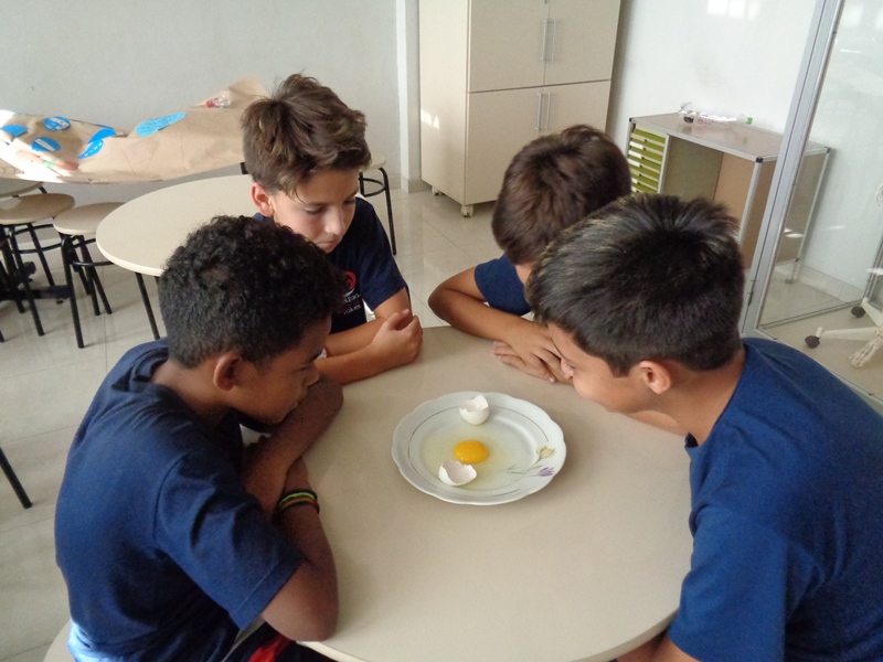 Os alunos observaram o ovo de galinha, a fim de identificar as partes da célula, objetos de estudo do 5º ano: membrana plasmática, citoplasma e núcleo.