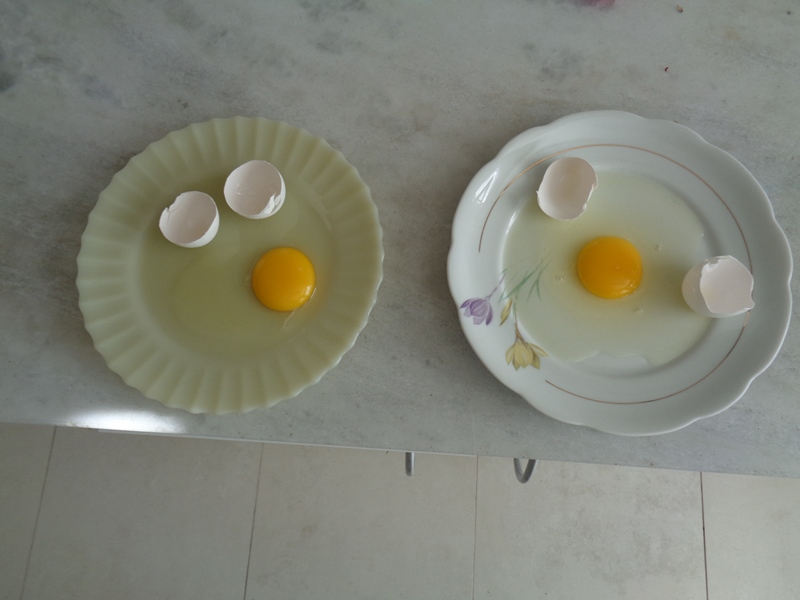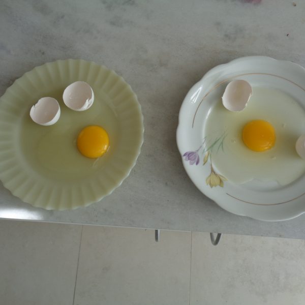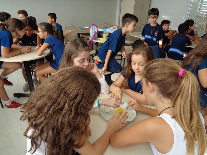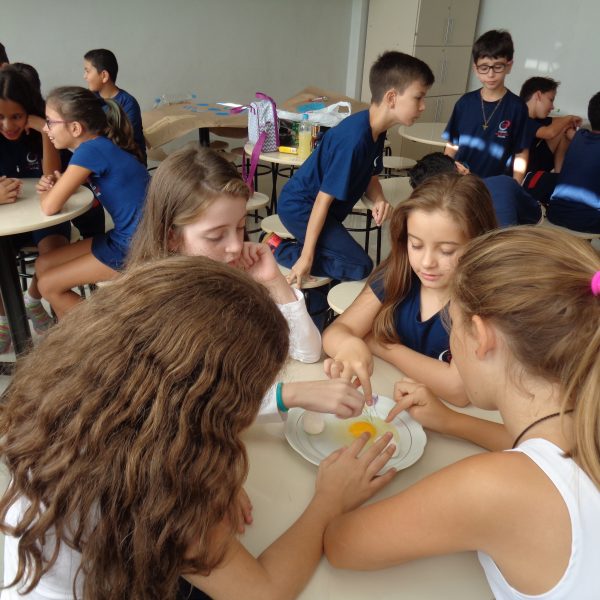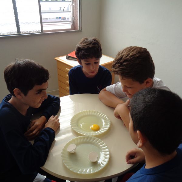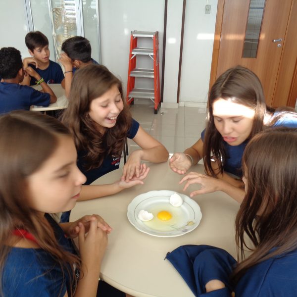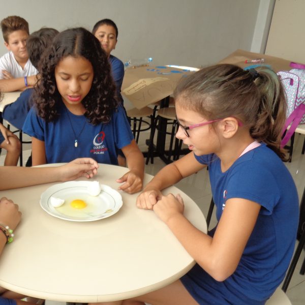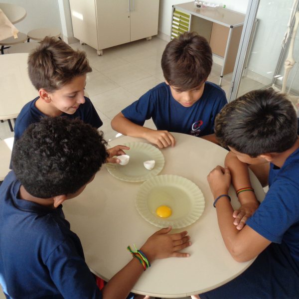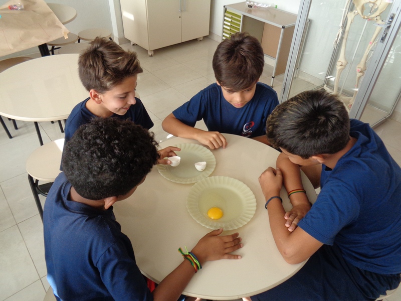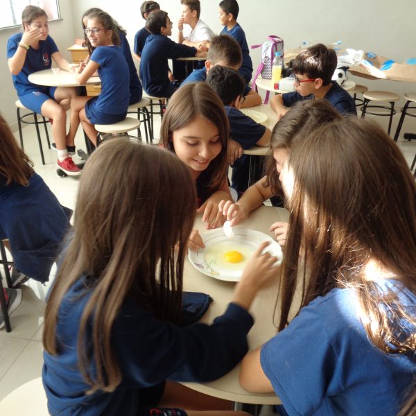 Os alunos observaram o ovo de galinha, a fim de identificar as partes da célula, objetos de estudo do 5º ano: membrana plasmática, citoplasma e núcleo.