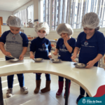 As turmas do Pré1 preparam um delicioso mingau de aveia. Os alunos exploraram e dosaram as medidas dos ingredientes, até chegar à textura do mingau. Depois da mistura, cada um pode escolher a temperatura que gostaria de degustar. A resposta foi unânime – “morno como o do ursinho”.