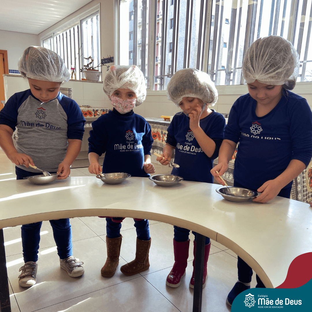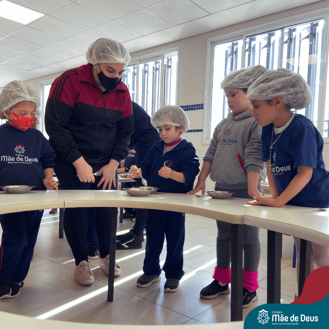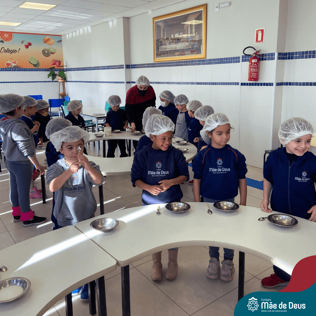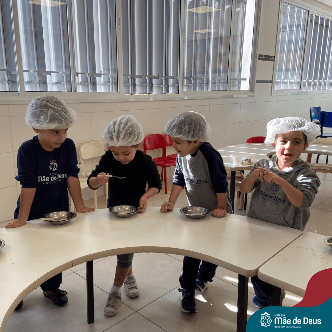 As turmas do Pré1 preparam um delicioso mingau de aveia. Os alunos exploraram e dosaram as medidas dos ingredientes, até chegar à textura do mingau. Depois da mistura, cada um pode escolher a temperatura que gostaria de degustar. A resposta foi unânime – “morno como o do ursinho”.