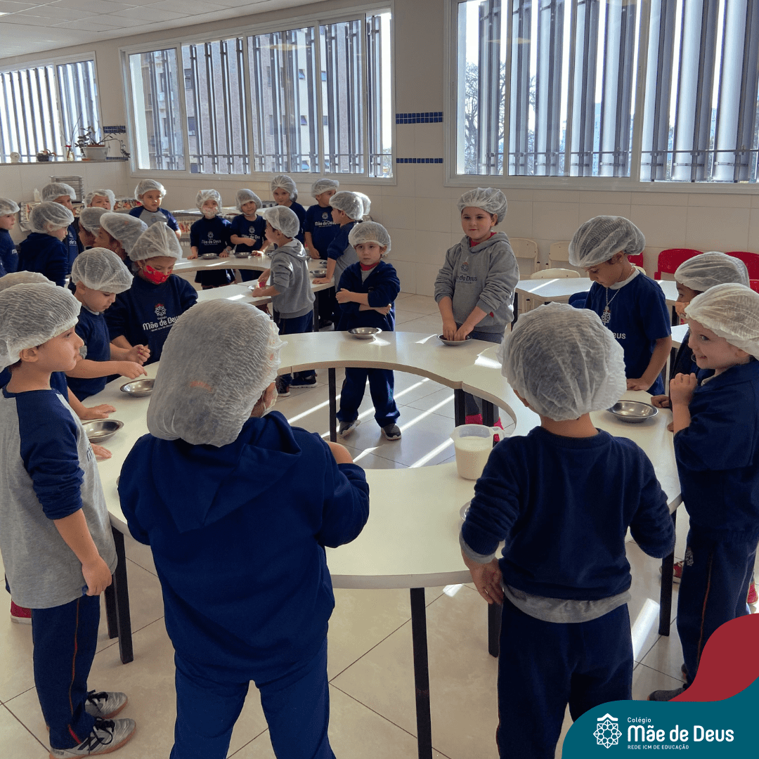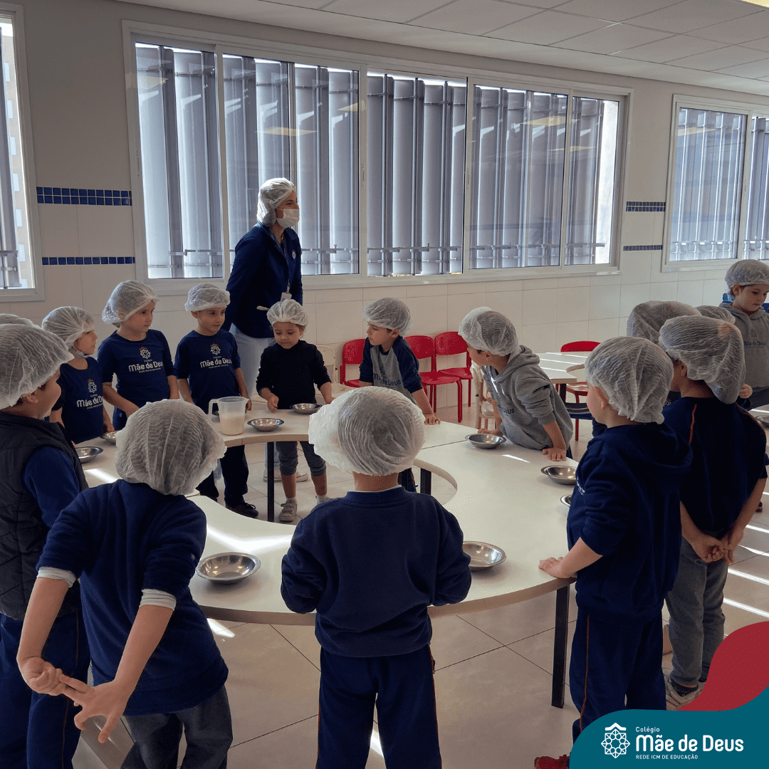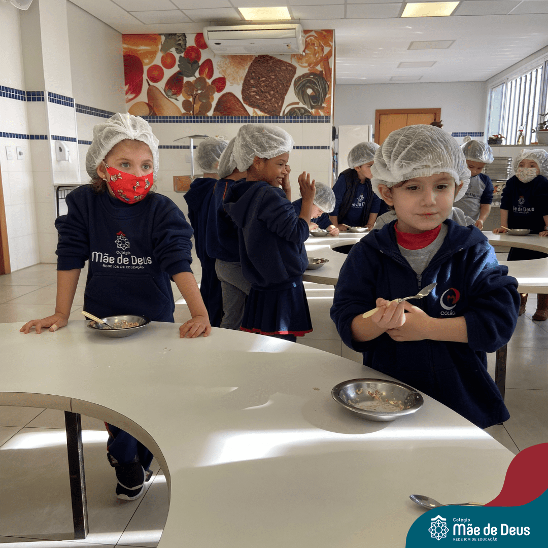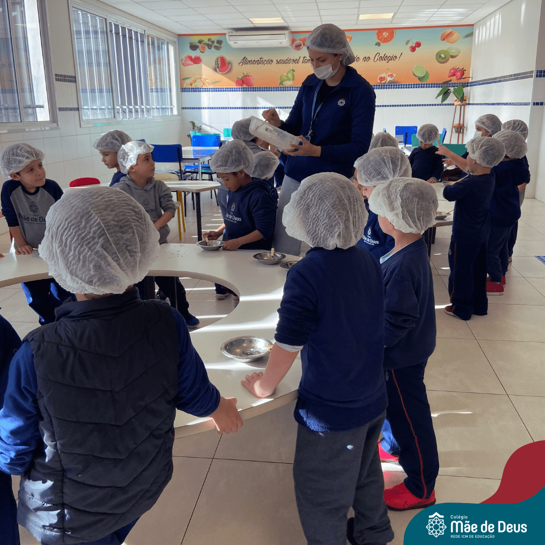 As turmas do Pré1 preparam um delicioso mingau de aveia. Os alunos exploraram e dosaram as medidas dos ingredientes, até chegar à textura do mingau. Depois da mistura, cada um pode escolher a temperatura que gostaria de degustar. A resposta foi unânime – “morno como o do ursinho”.