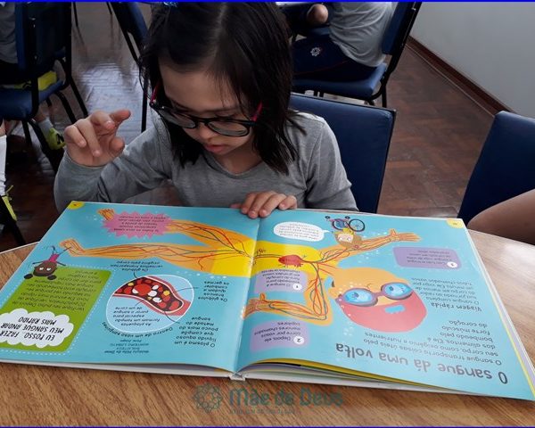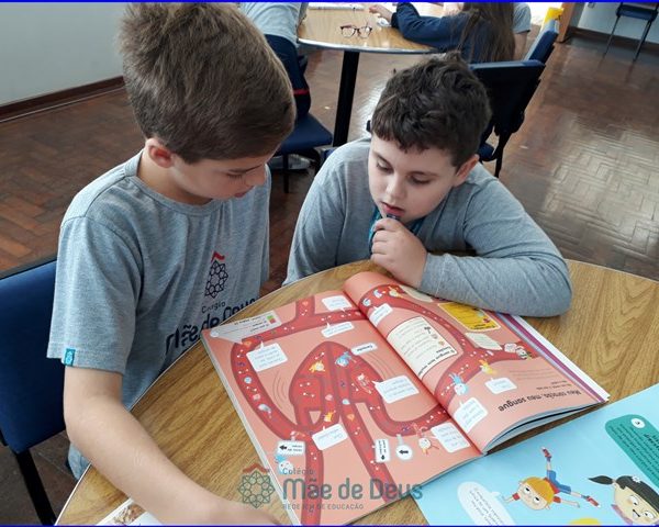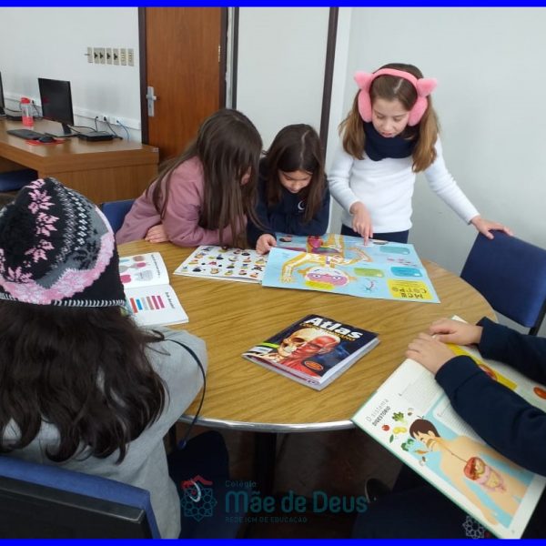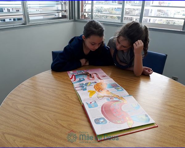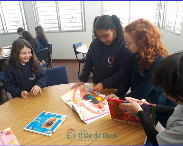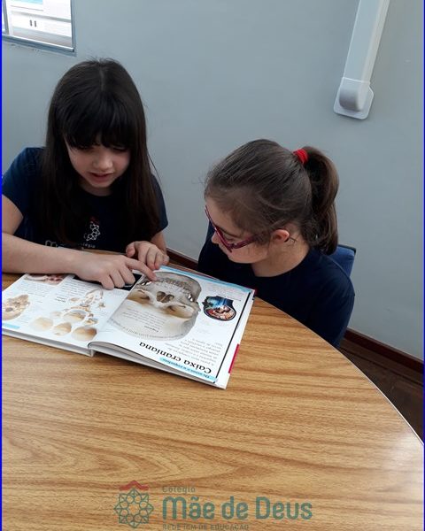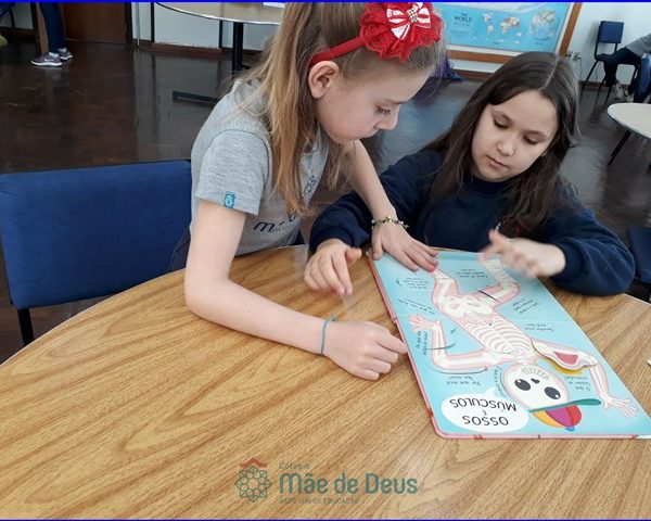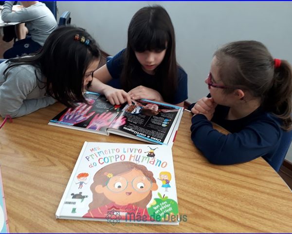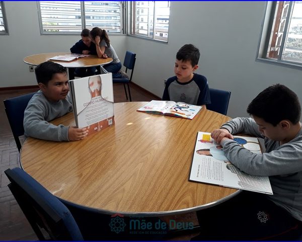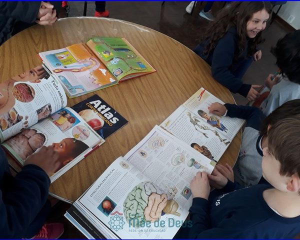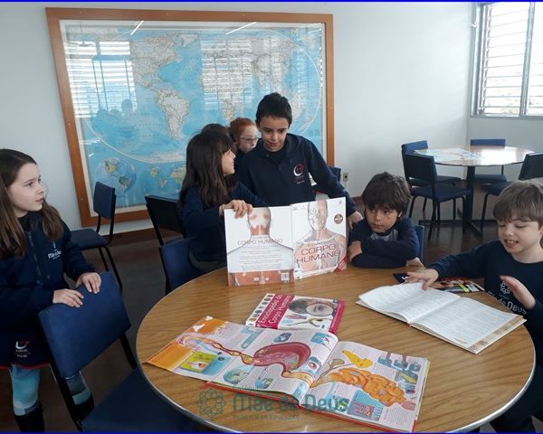 Um dos conceitos trabalhados pelo 3º ano do Ensino Fundamental é o corpo humano. Entre as atividades planejadas pelas professoras, destacamos a pesquisa realizada na biblioteca. Foram disponibilizados vários livros referentes ao assunto para que os estudantes aprofundassem seus conhecimentos, compartilhando assim suas descobertas com os colegas.