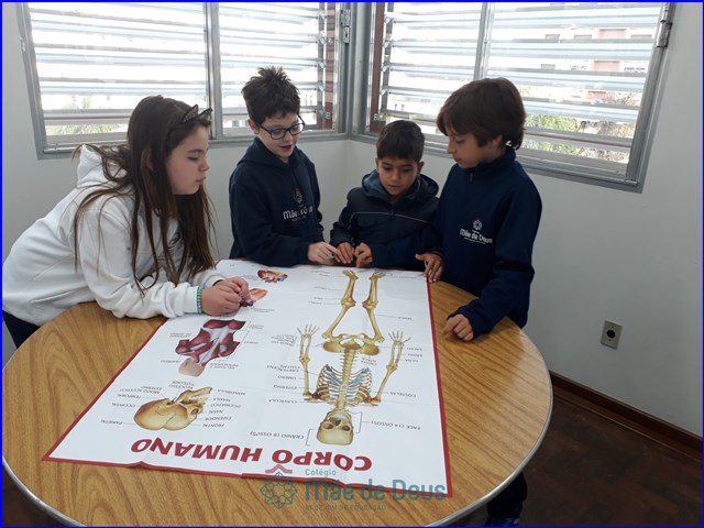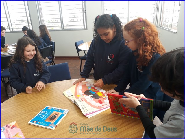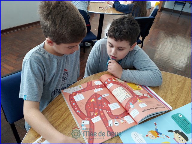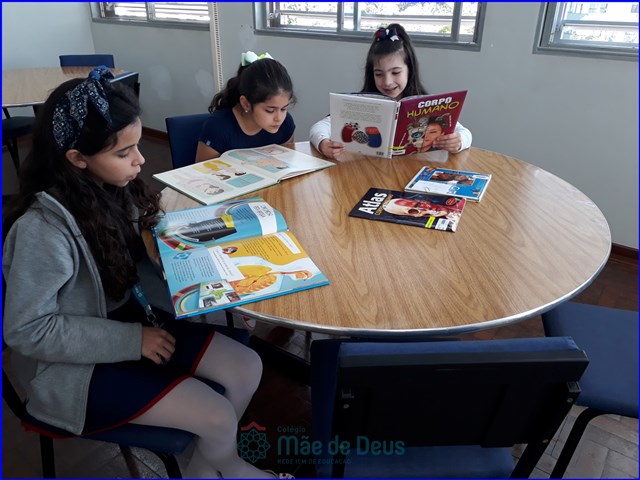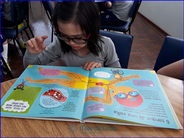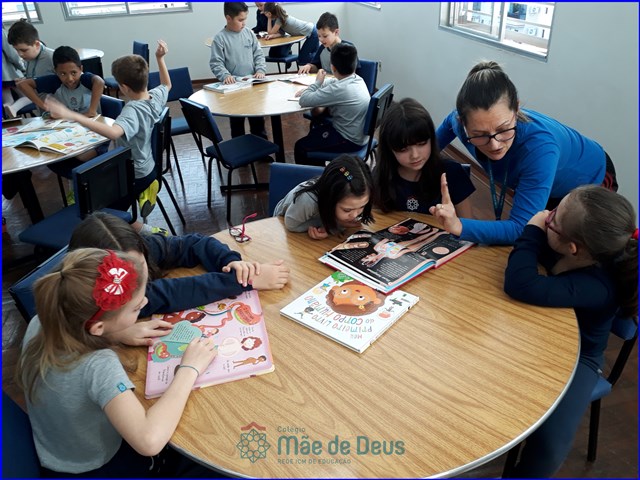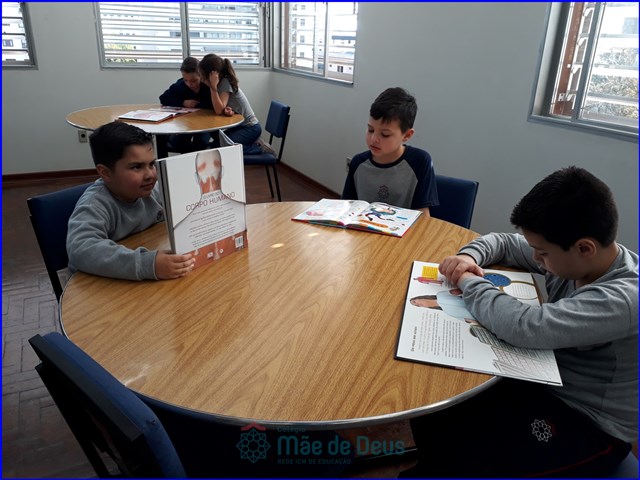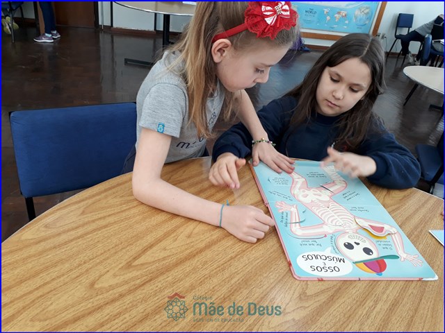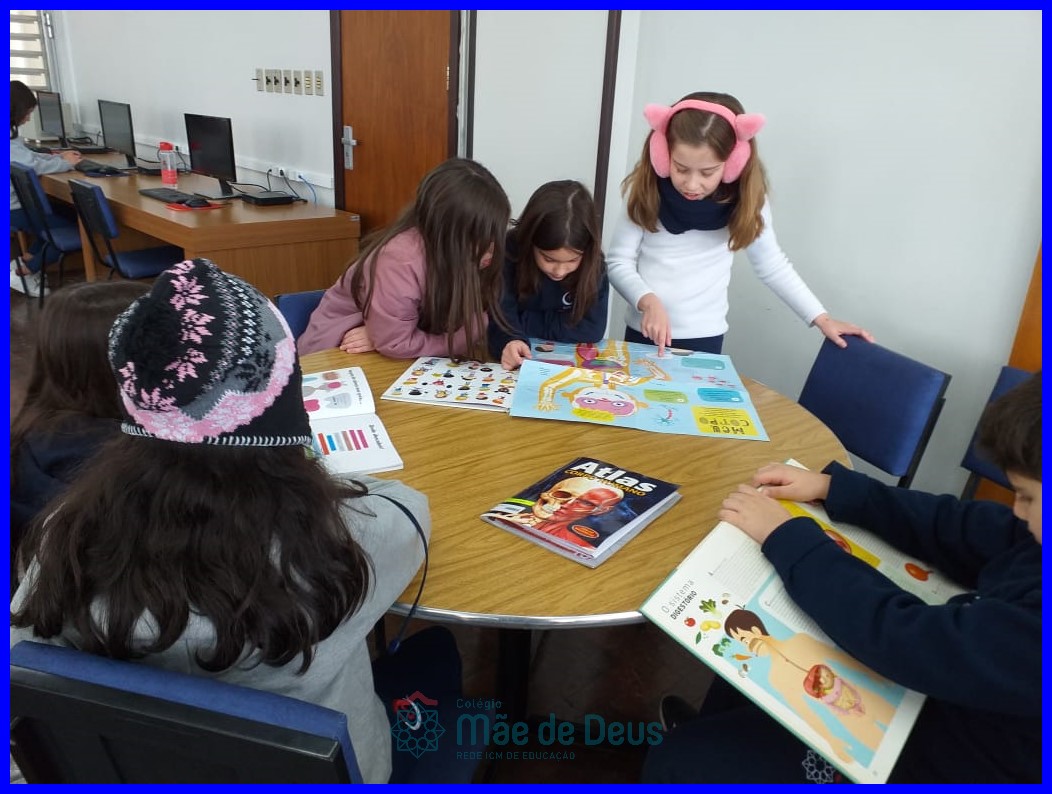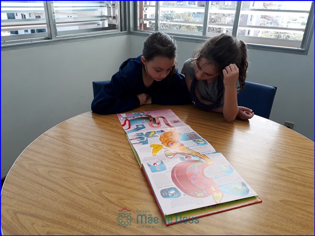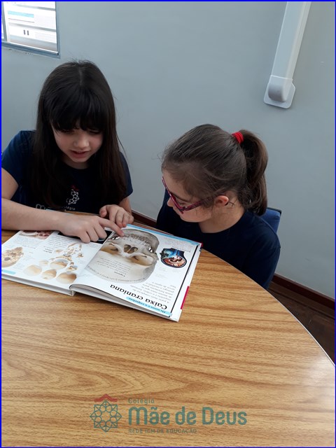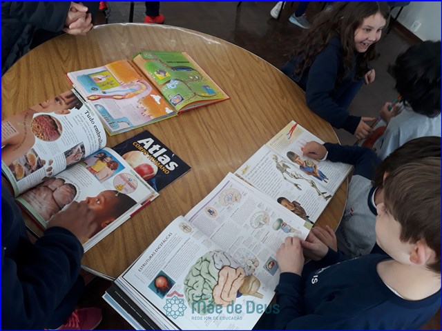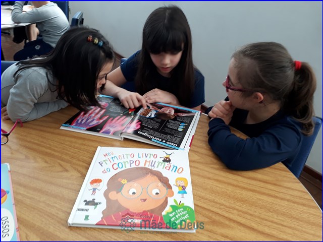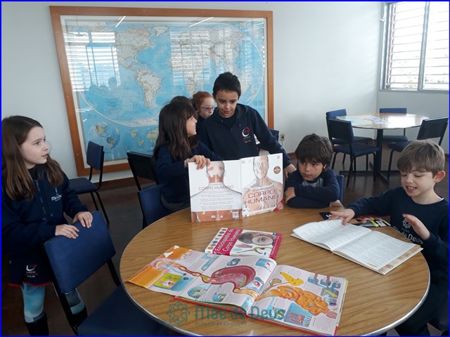 Um dos conceitos trabalhados pelo 3º ano do Ensino Fundamental é o corpo humano. Entre as atividades planejadas pelas professoras, destacamos a pesquisa realizada na biblioteca. Foram disponibilizados vários livros referentes ao assunto para que os estudantes aprofundassem seus conhecimentos, compartilhando assim suas descobertas com os colegas.