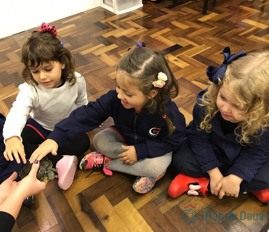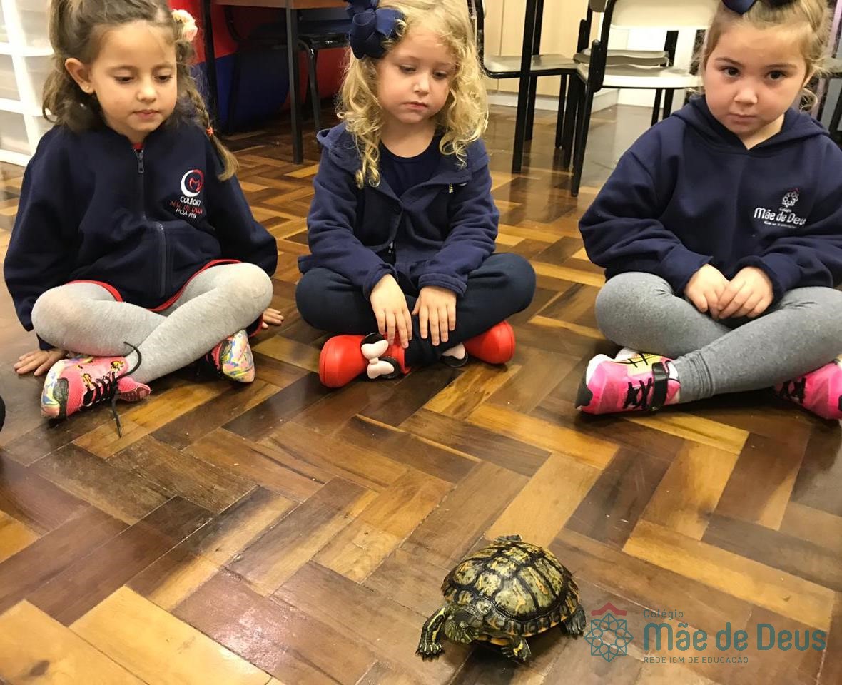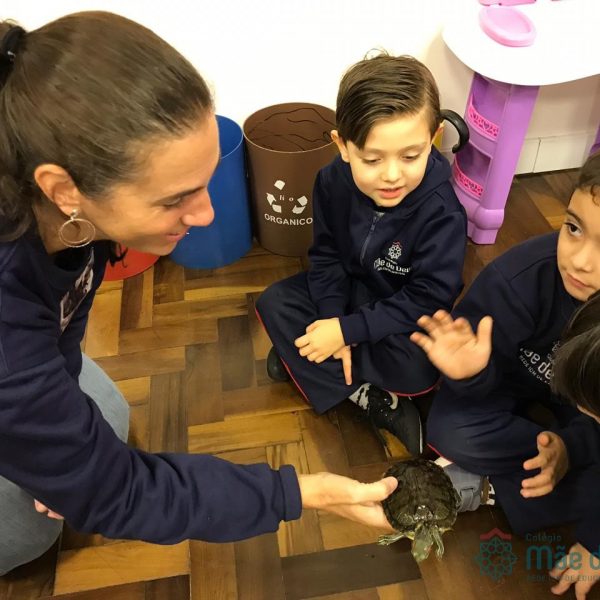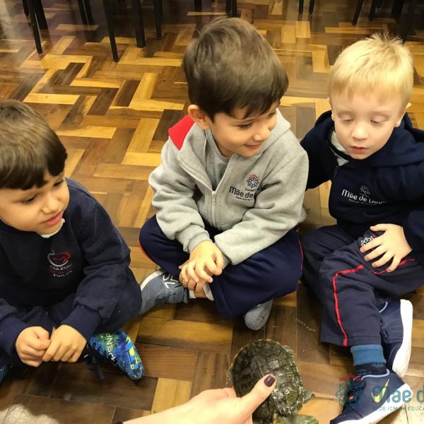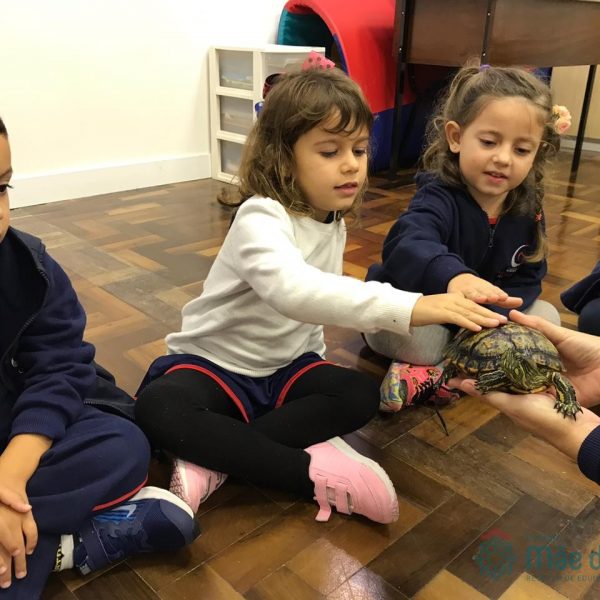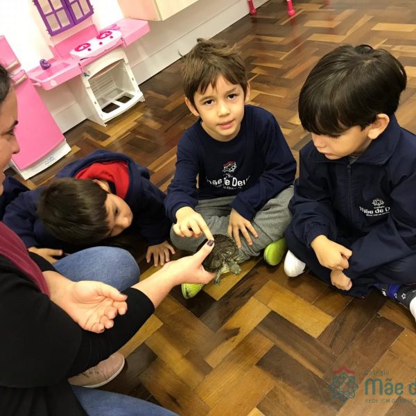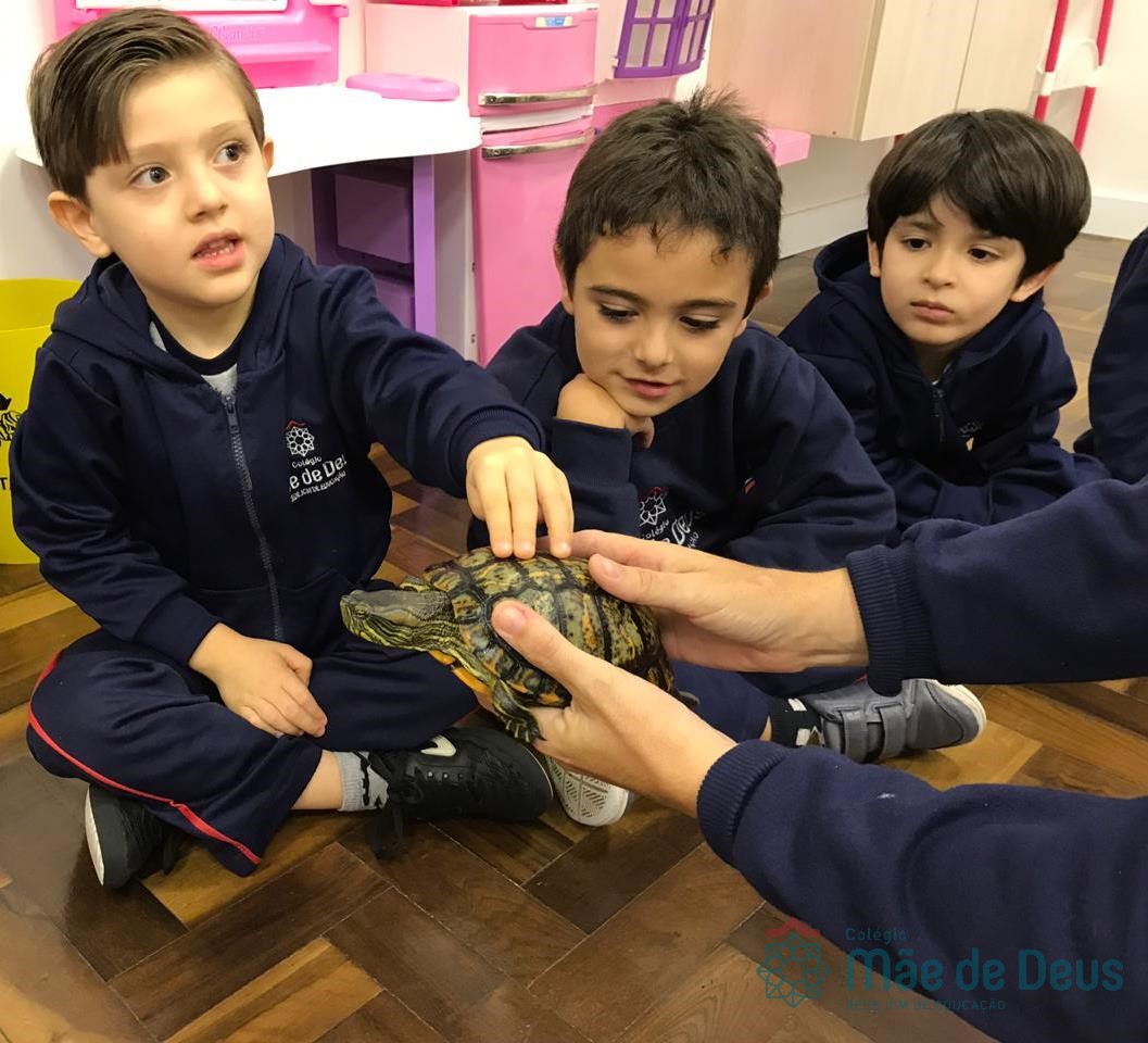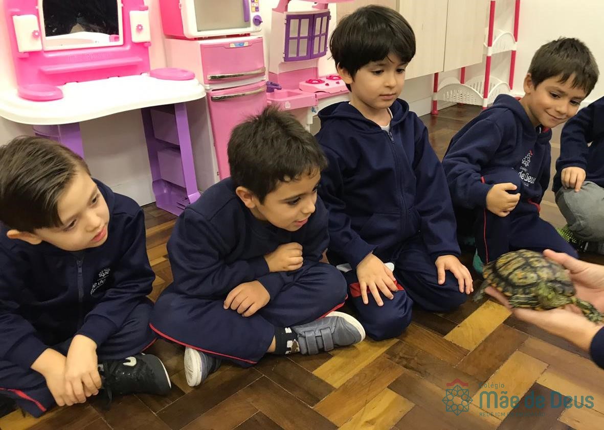 No dia 28 de maio, os alunos do Pré 1 do turno da tarde, receberam uma visita muito especial da veterinária Fabiana Severo e suas 3 tartarugas.
