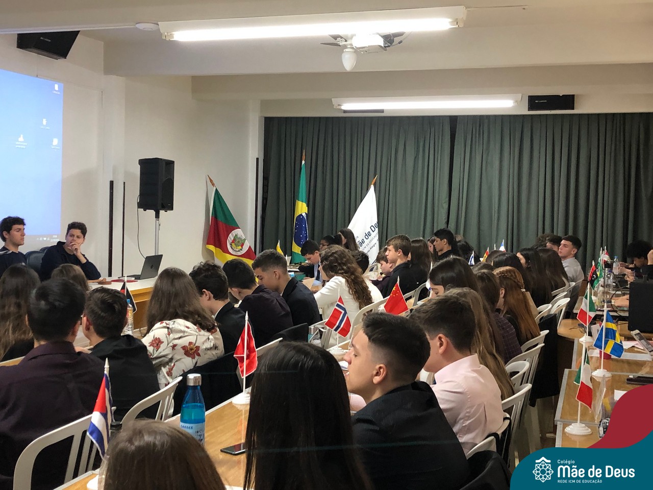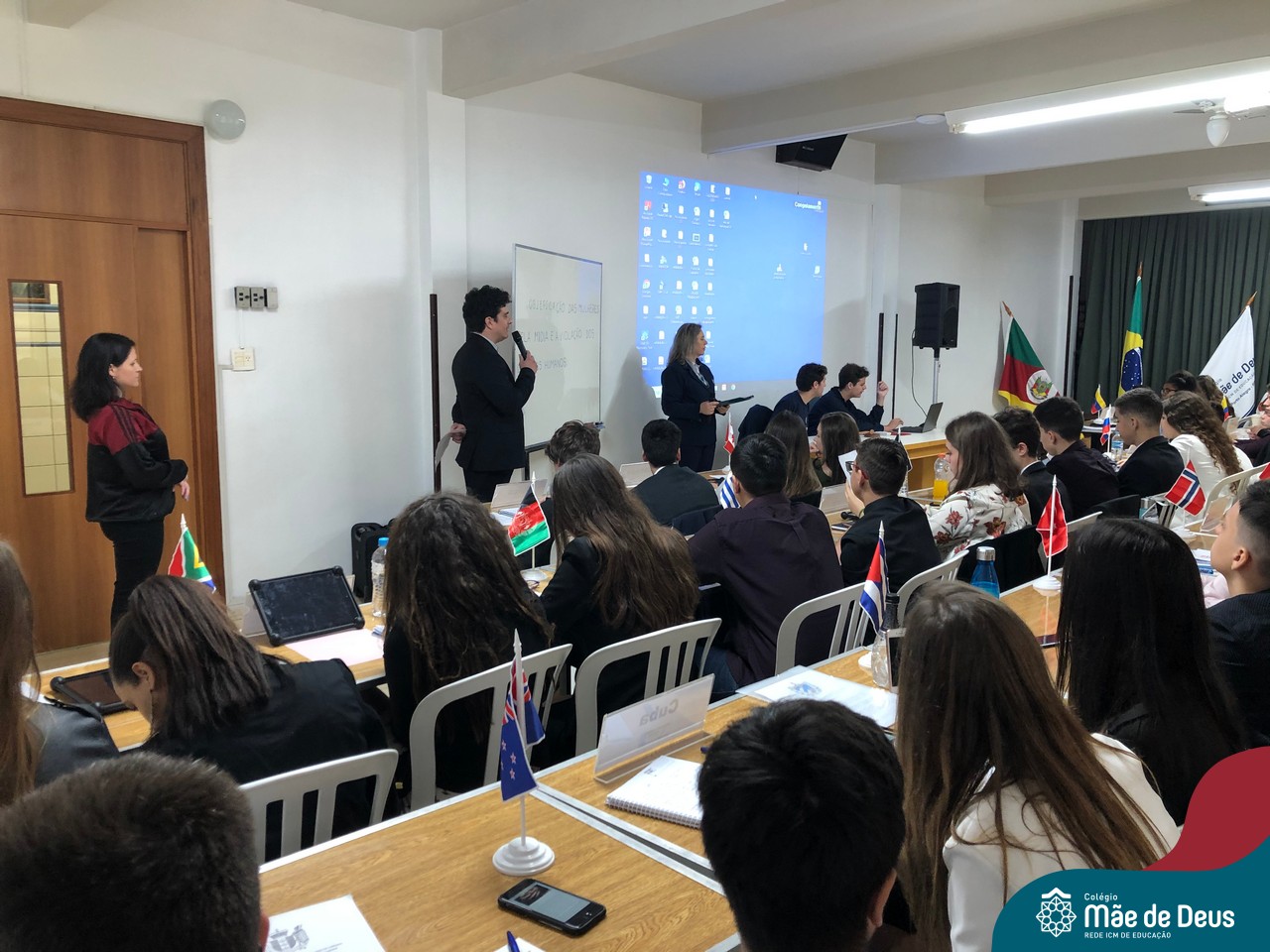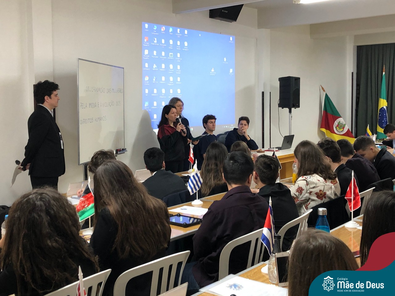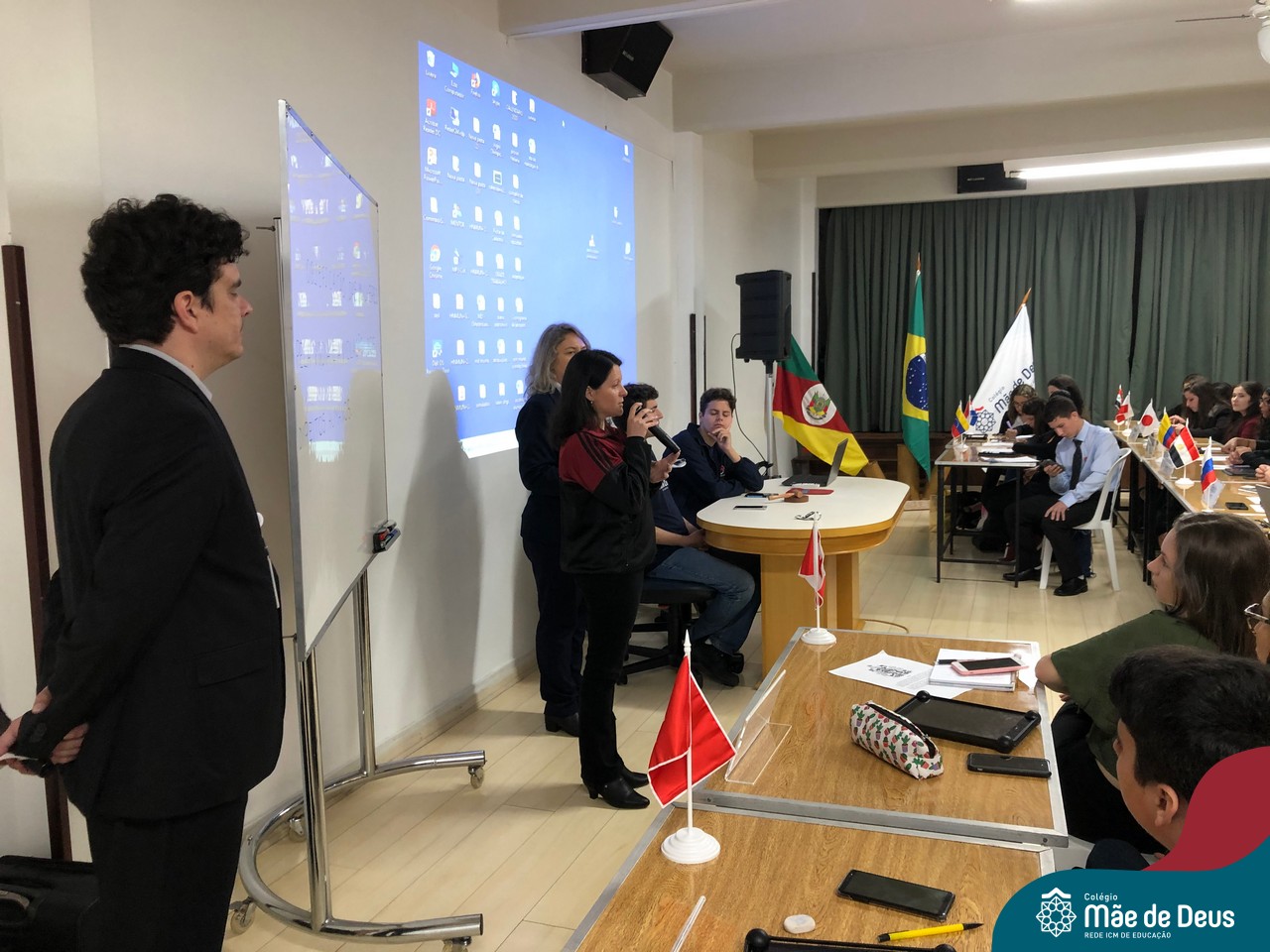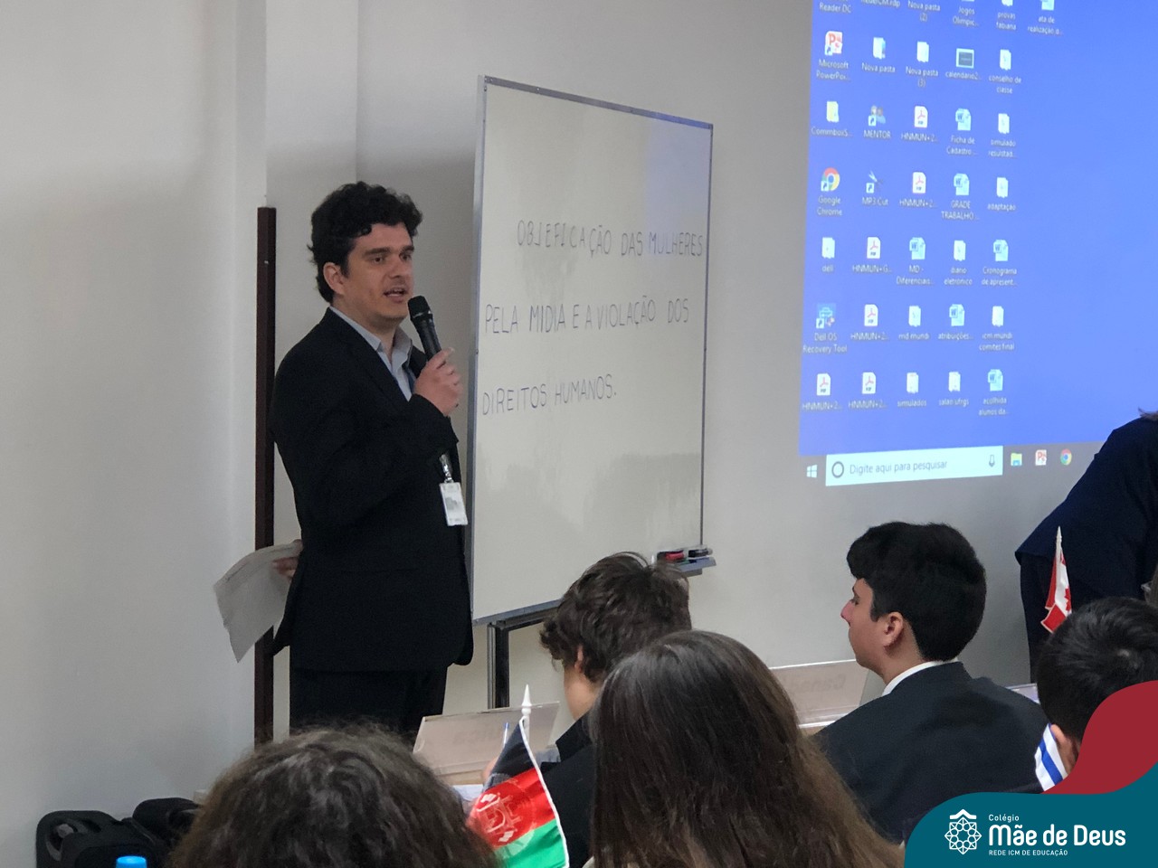 No dia 23 de outubro aconteceu o Primeiro MD MUNDI TEENAGER – Conferências Internacionais. Neste ano simulando o Comitê ONU MULHERES que discutiu a temática “A objetificação das Mulheres pela mídia e a violação dos direitos básicos.” Os alunos do 9º e do 8º ano tiveram a oportunidade de uma imersão no estudo e de serem protagonistas na proposição de alternativas de enfrentamento as problemáticas apresentadas com a orientação dos professores, Henry Juchem e Alexandre dos Santos Rosa, assessorados pelos alunos do NEA RI, e apoiados pelos demais professores, pela direção e pelos serviços de nosso Colégio.