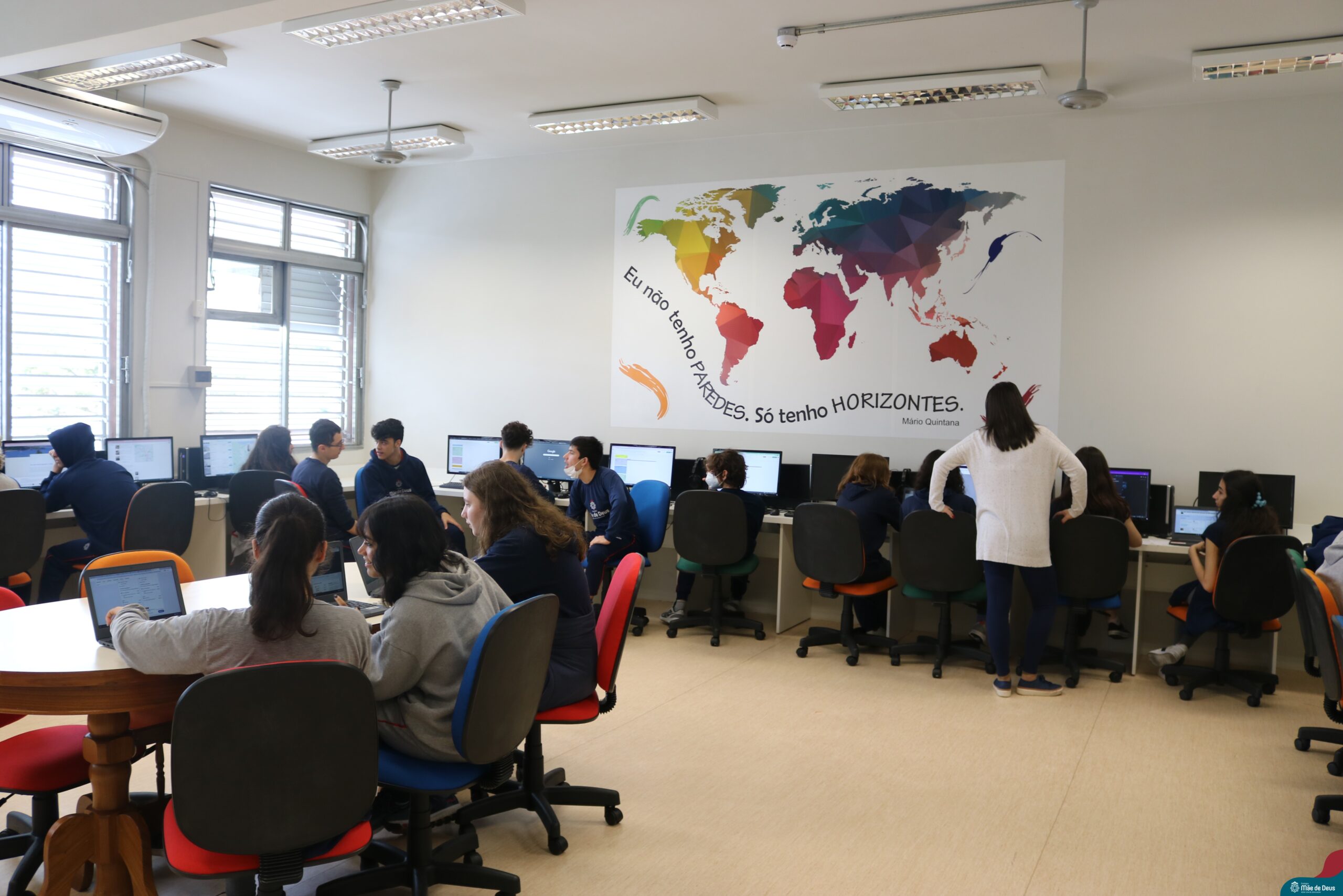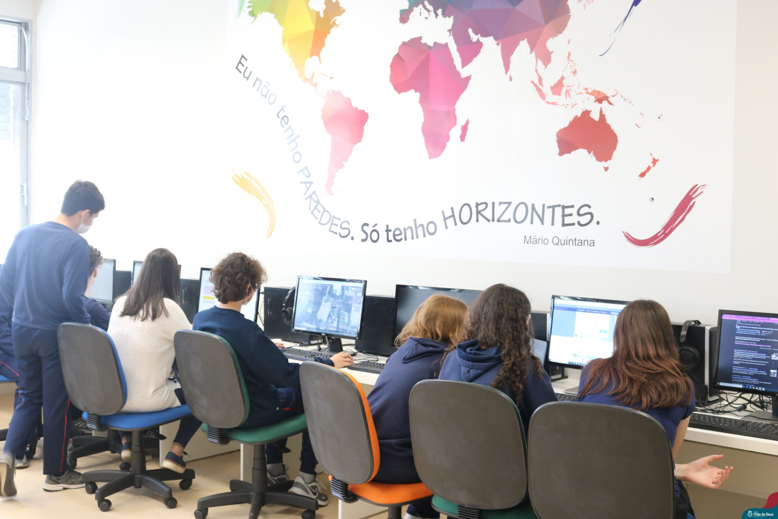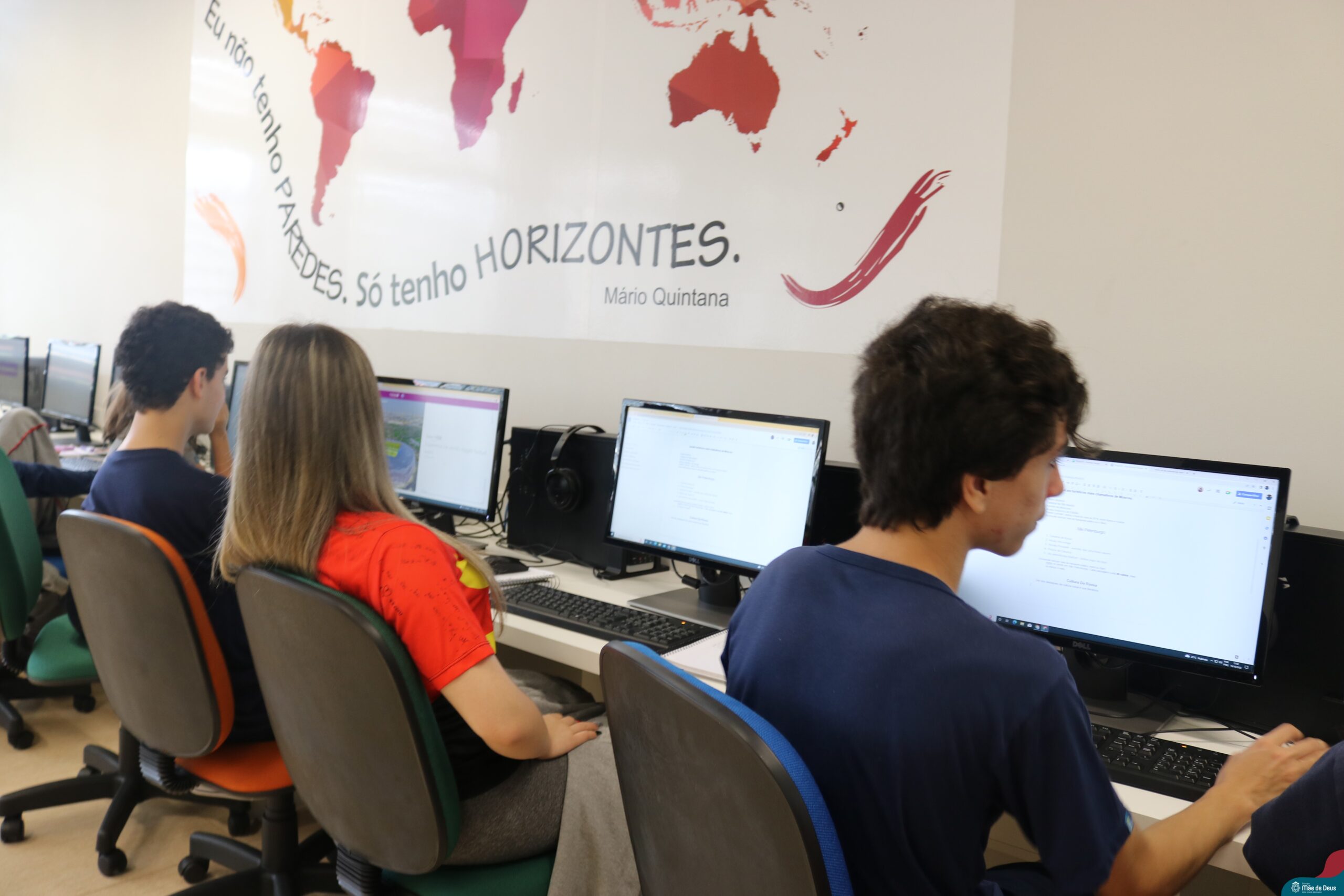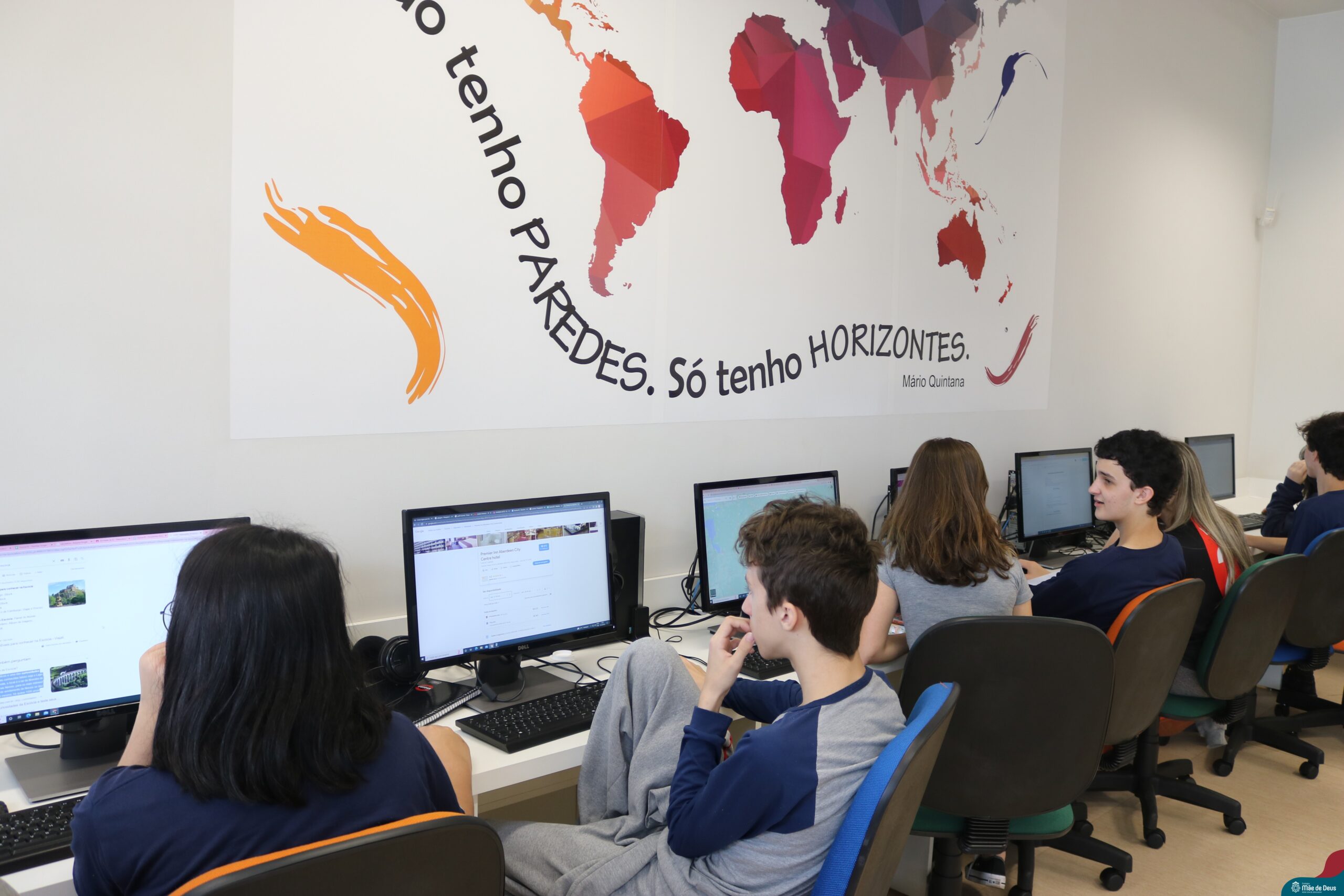 Os alunos do 9° ano do Ensino Fundamental realizaram o projeto interdisciplinar “Viajando pelo mundo”. O projeto integra os componentes curriculares de Matemática, Língua Portuguesa e Geografia, e teve como objetivo incentivar os estudantes do 9º ano a elaborar um roteiro de viagem que organizasse toda a logística para um período de férias (15 dias) em um país estrangeiro.