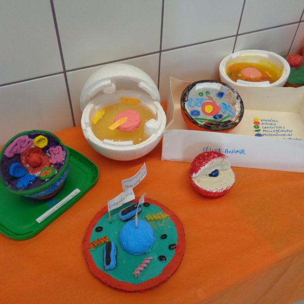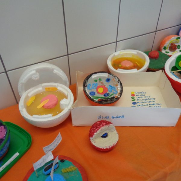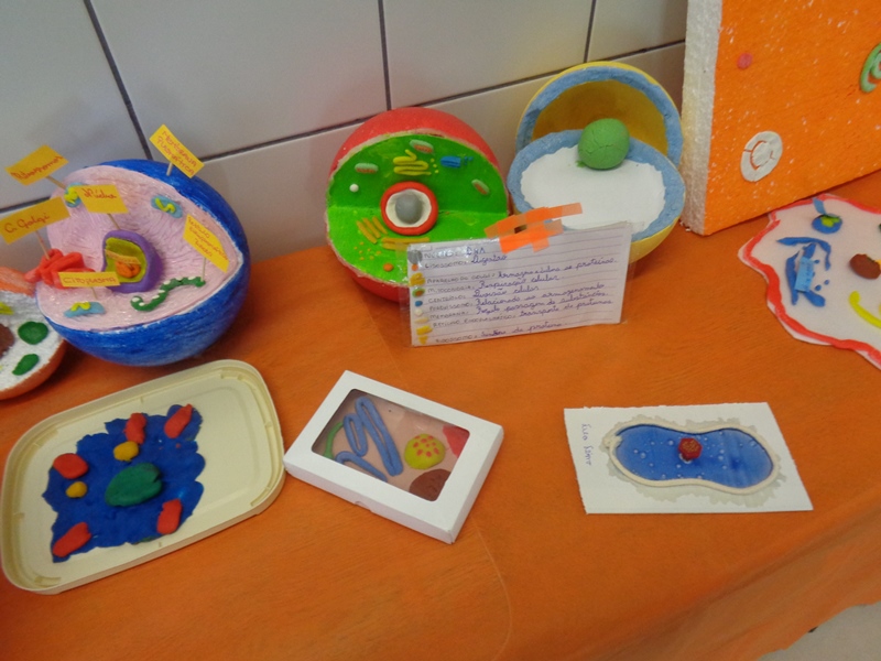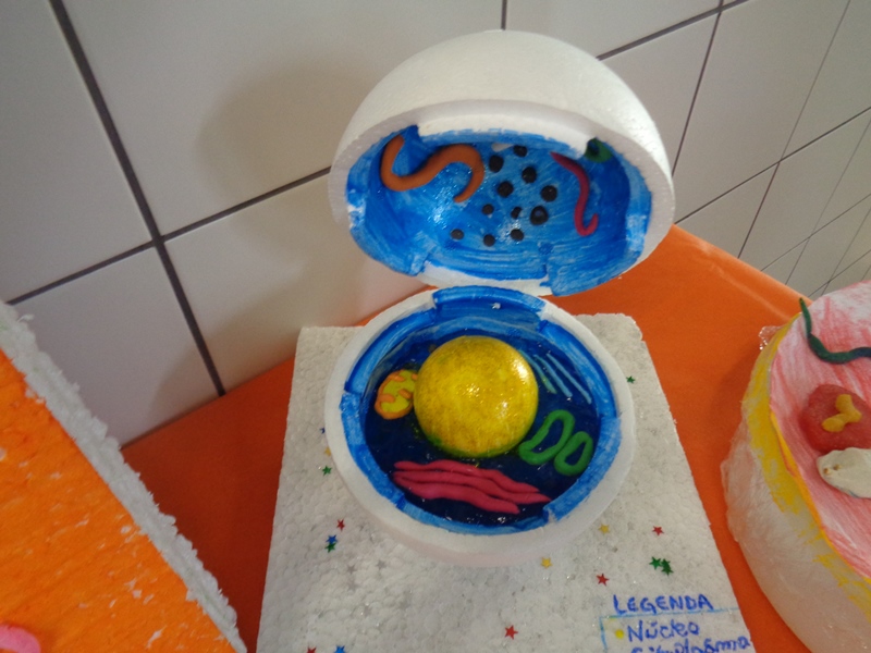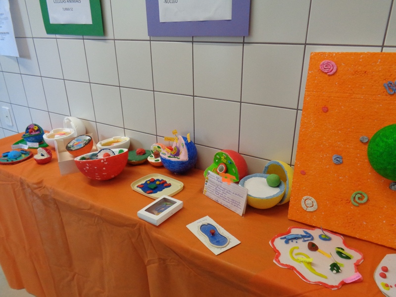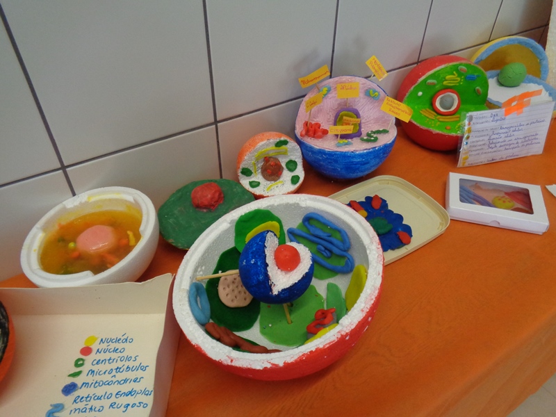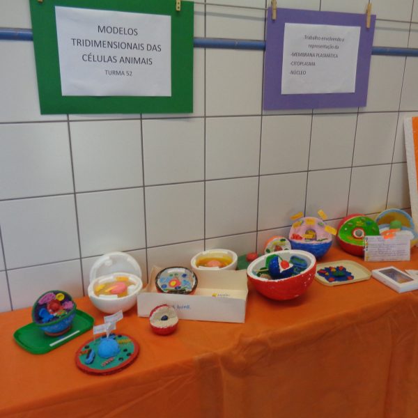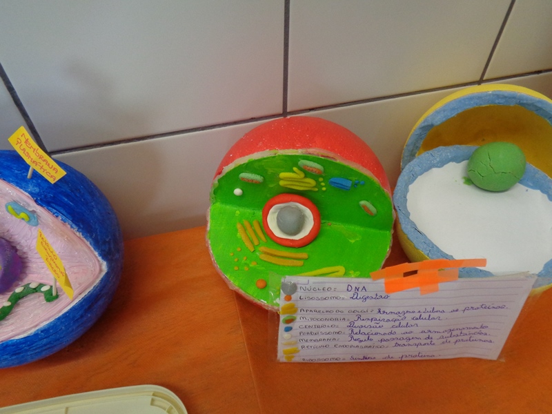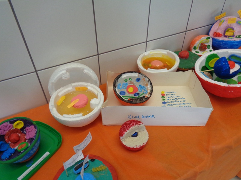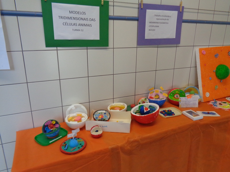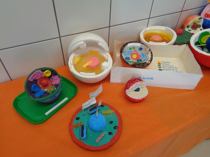 Os alunos da turma 52 construíram modelos tridimensionais da célula animal nas aulas de Ciências. Em seus trabalhos, representaram as partes da célula estudadas no 5º ano, com os mais diferentes materiais.