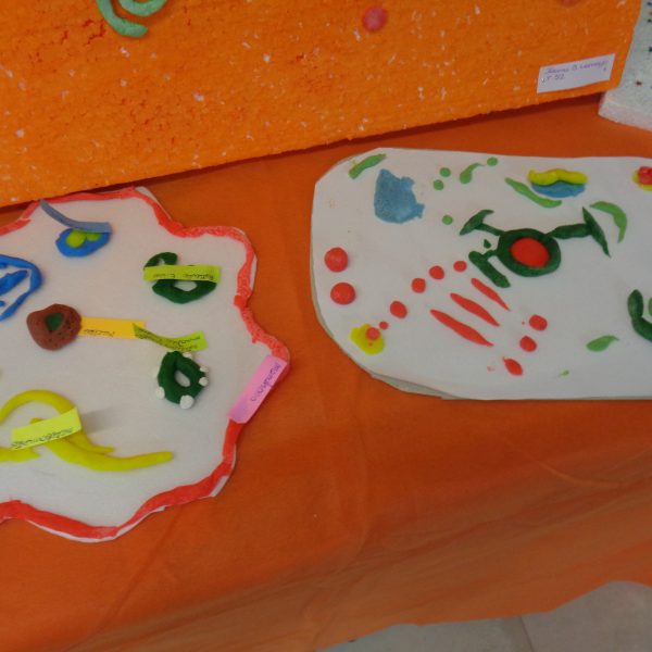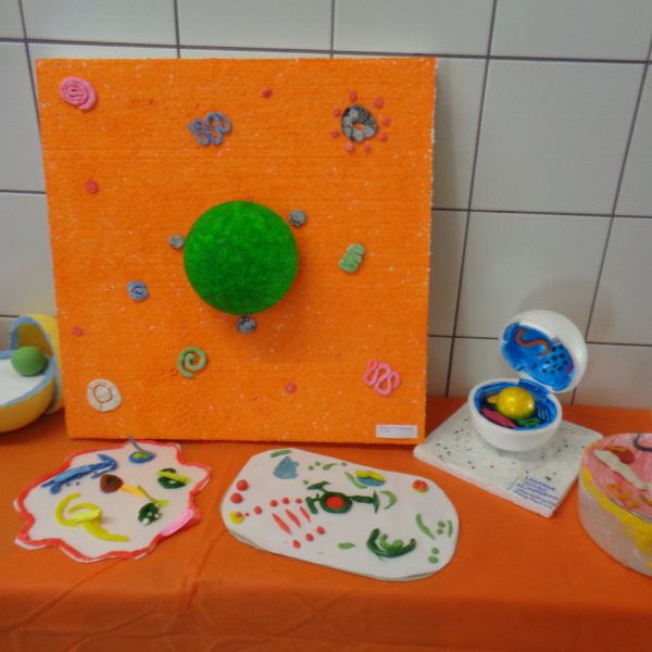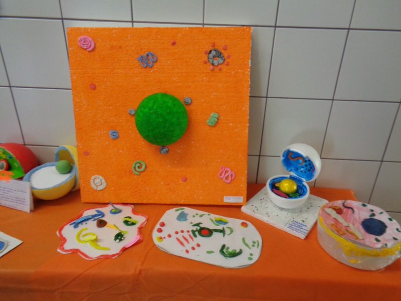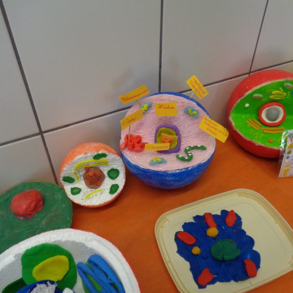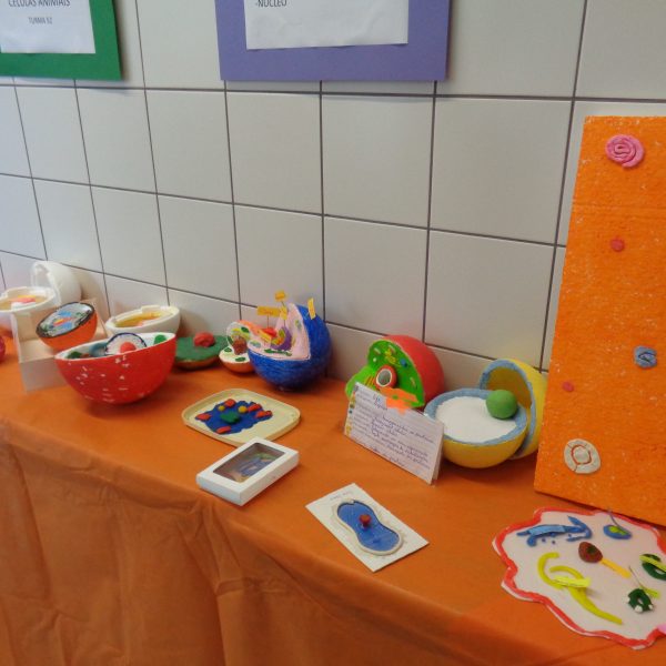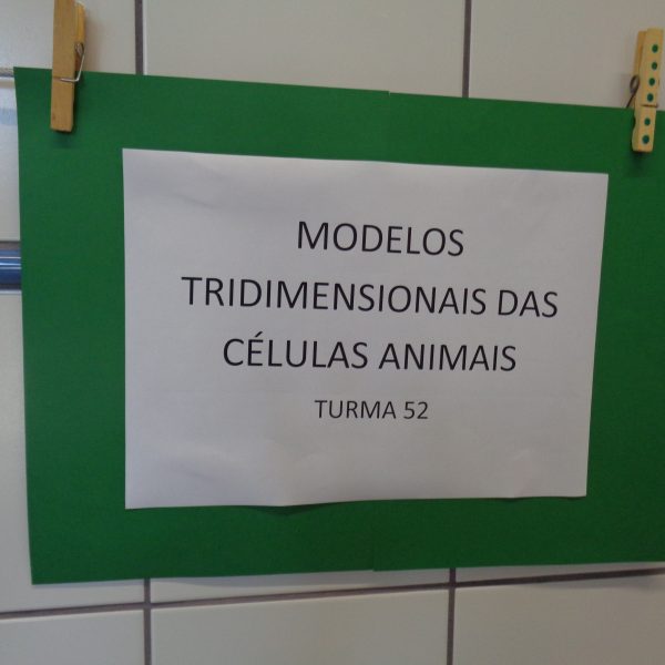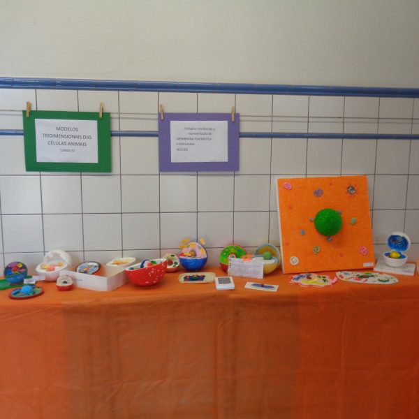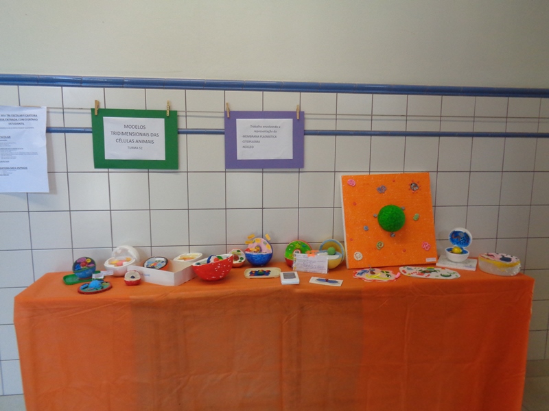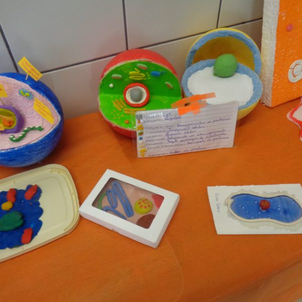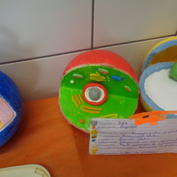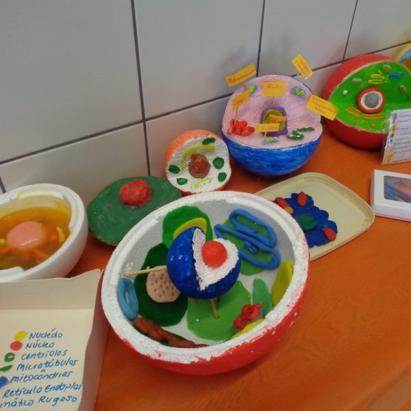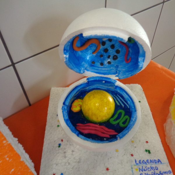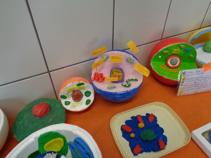 Os alunos da turma 52 construíram modelos tridimensionais da célula animal nas aulas de Ciências. Em seus trabalhos, representaram as partes da célula estudadas no 5º ano, com os mais diferentes materiais.
