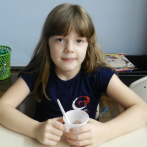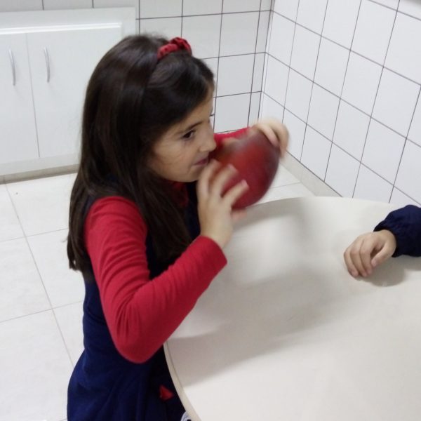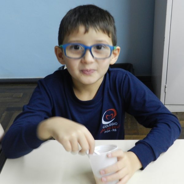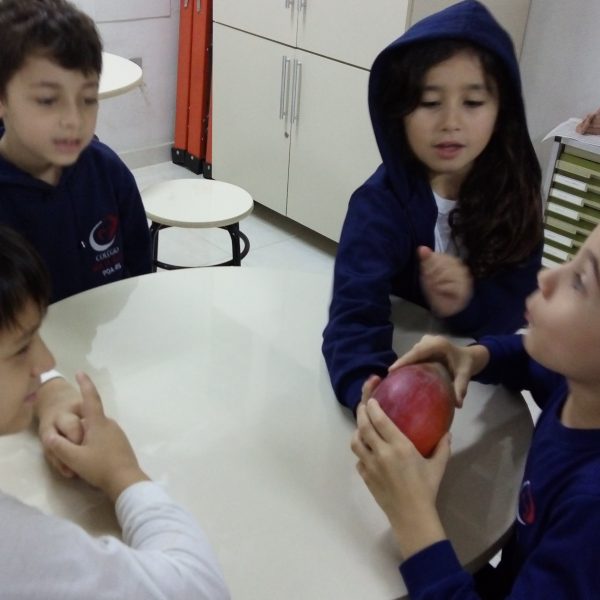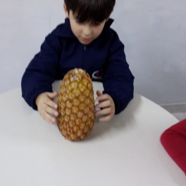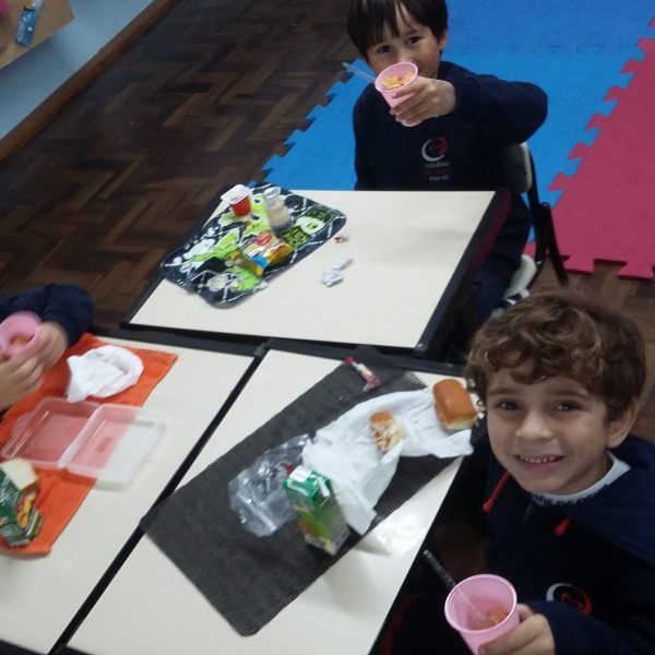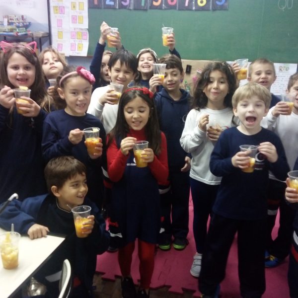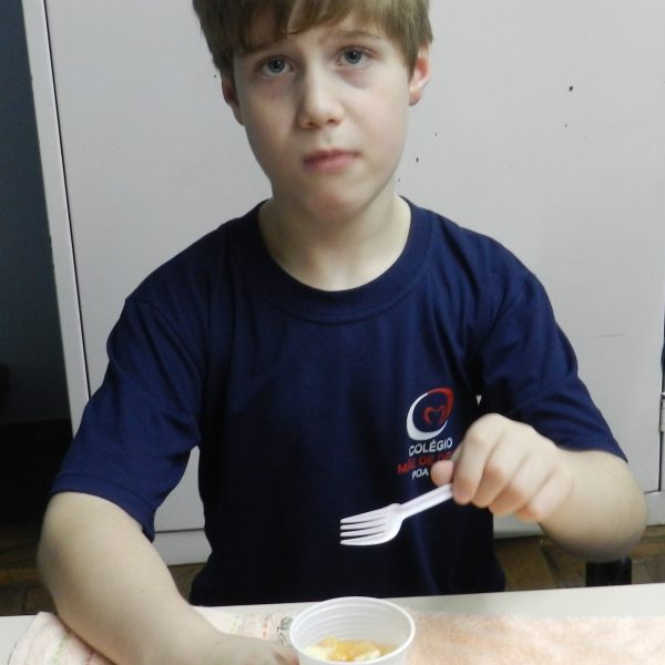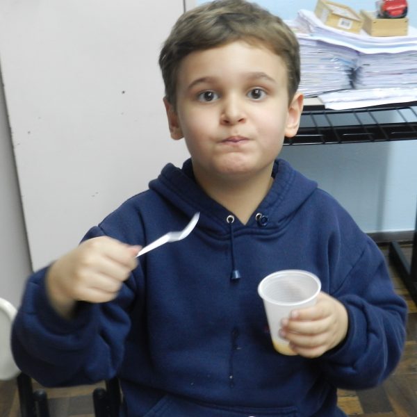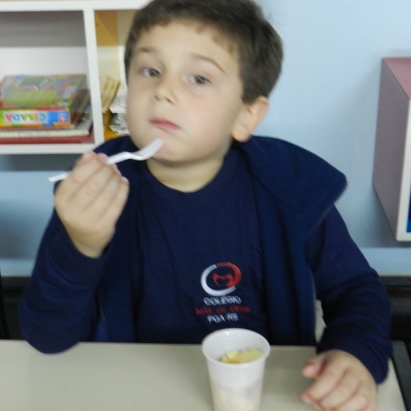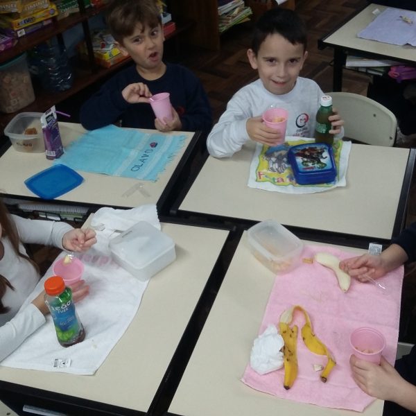 As crianças trouxeram para a aula as frutas que foram higienizadas e preparadas para, em pequenos pedaços, misturar com o suco de laranja. Exploraram as cores, formas, sabores e as texturas das diferentes frutas. Após, realizaram com desenhos e escrita atividades sobre essa divertida experiência culinária.