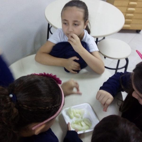 Com o objetivo de despertar hábitos de alimentação saudável e considerando a importância de ingerir os nutrientes existentes nos diferentes alimentos para a promoção da saúde, alunos e professoras prepararam e degustaram uma salada deliciosa.