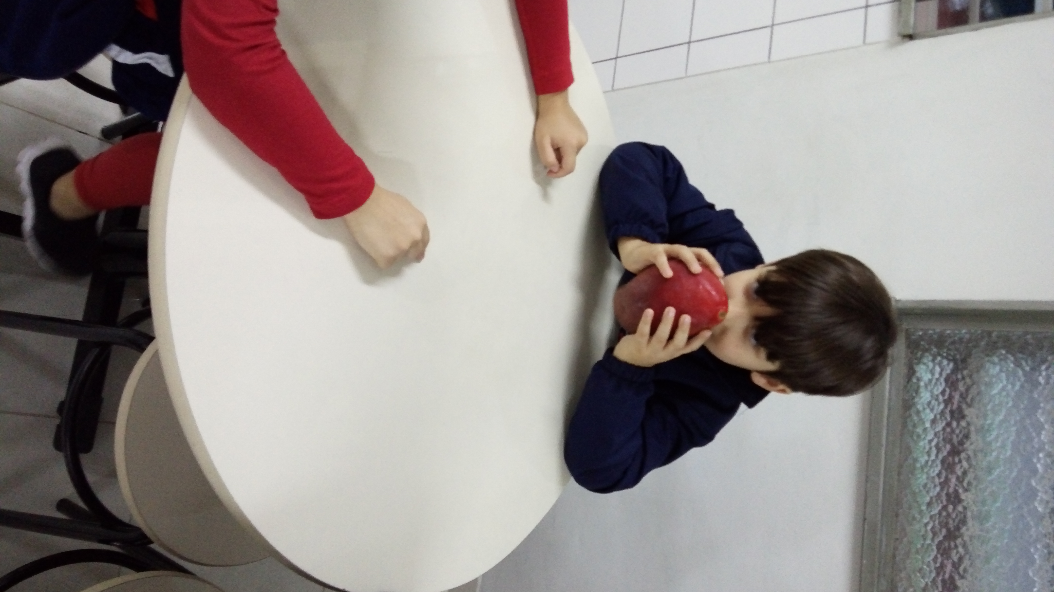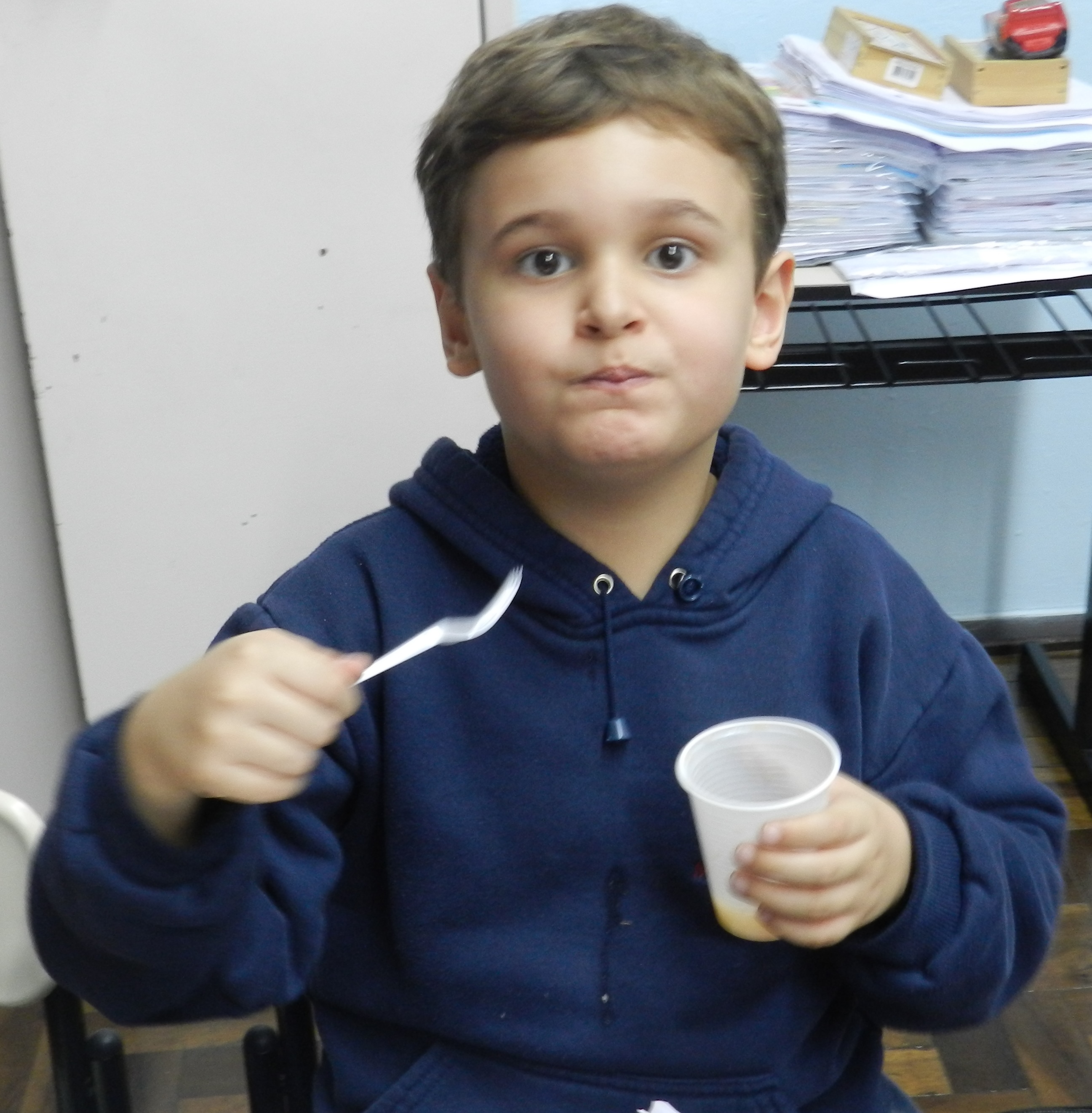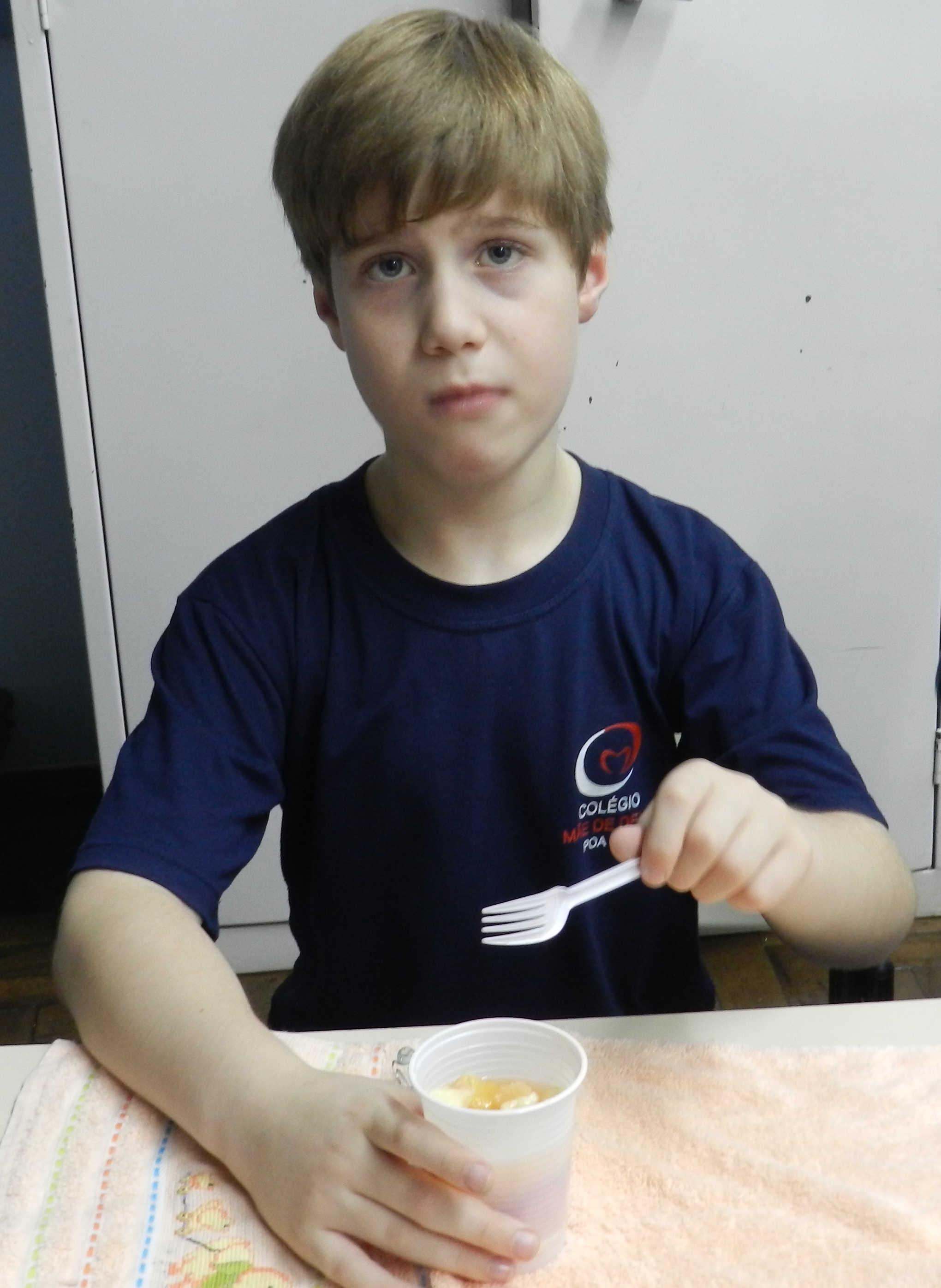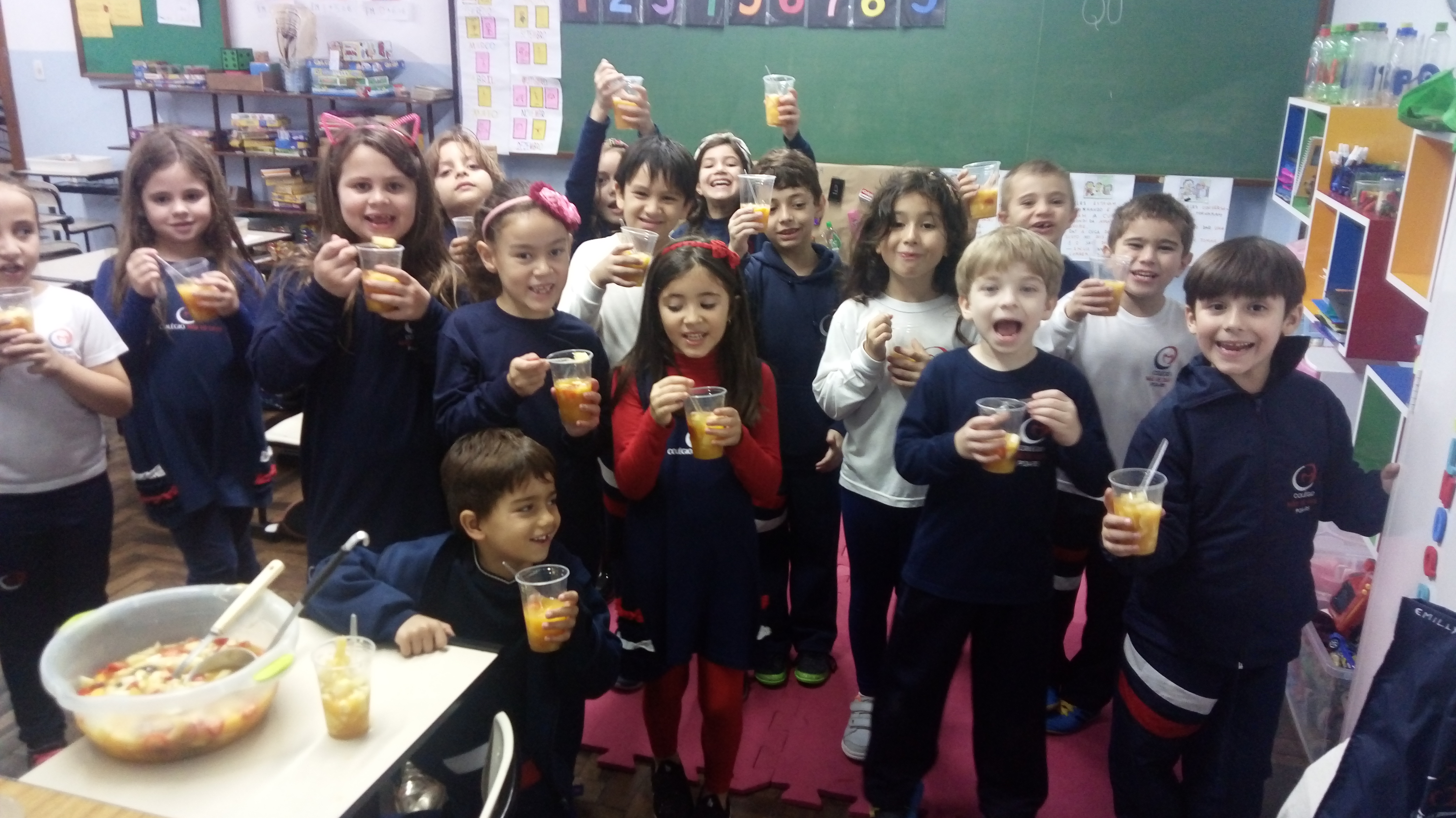 As crianças trouxeram para a aula as frutas que foram higienizadas e preparadas para, em pequenos pedaços, misturar com o suco de laranja. Exploraram as cores, formas, sabores e as texturas das diferentes frutas. Após, realizaram com desenhos e escrita atividades sobre essa divertida experiência culinária.
