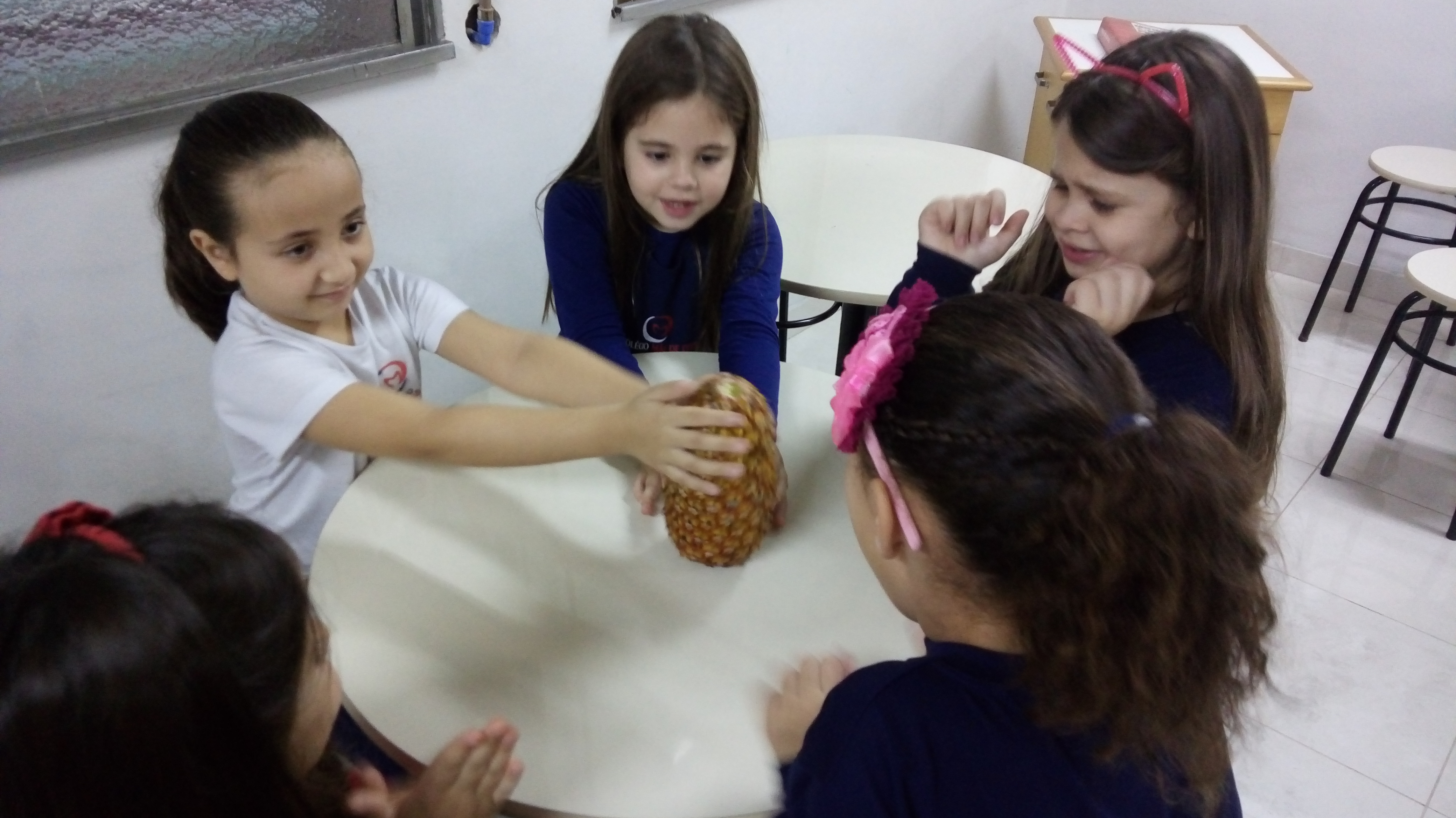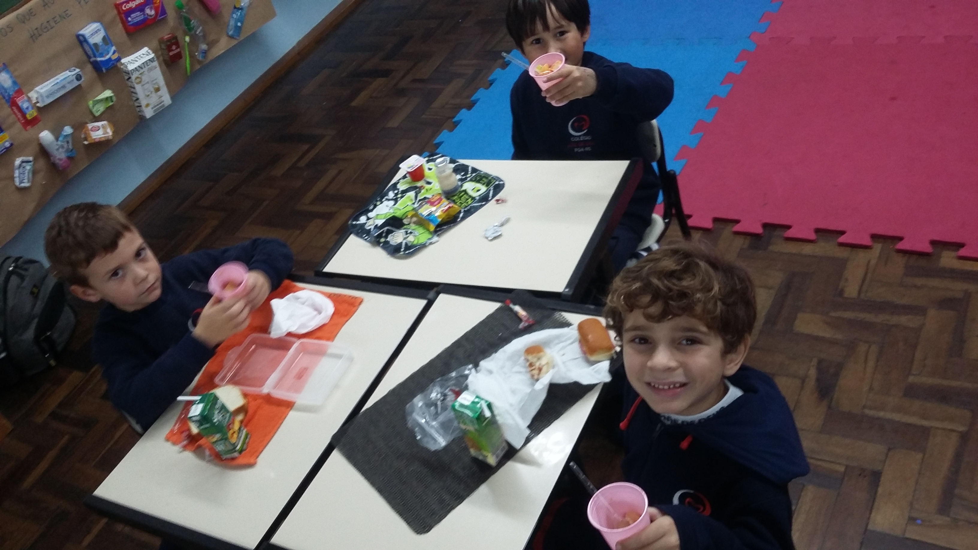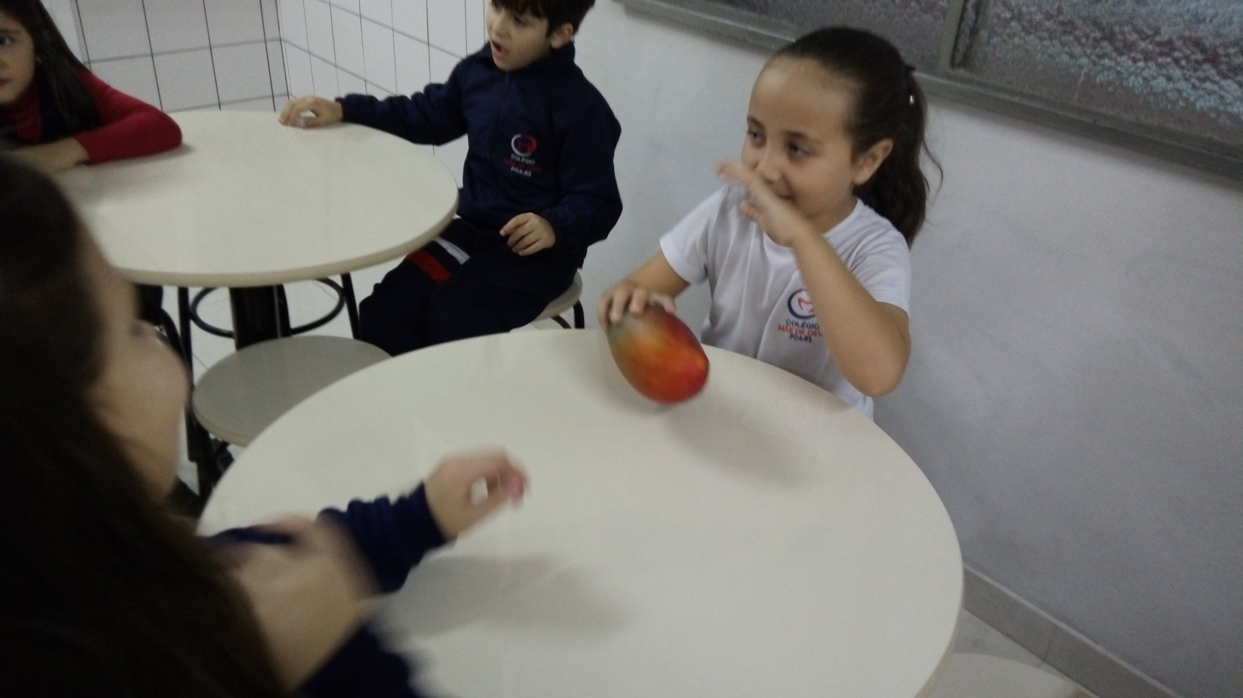As crianças trouxeram para a aula as frutas que foram higienizadas e preparadas para, em pequenos pedaços, misturar com o suco de laranja. Exploraram as cores, formas, sabores e as texturas das diferentes frutas. Após, realizaram com desenhos e escrita atividades sobre essa divertida experiência culinária.