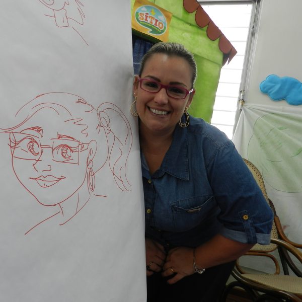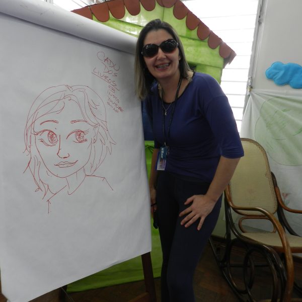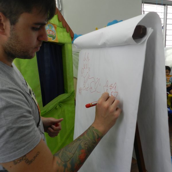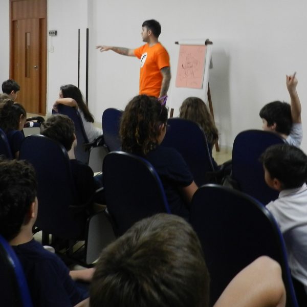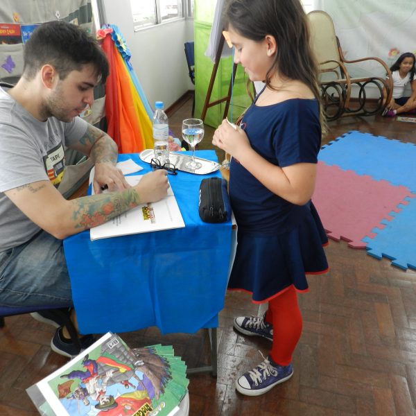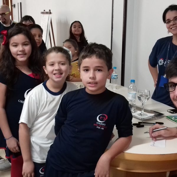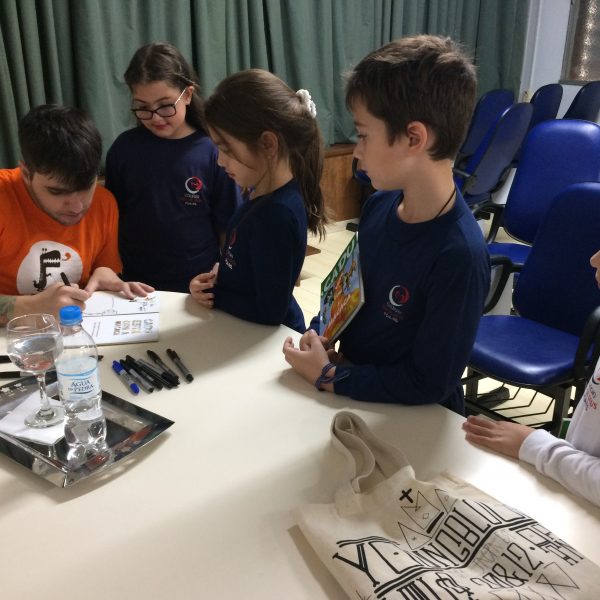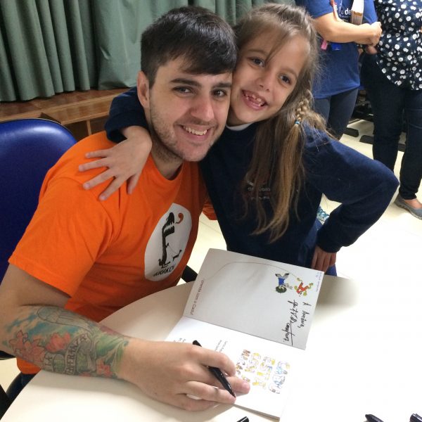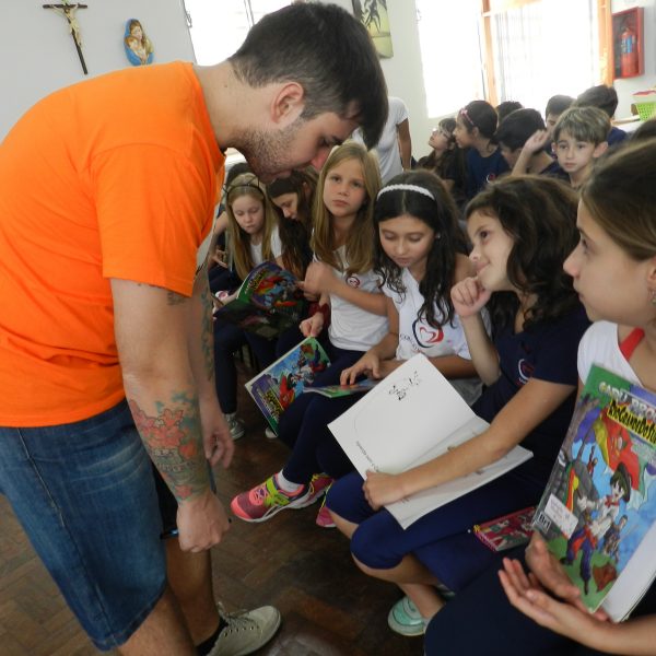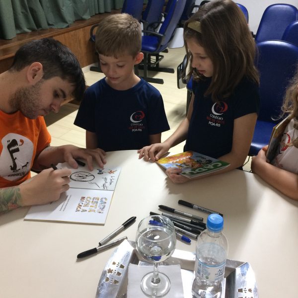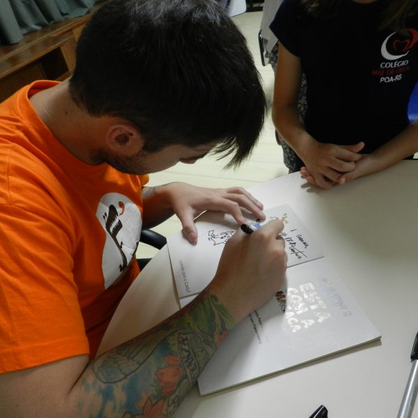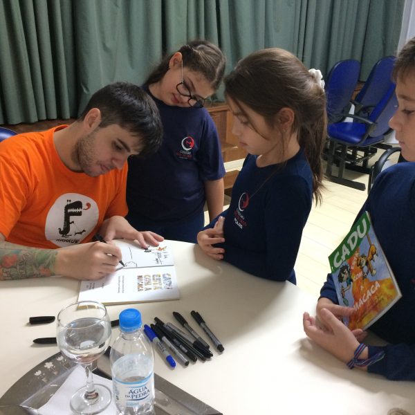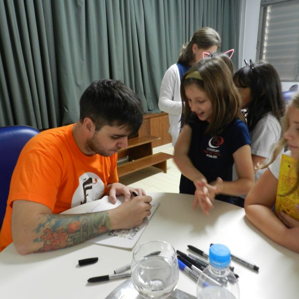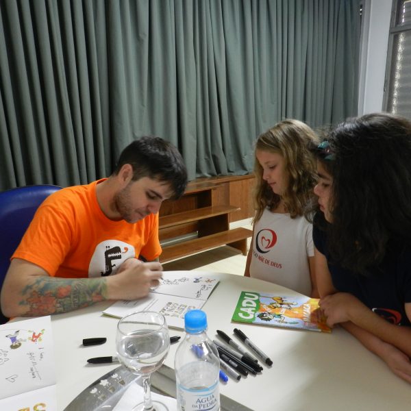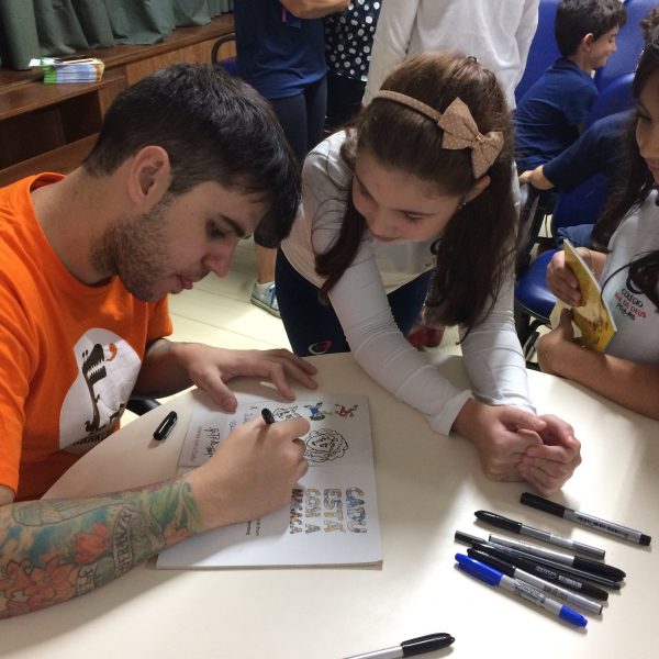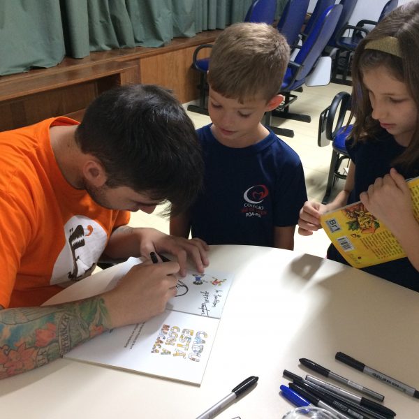 As crianças puderam interagir com o escritor e ilustrador que aproveitou o encontro para fazer vários desenhos e encantar os alunos com o seu talento.