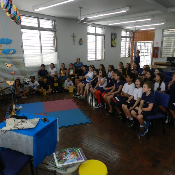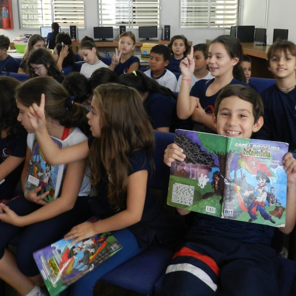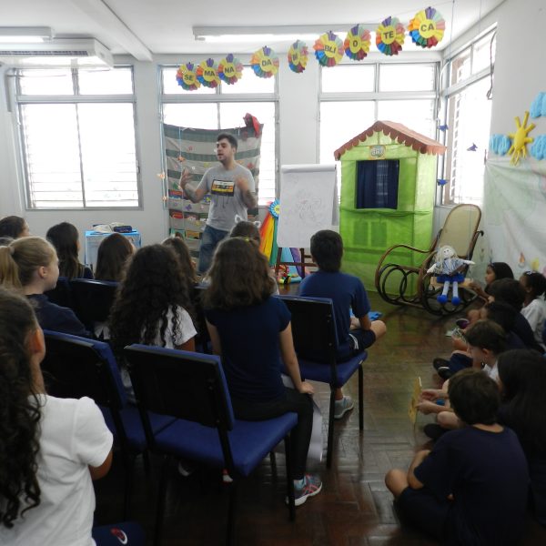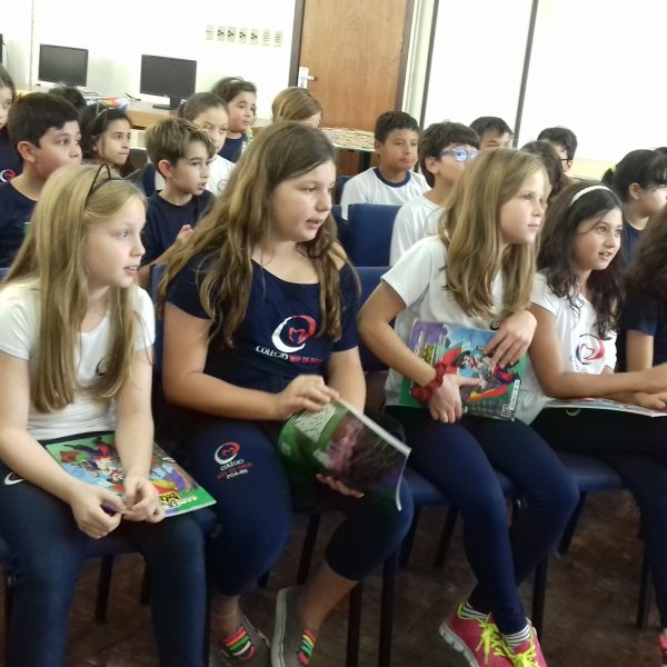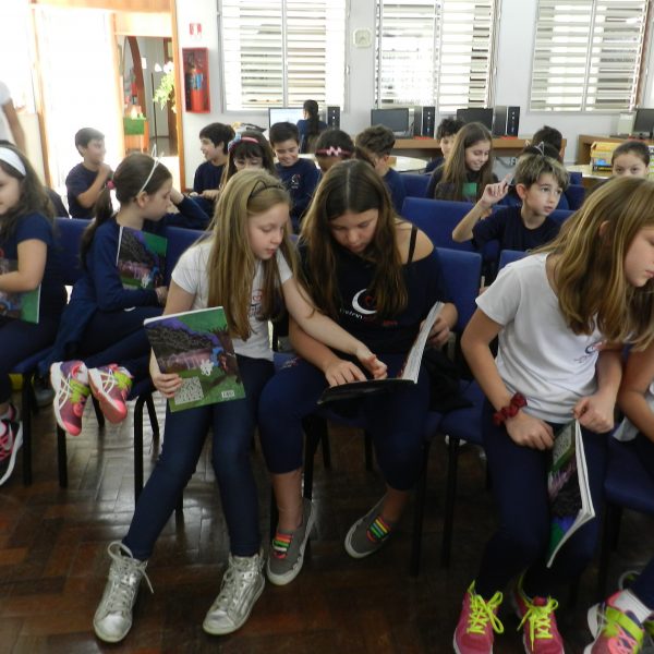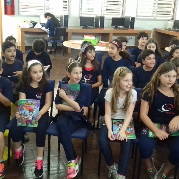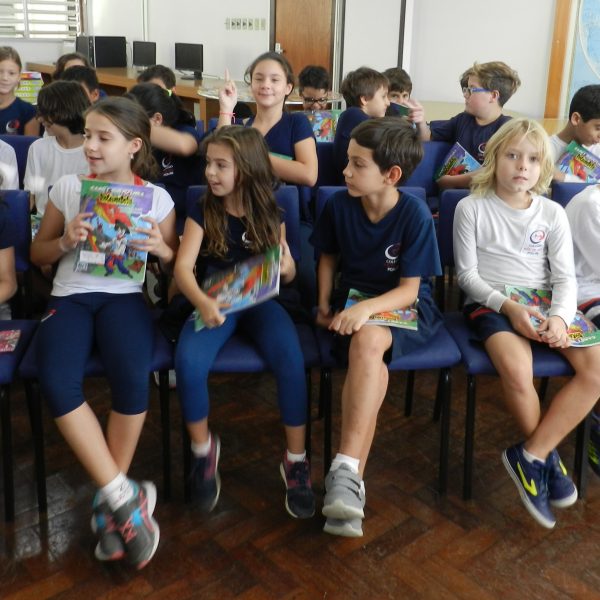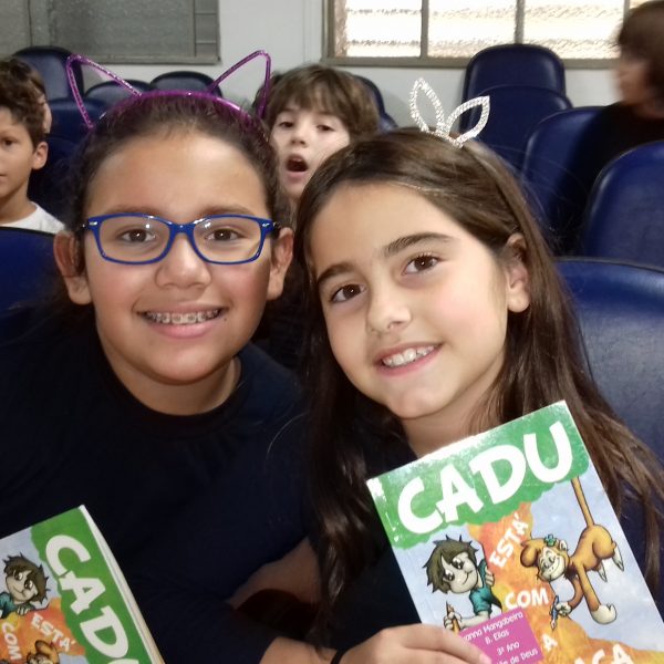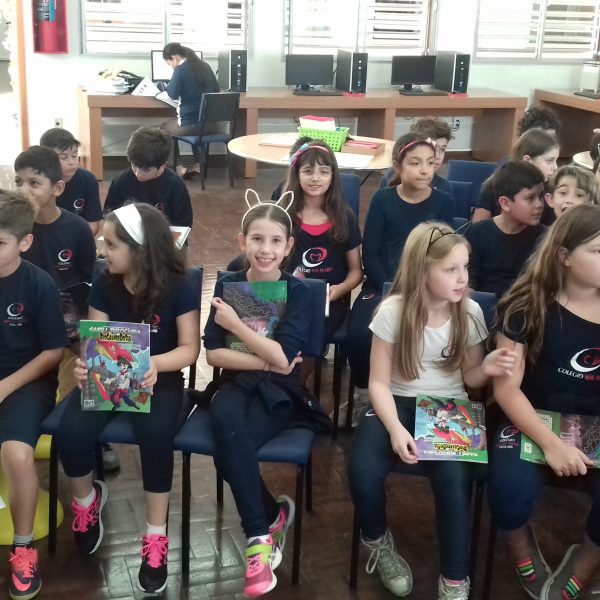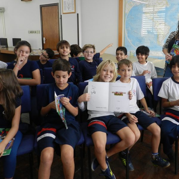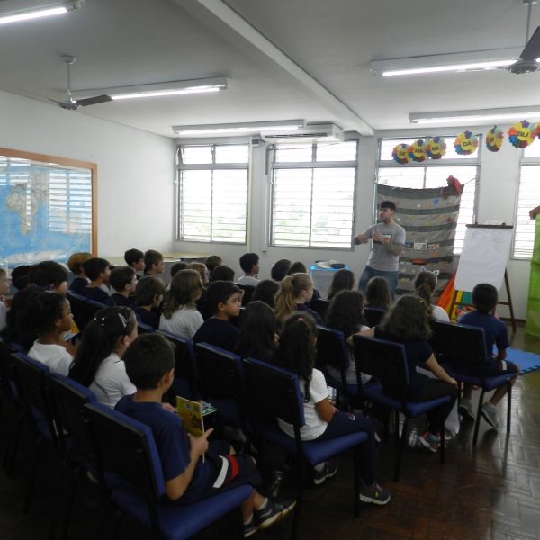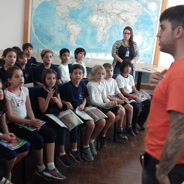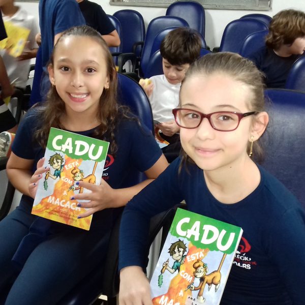 Durante a Semana da Biblioteca, recebemos a presença do escritor Carlos Augusto Pessoa Brum que veio contar um pouco das aventuras do “Cadu com a macaca” e “Cadu procura no Rio Grande do Sul” para os alunos do 3º e 4º ano do Ensino Fundamental.