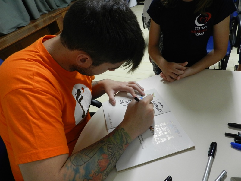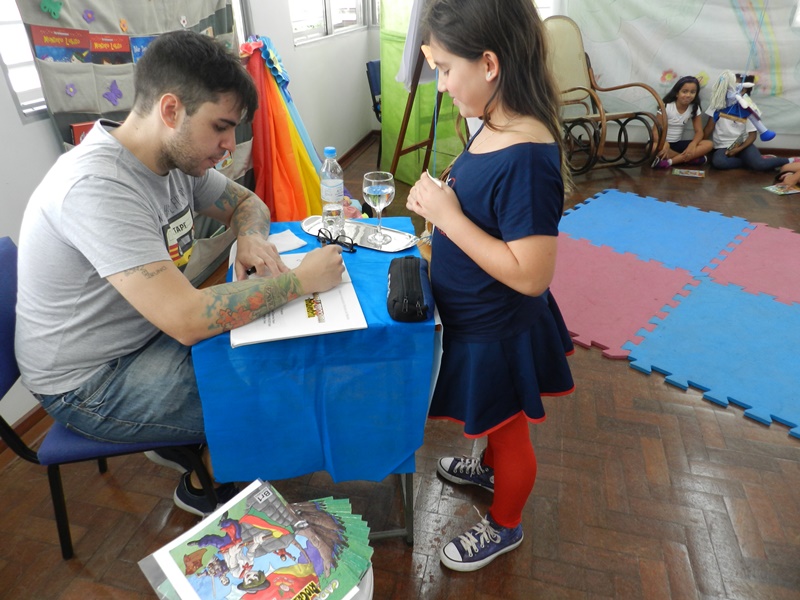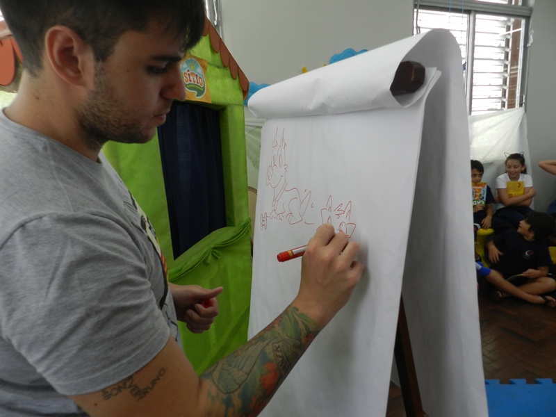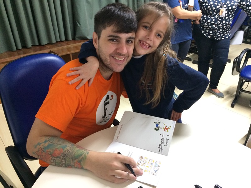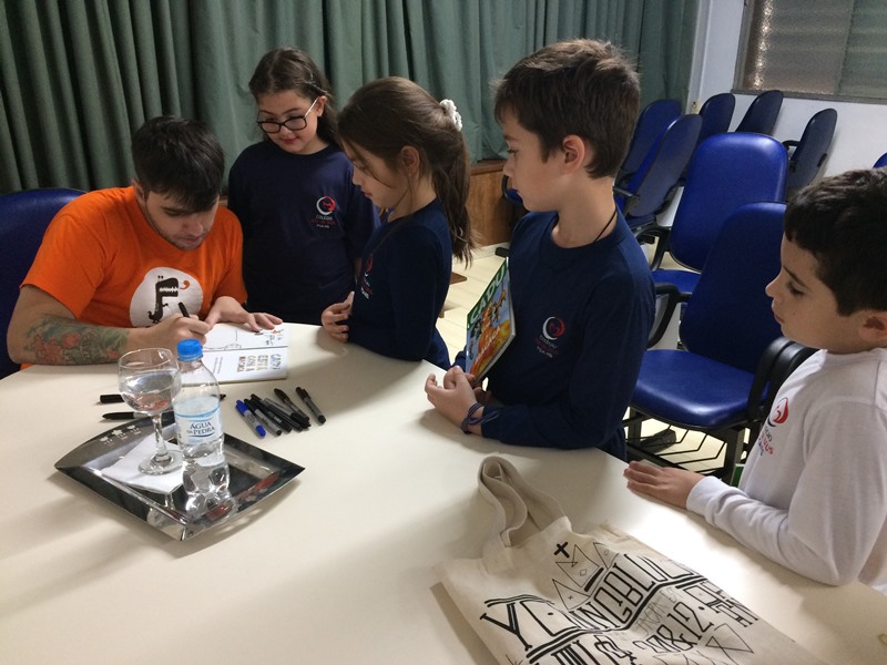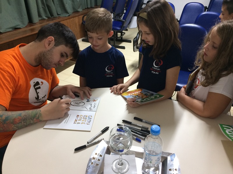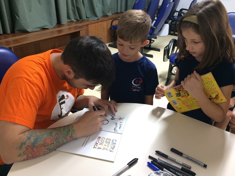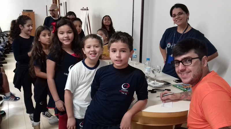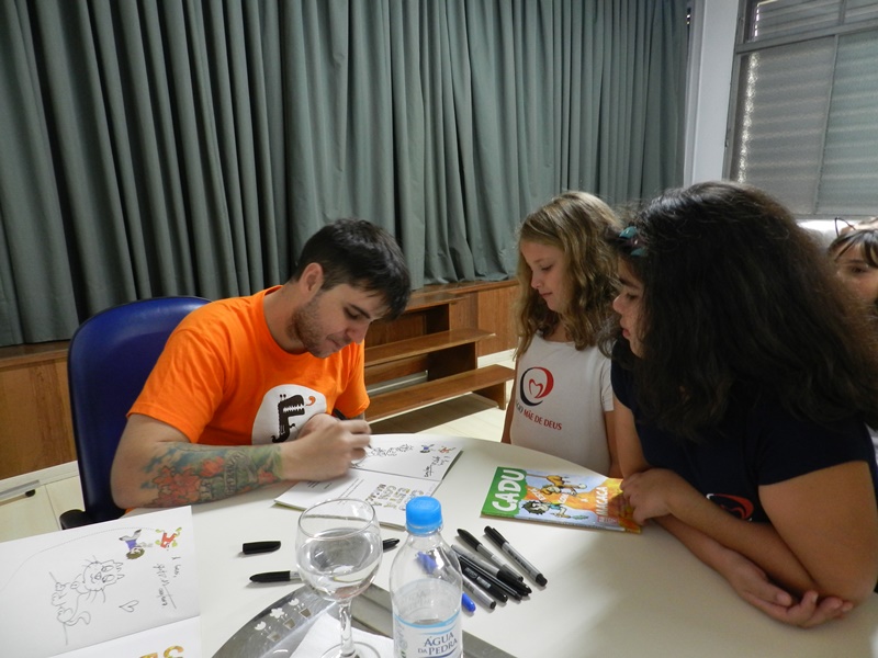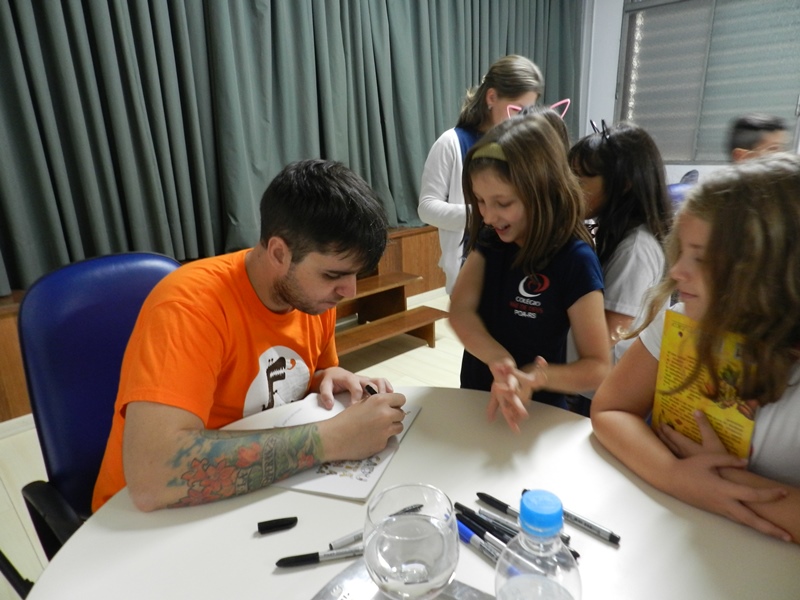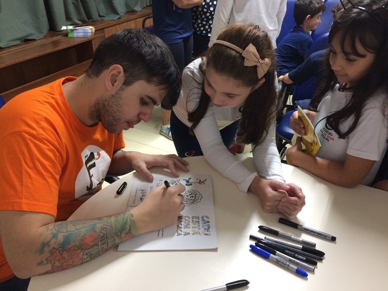 As crianças puderam interagir com o escritor e ilustrador que aproveitou o encontro para fazer vários desenhos e encantar os alunos com o seu talento.