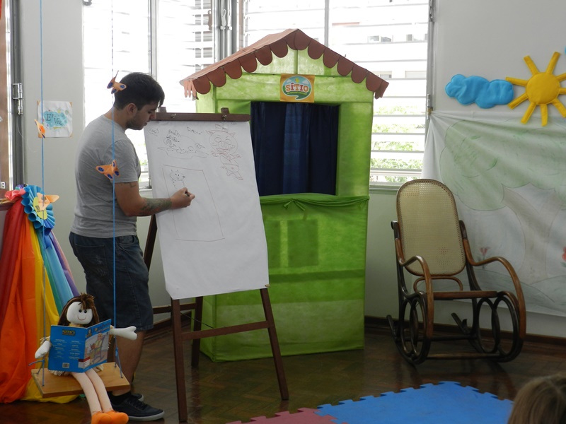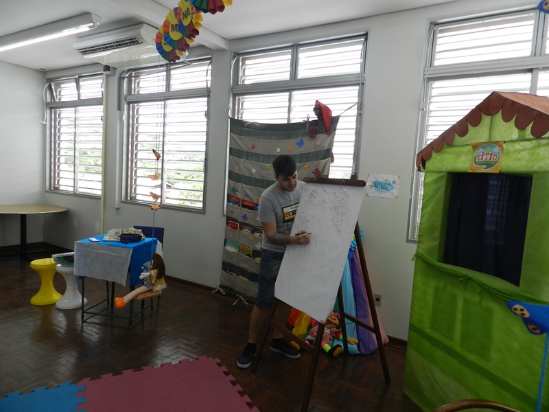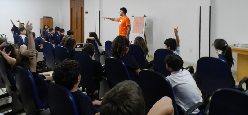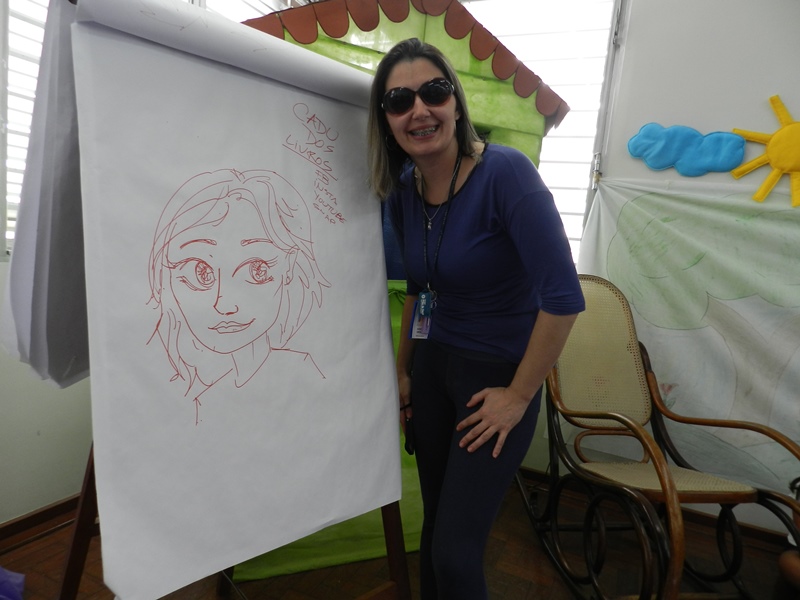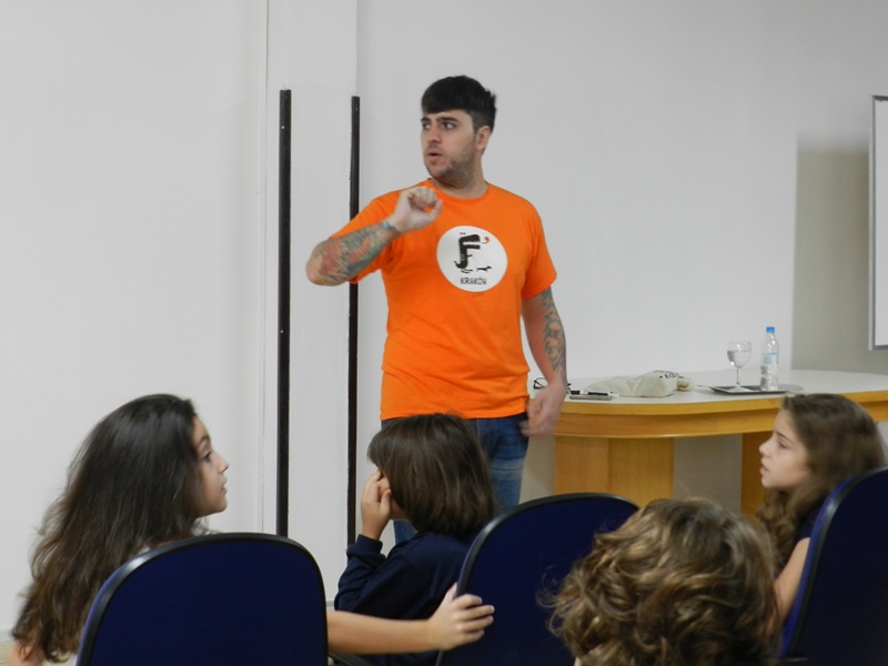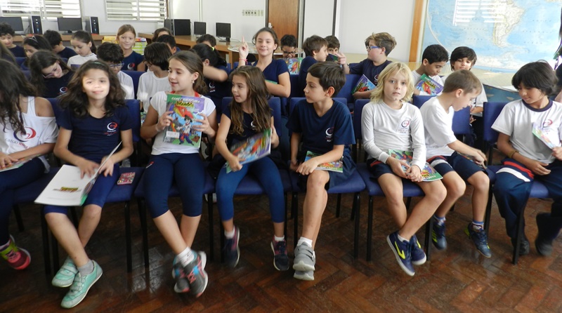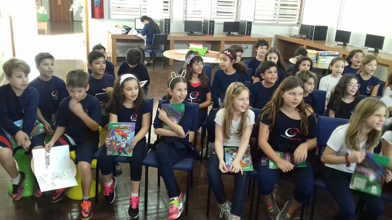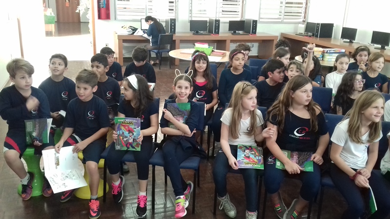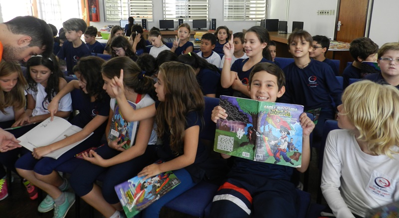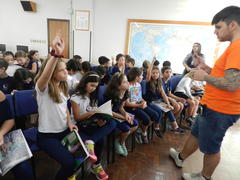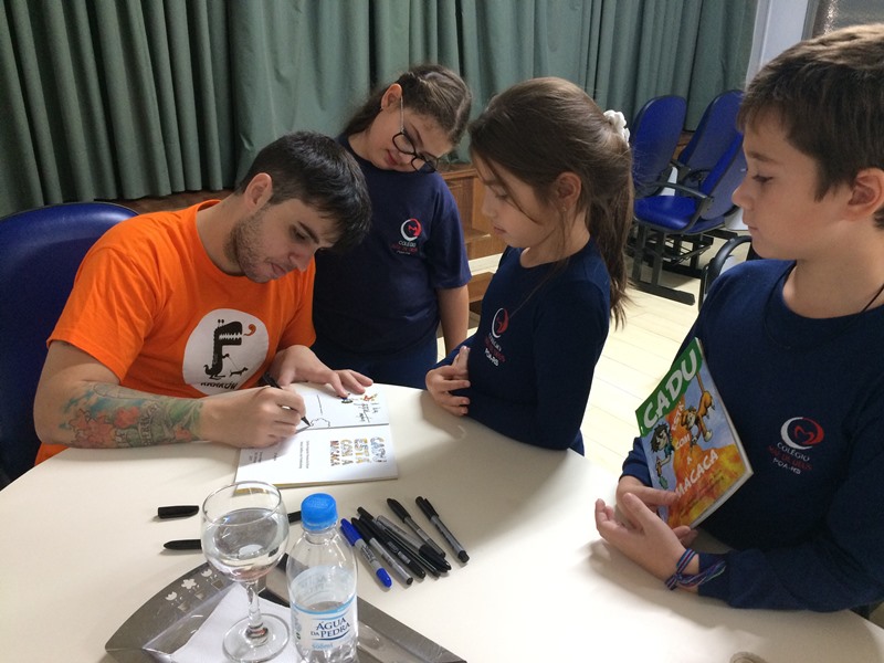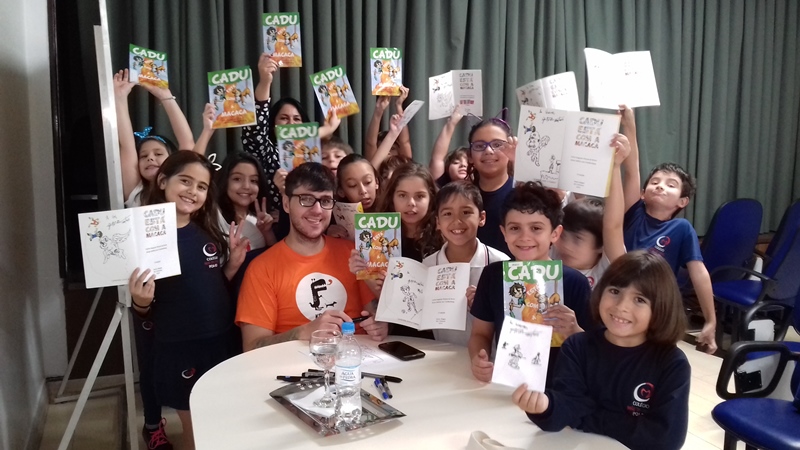 As crianças puderam interagir com o escritor e ilustrador que aproveitou o encontro para fazer vários desenhos e encantar os alunos com o seu talento.