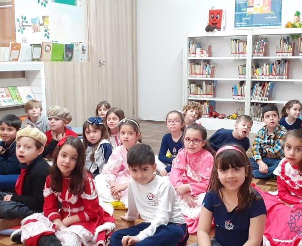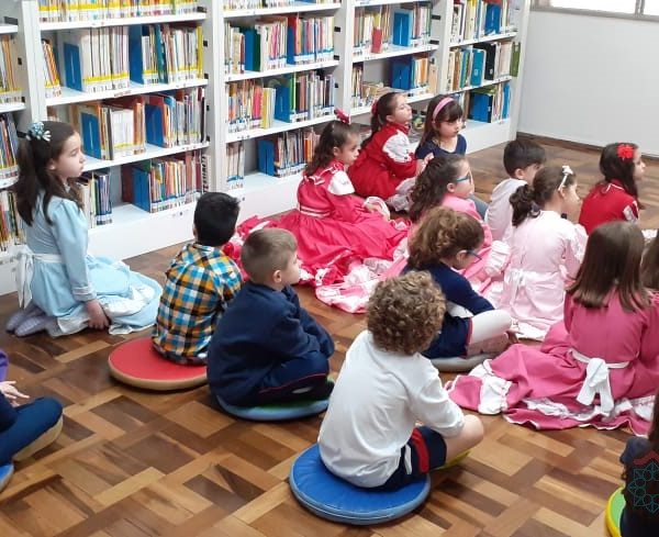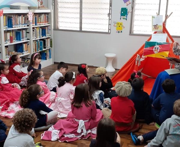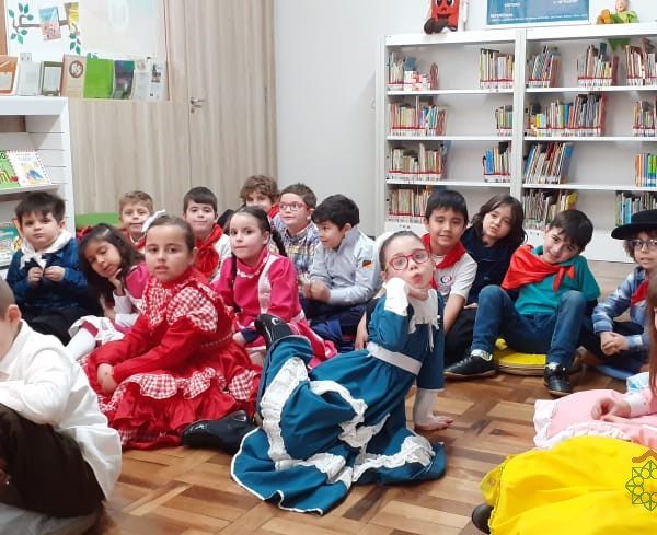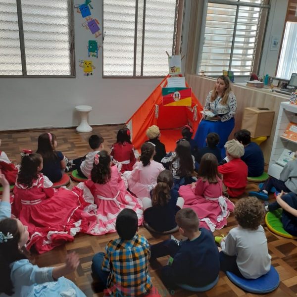 Na hora do conto as turmas da Educação Infantil ao 1° ano dos Anos Iniciais do Ensino Fundamental, foram recebidas no setor infantil pela Prenda e pelo Peão, símbolos da nossa cultura, que contaram para as crianças a lenda da Erva-Mate do livro da Léia Cassol “Um quero-quero me contou…”. Além disso, as crianças cantaram músicas gaúchas e trocaram experiências muito divertidas.
