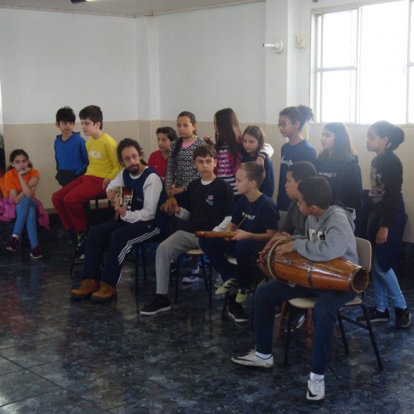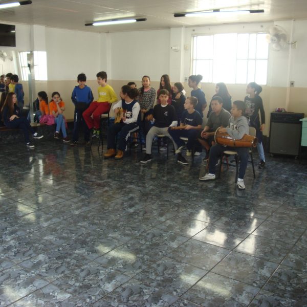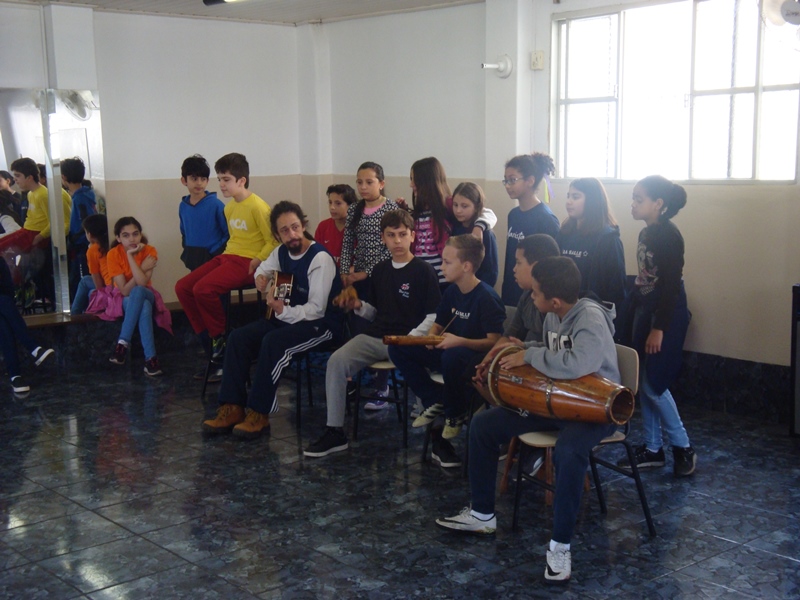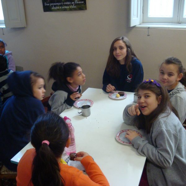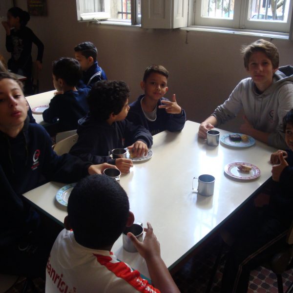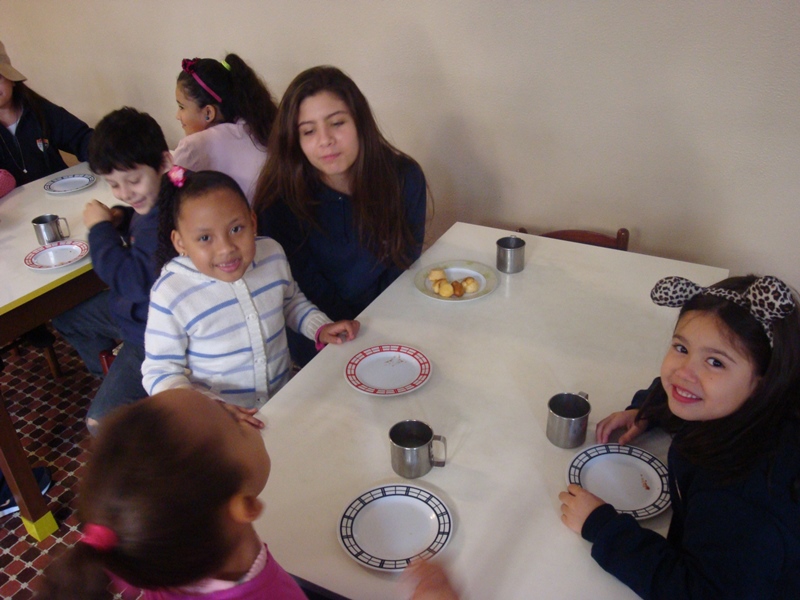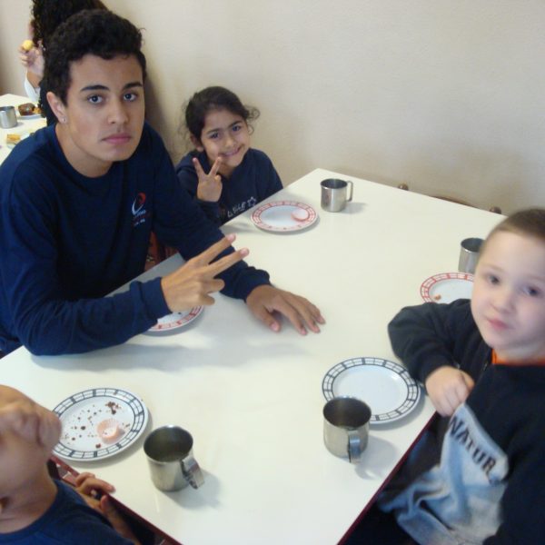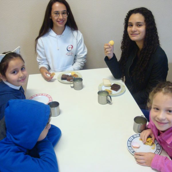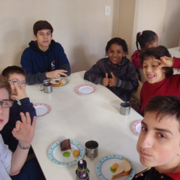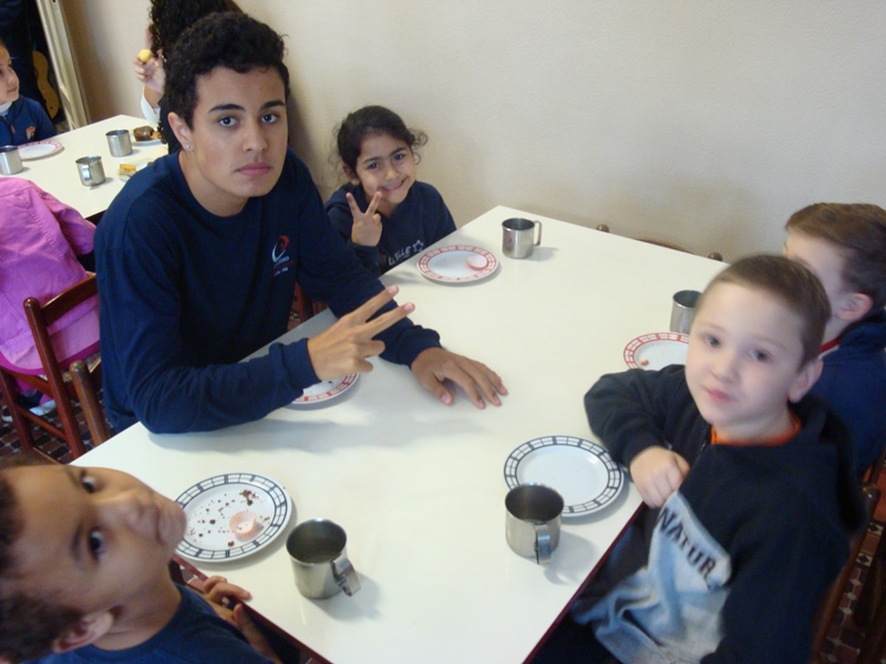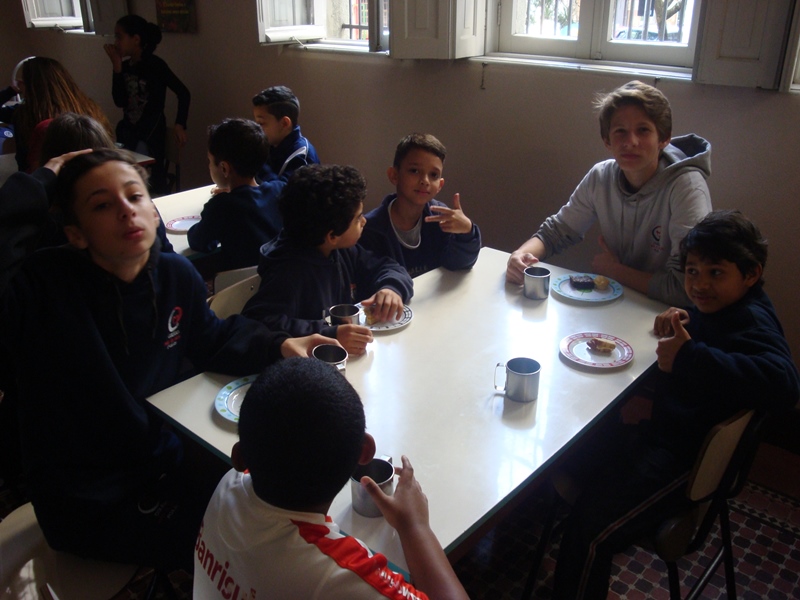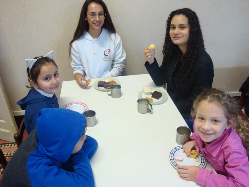 Os estudantes compartilharam um gostoso lanche, preparado por eles, e também participaram, junto com as crianças, de duas oficinas: composição musical e esportes.
