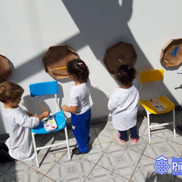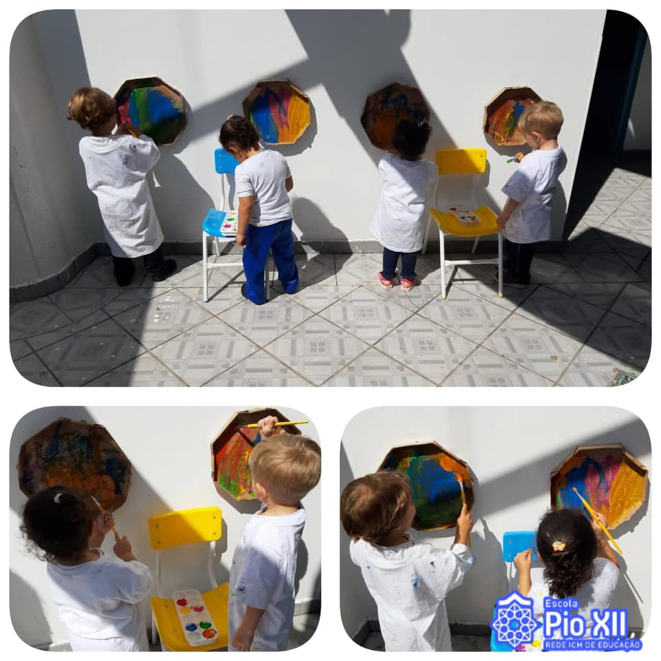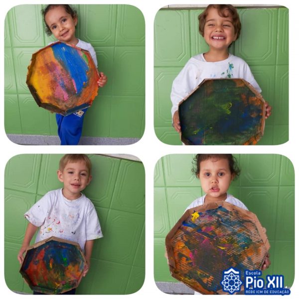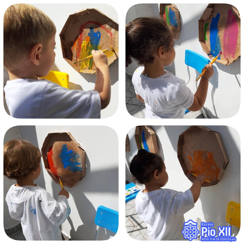 Os nossos grandes artistas, Maternal/Manhã, utilizaram as caixas de pizza para explorar as cores, a coordenação motora, a criatividade e a partilha em uma pintura muito divertida.