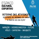 O ECE Pio XII, no dia 13 de julho ( próxima segunda-feira), retornará as atividades respeitando todas s normas de segurança. Foram liberados para esse retorno os seguintes esportes: natação, hidroginástica, futsal, capoeira, vôlei e basquete.