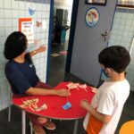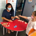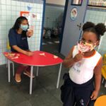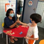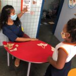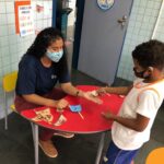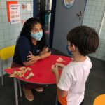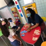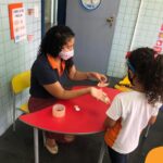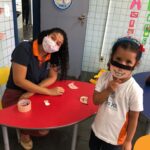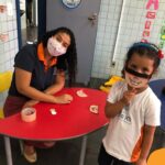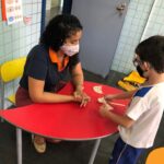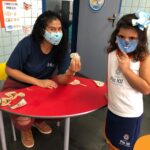 Na atividade, além de refletirem sobre os cuidados que precisamos ter uns com os outros, realizaram a diferenciação de valores e a quantificação, manipulando a moeda de 1 real.