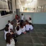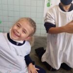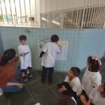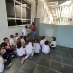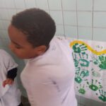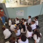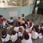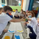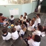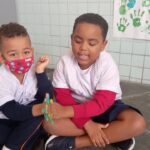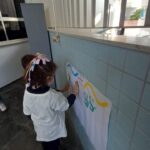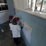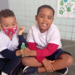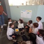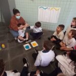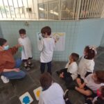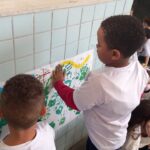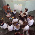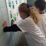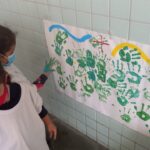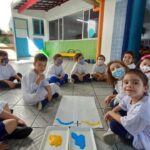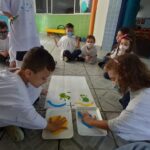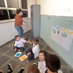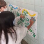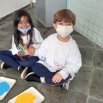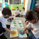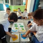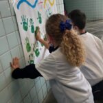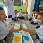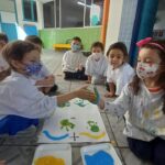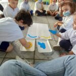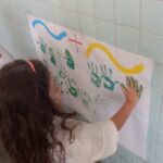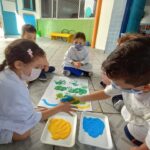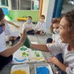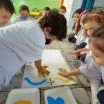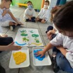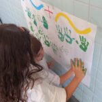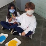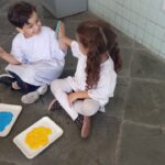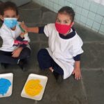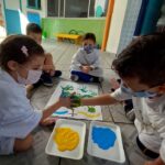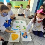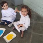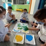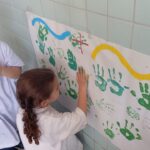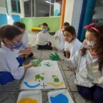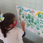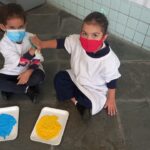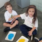As Turma do Pré I – A/B descobriram, colocando a mão na tinta, que misturando yellow e blue temos green! Foi uma aula muito divertida e criativa!