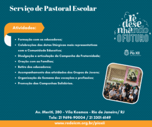 Enfim, a Pastoral Escolar procura ser motivadora na construção conjunta de um projeto de evangelização em que os profissionais da educação e os alunos são protagonistas, seja na evangelização ou na prática da solidariedade (Projeto Educativo – ICM, p. 60). Todos juntos, caminhando para a construção de uma ESCOLA EM PASTORAL.