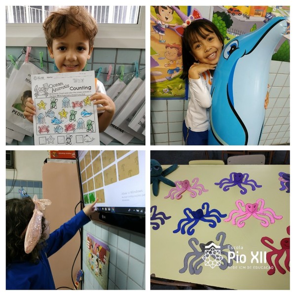 As turmas da Educação Infantil abordaram o tema: Sea Animals (Animais Marinhos) . Através de vídeos, músicas, atividades teóricas, massinha e moldes dos animais, os alunos aprenderam sobre a importância da fauna marinha, e reforçaram o aprendizado das cores e números em Inglês.