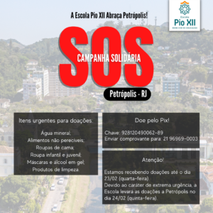 A Escola Pio XII conclama toda a Comunidade Escolar para realizar a maior corrente de solidariedade possível. Com a ajuda de todos, poderemos trazer um pouco de alívio para as pessoas afetadas com o desastre. Pedimos o engajamento de todos, educadores, alunos e familiares.