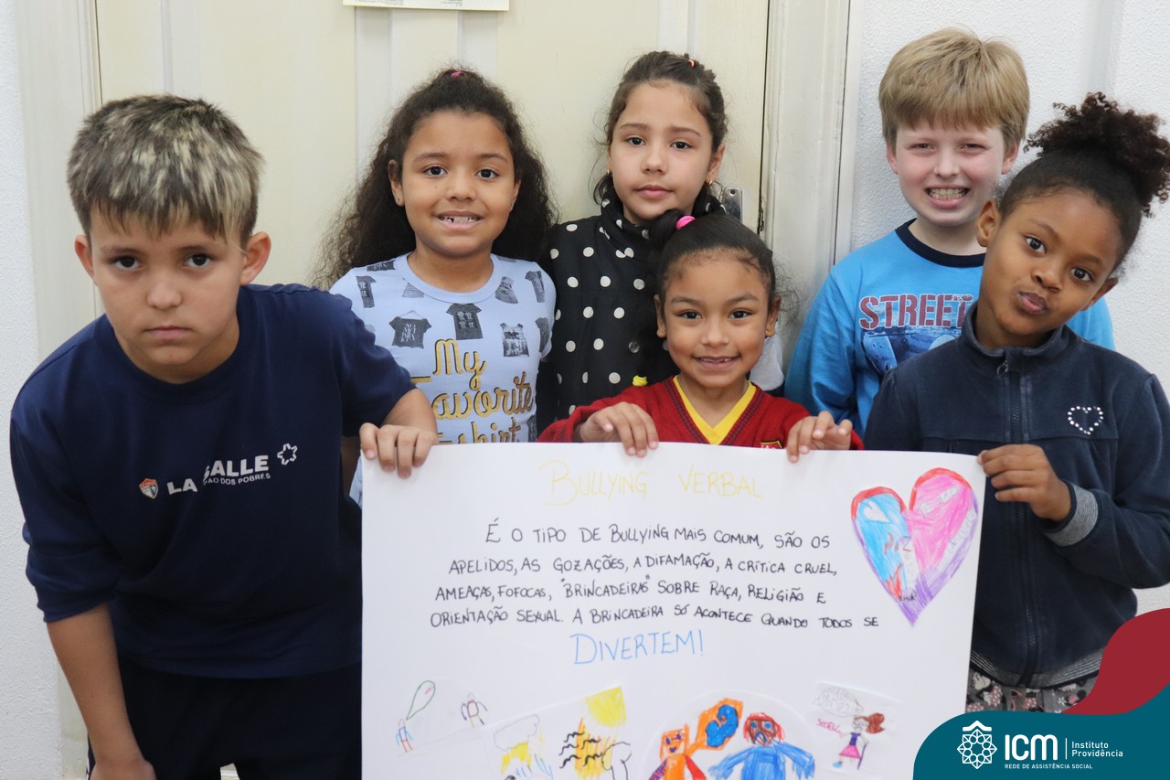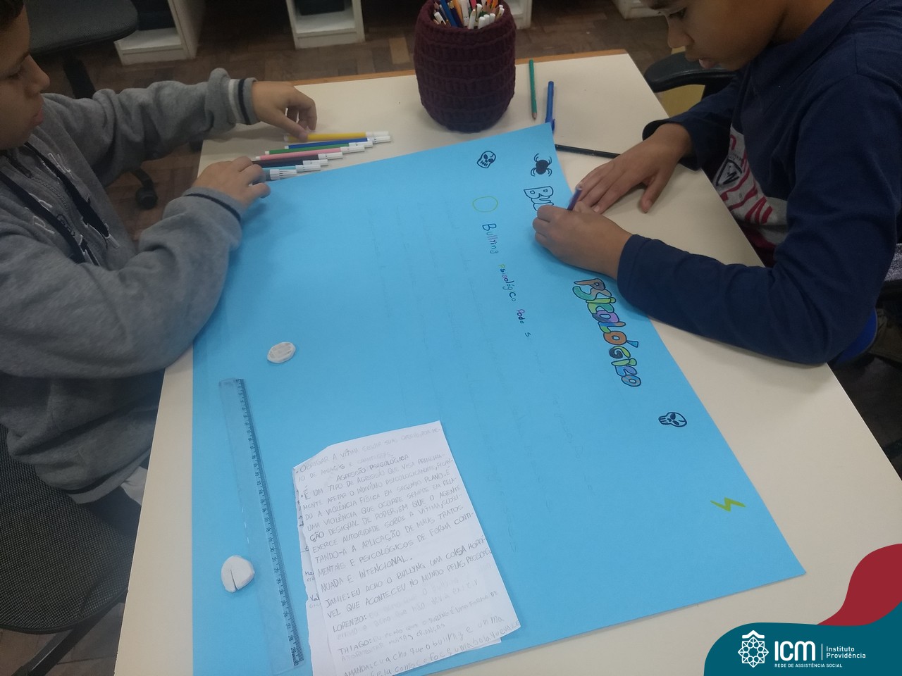 Cada grupo do SCFV ficou responsável por trazer informações sobre um tipo de bullying, onde os mesmos trouxeram relatos, sugestões e explicações sobre o assunto. Para finalizar as pesquisas e rodas de conversas, realizaram cartazes para ficarem expostos pela Instituição.
