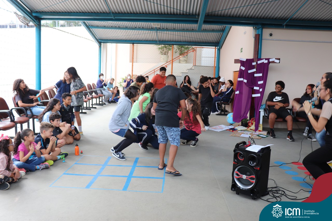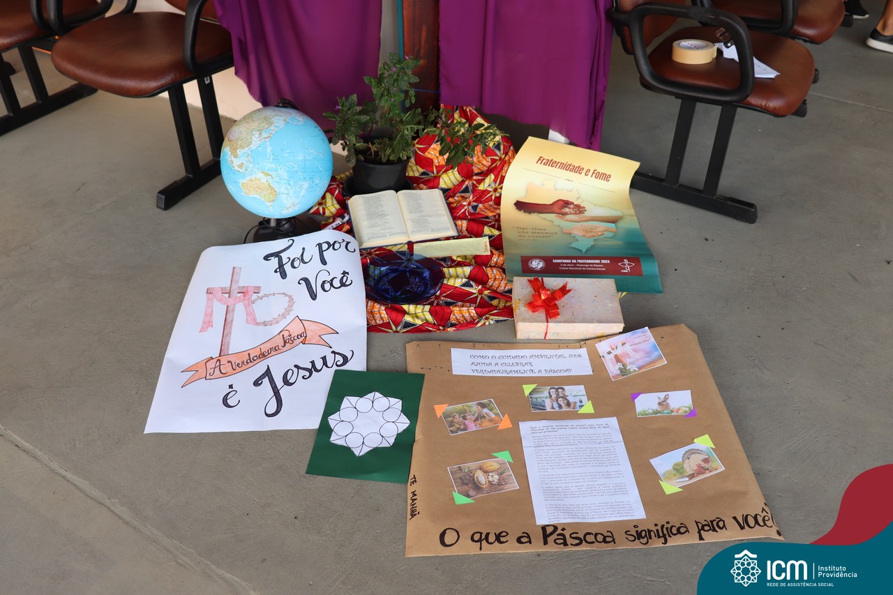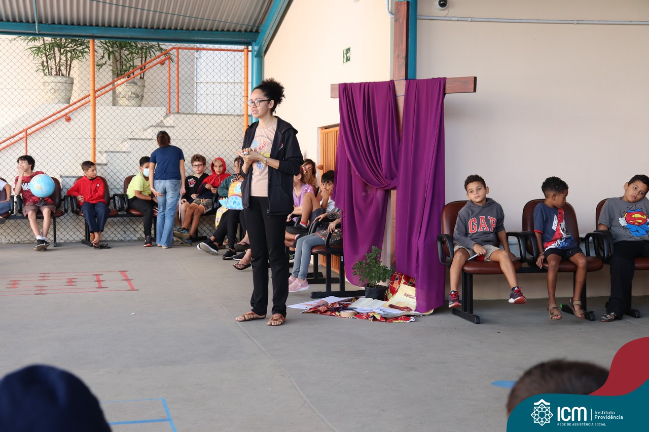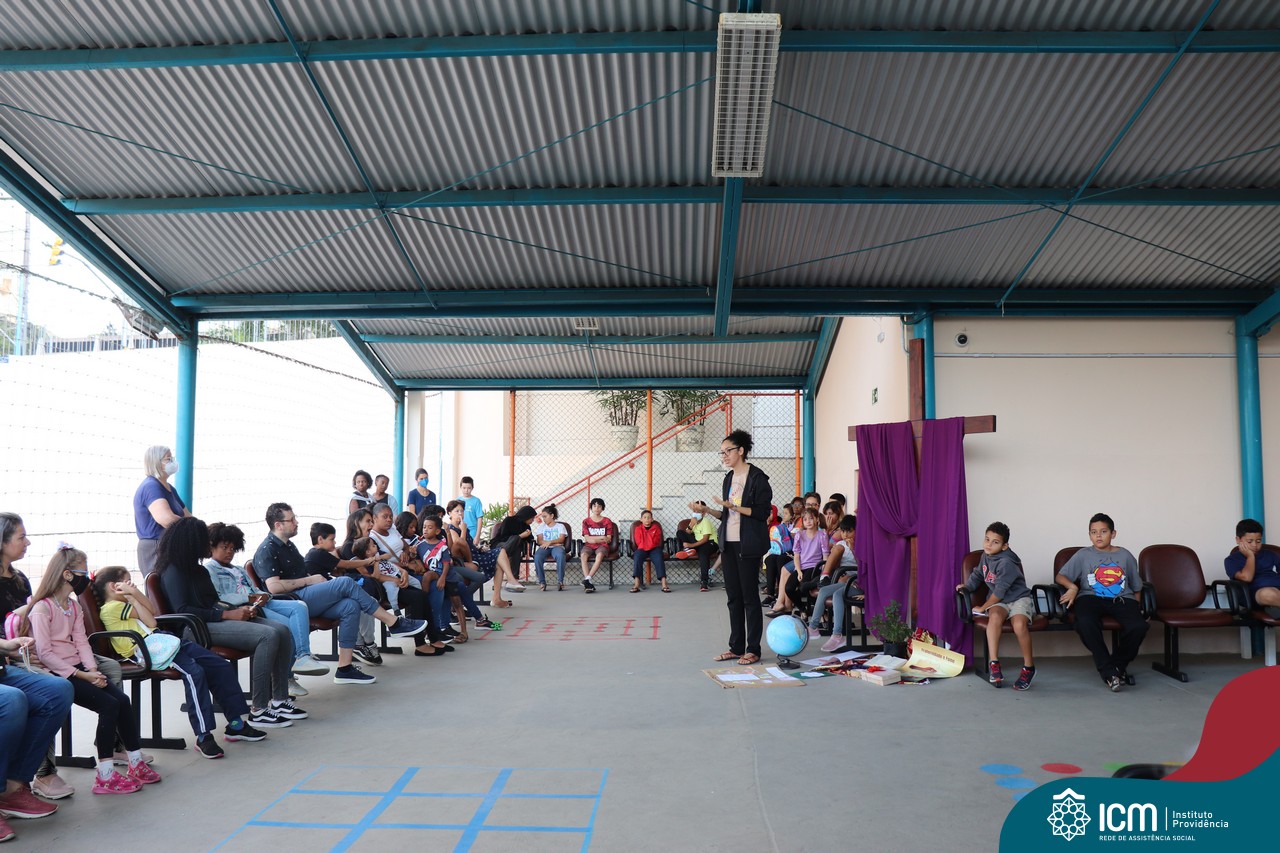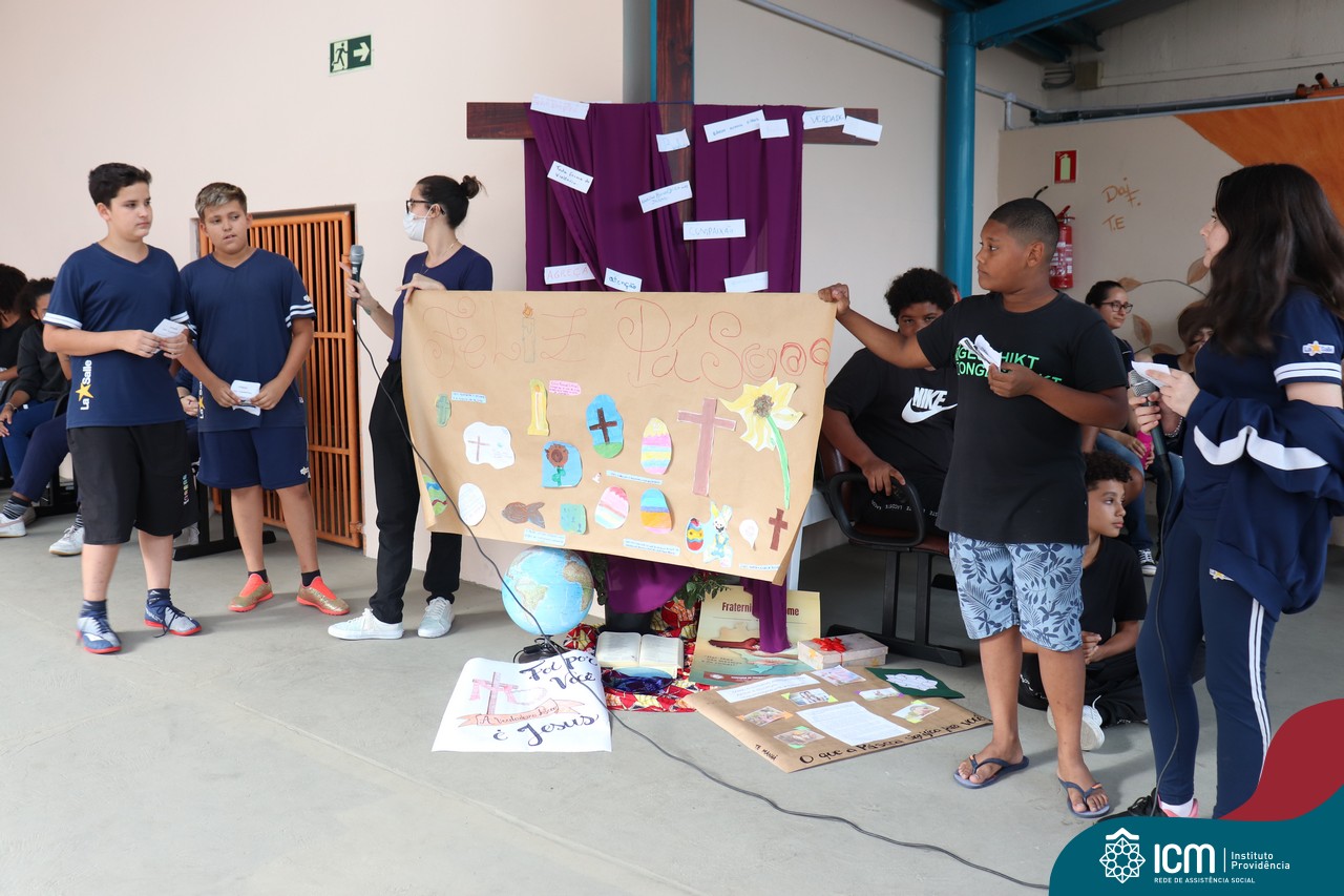 Os pais e responsáveis puderam contribuir de forma espontânea falando sobre realidades do mundo atual que entristece nossa celebração. Houve apresentação das crianças e adolescentes sobre símbolos que representam o momento de Páscoa. Tivemos um lanche especial e o refeitório foi enfeitado para a ocasião.
