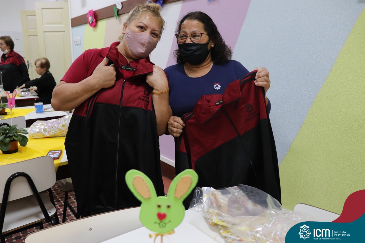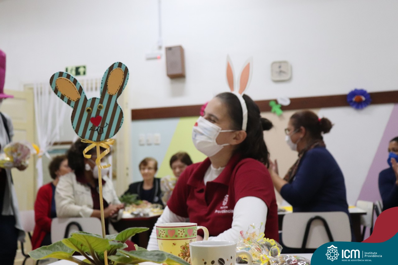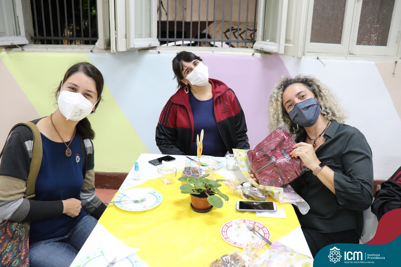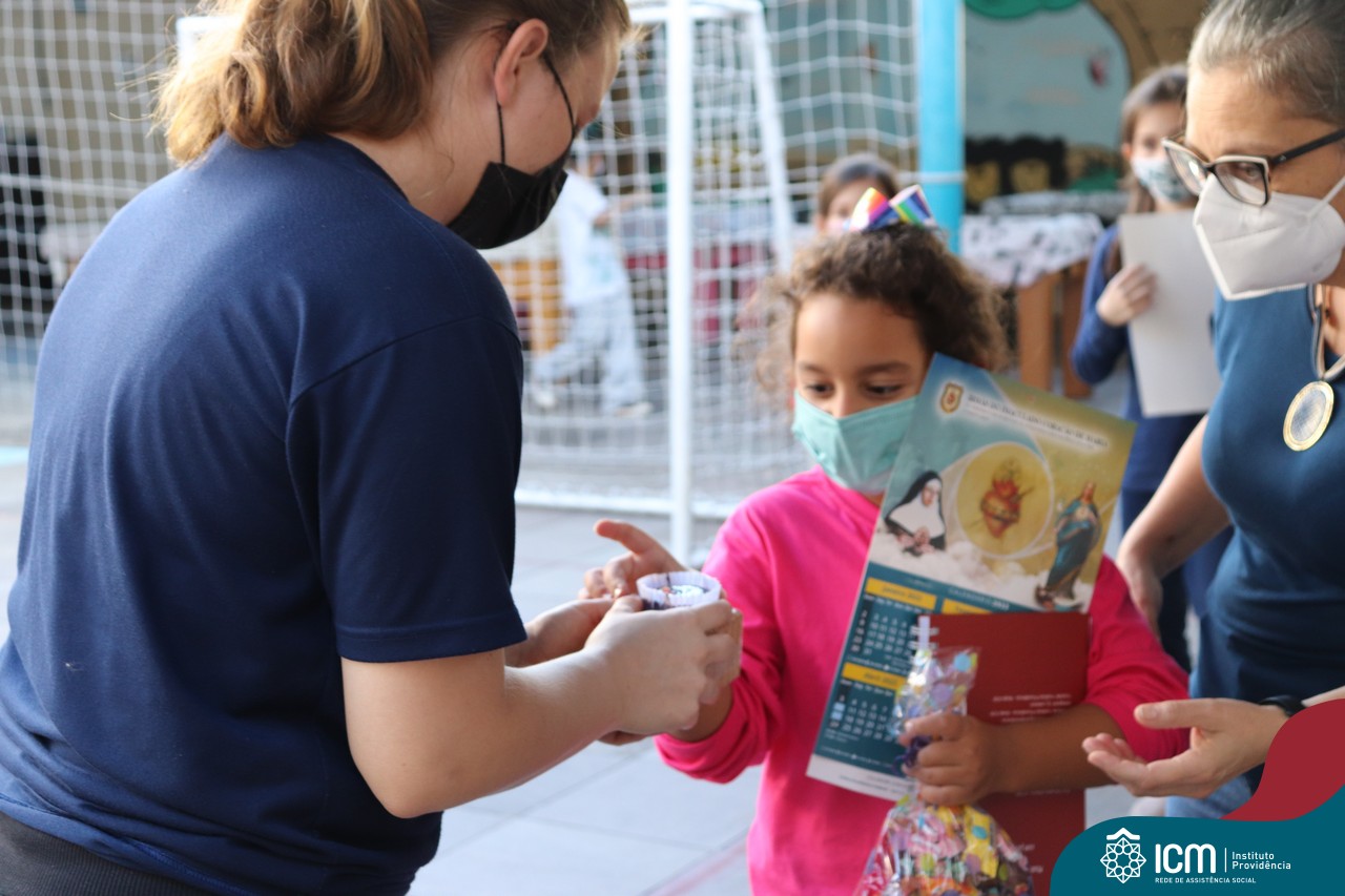 Neste ano a comemoração da Páscoa com as crianças e adolescentes do Serviço de Convivência e Fortalecimento de Vínculos foi realizada através de atividades com a Pastoral, a respeito do significado deste dia festivo e com um delicioso “salchipão”. Receberam também um mimo com doces e cadernos personalizados do Instituto Providência. A equipe de colaboradores esteve reunida para uma Celebração Eucarística, presidida pelo Frei Ivo Bortoluz (Ordem dos Carmelitas Descalços) e confraternizou em clima de alegria pascal.