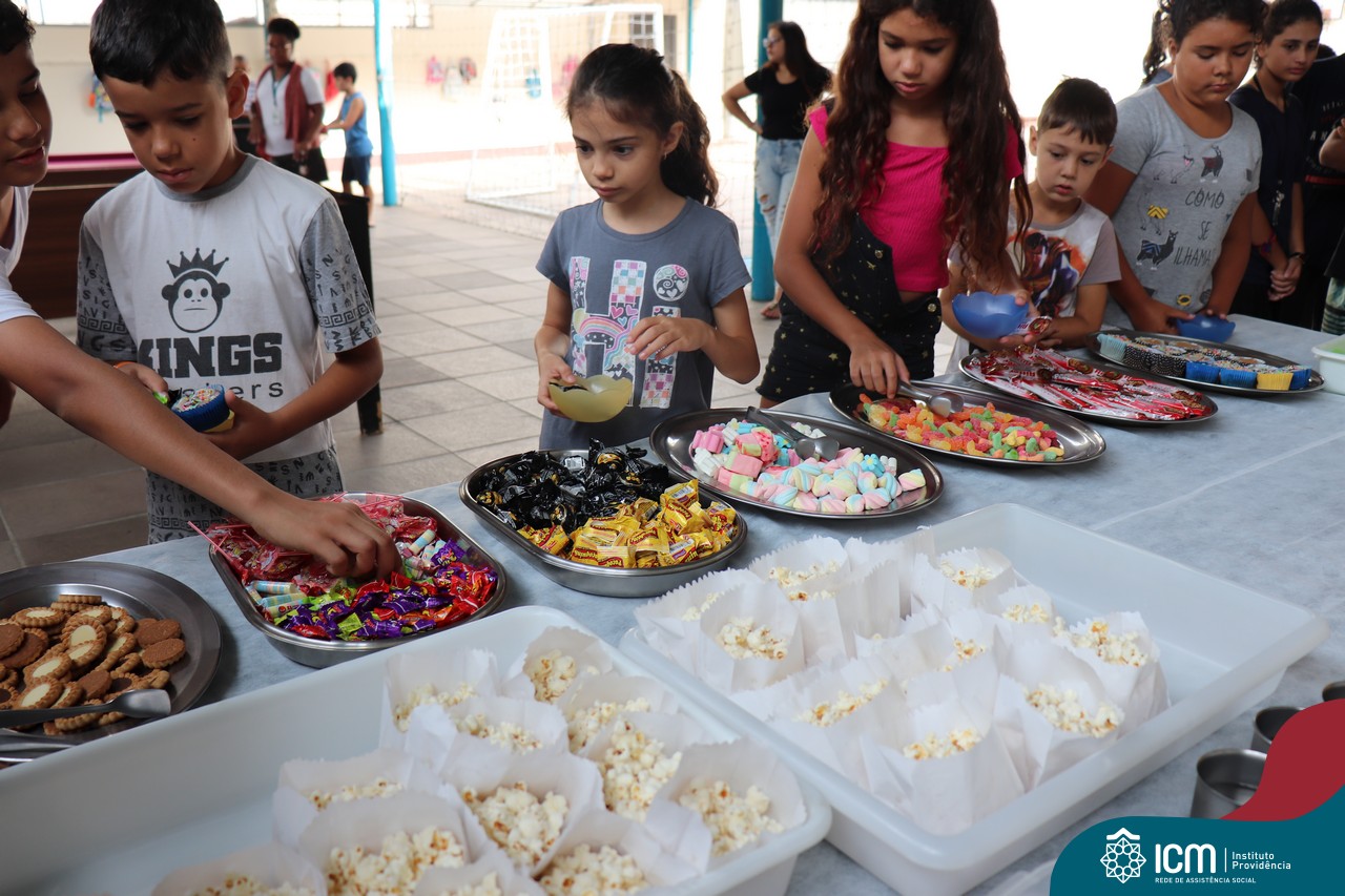 No primeiro momento foi realizado um lanche bem especial, com muitas guloseimas, pipoca e suco.