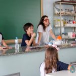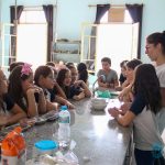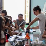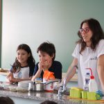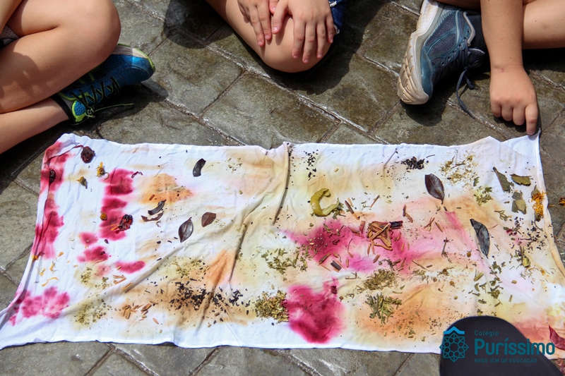 Por fim, fez uma experiência com as crianças. Solicitou que levassem diversos elementos naturais, como folhas, flores, cascas de legumes etc., e colocaram em um tecido de algodão orgânico. Esse tecido foi enrolado, fervido e, no dia seguinte, as crianças abriram para ver que cores resultaram de seus elementos naturais.