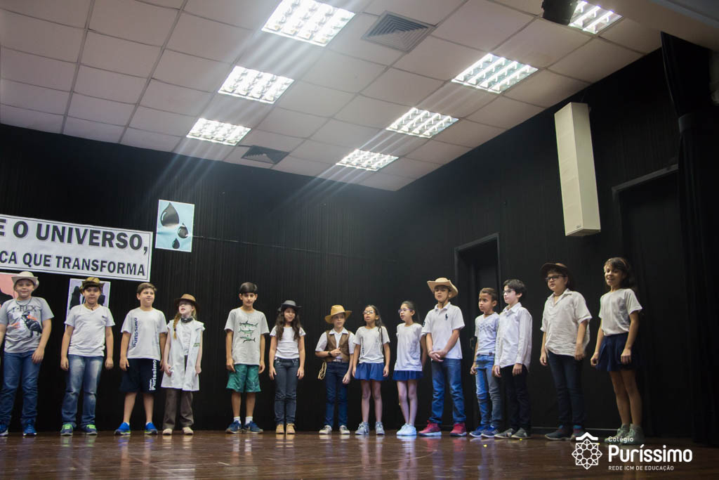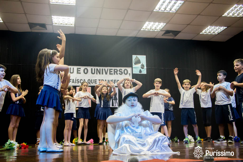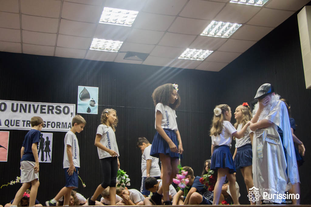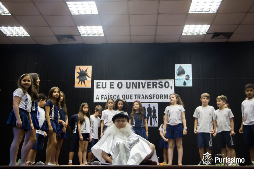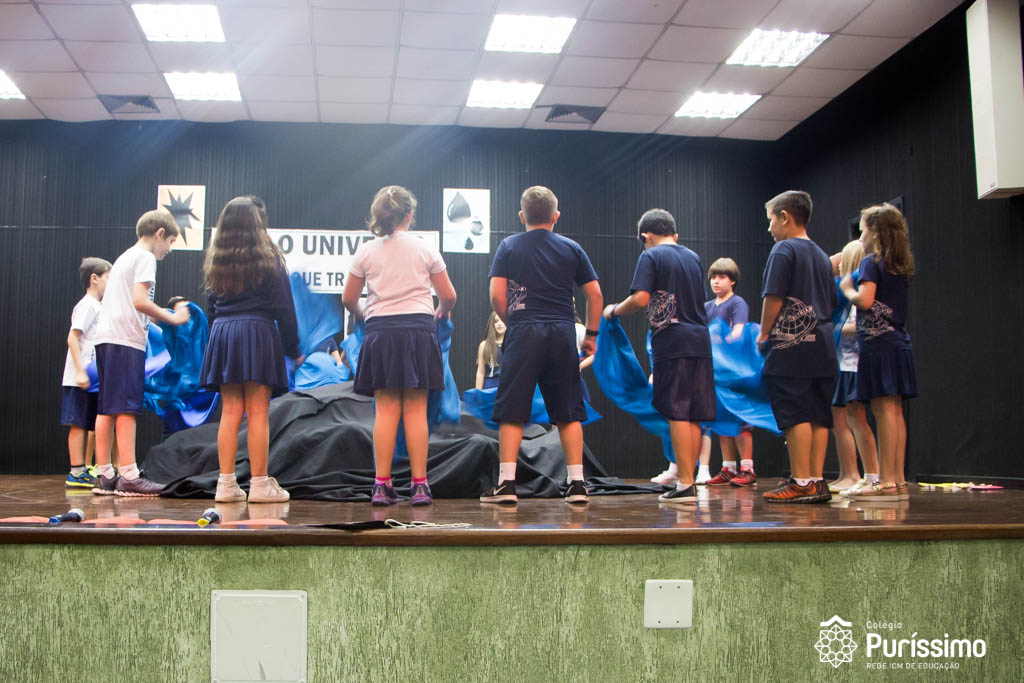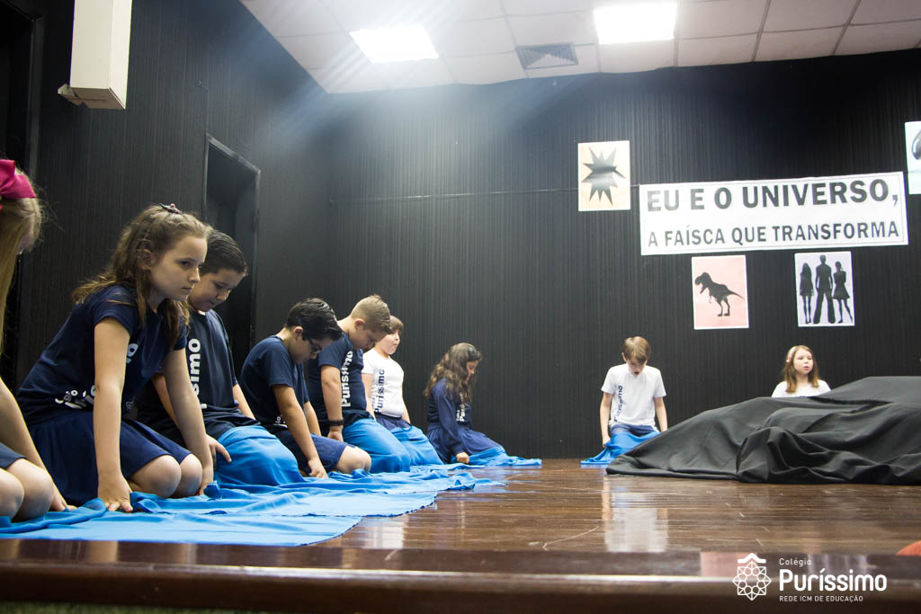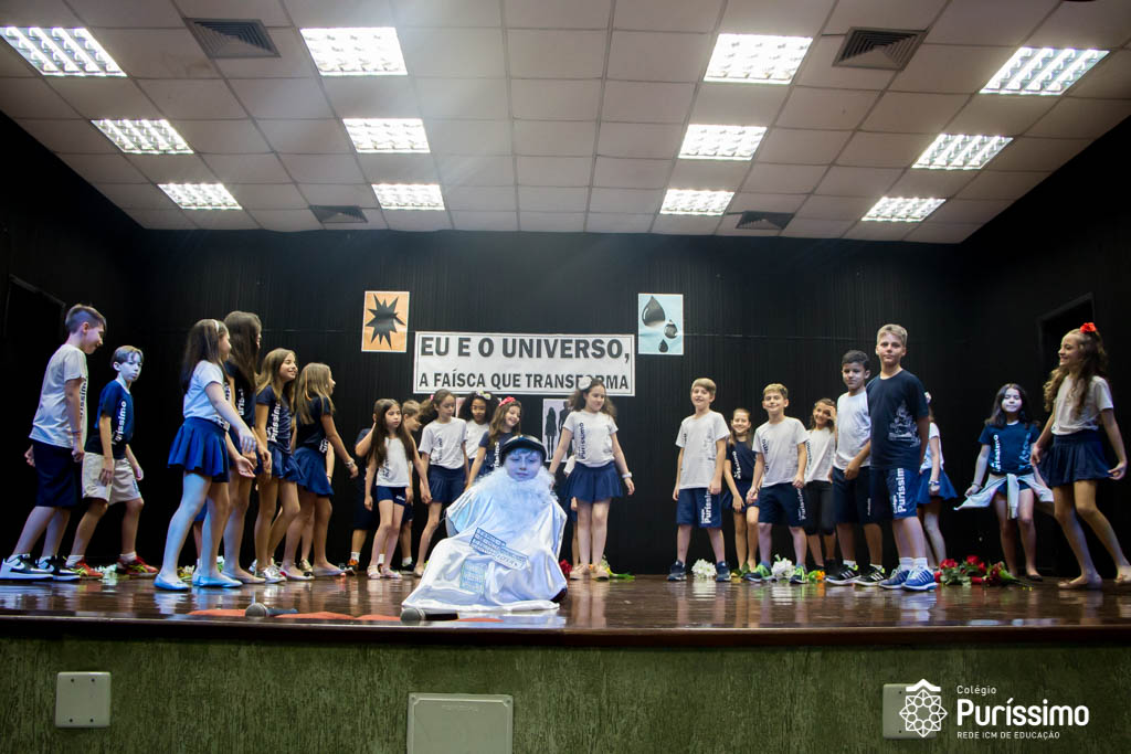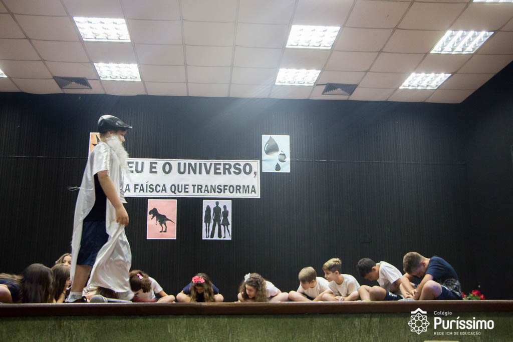 Os alunos dos quartos anos fizeram uma belíssima apresentação de palco na última sexta-feira, 22, com músicas, danças, poesias, gravação de vídeos e teatro, levando a plateia para uma viagem às profundezas da nossa história, desde o surgimento do Universo até os dias atuais.