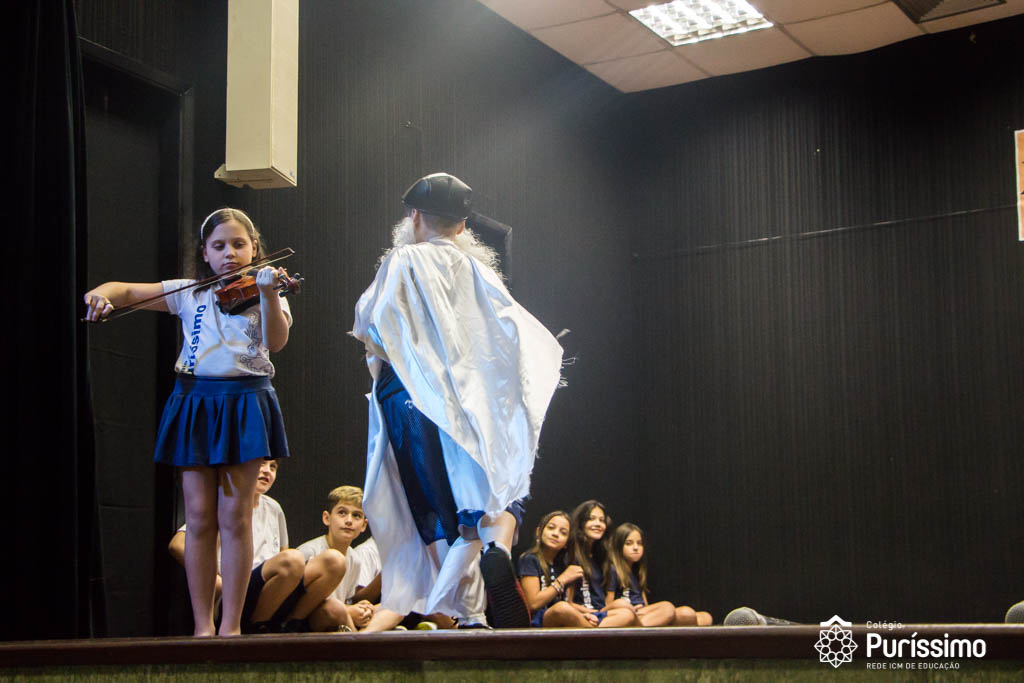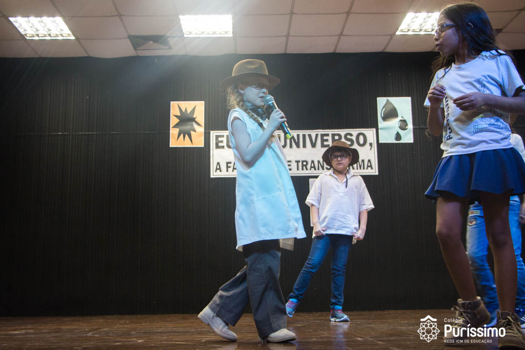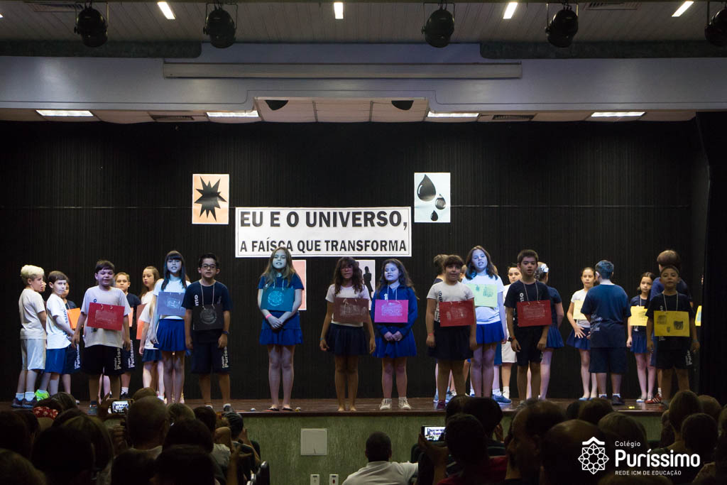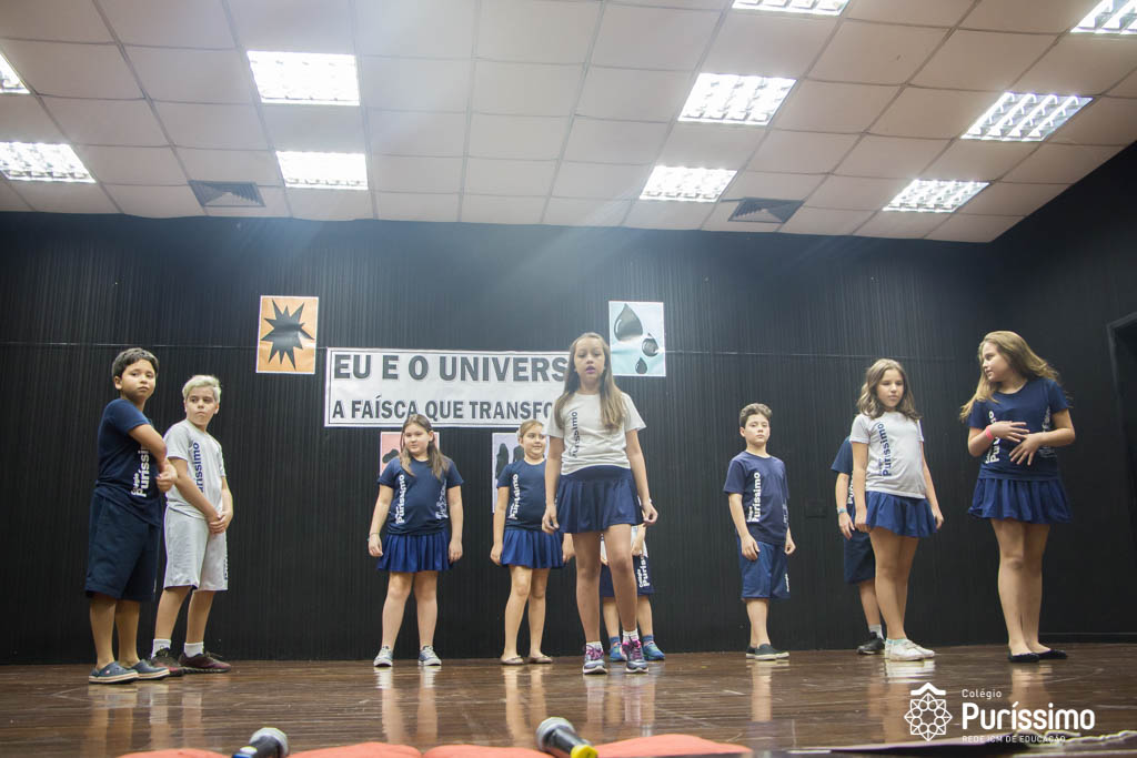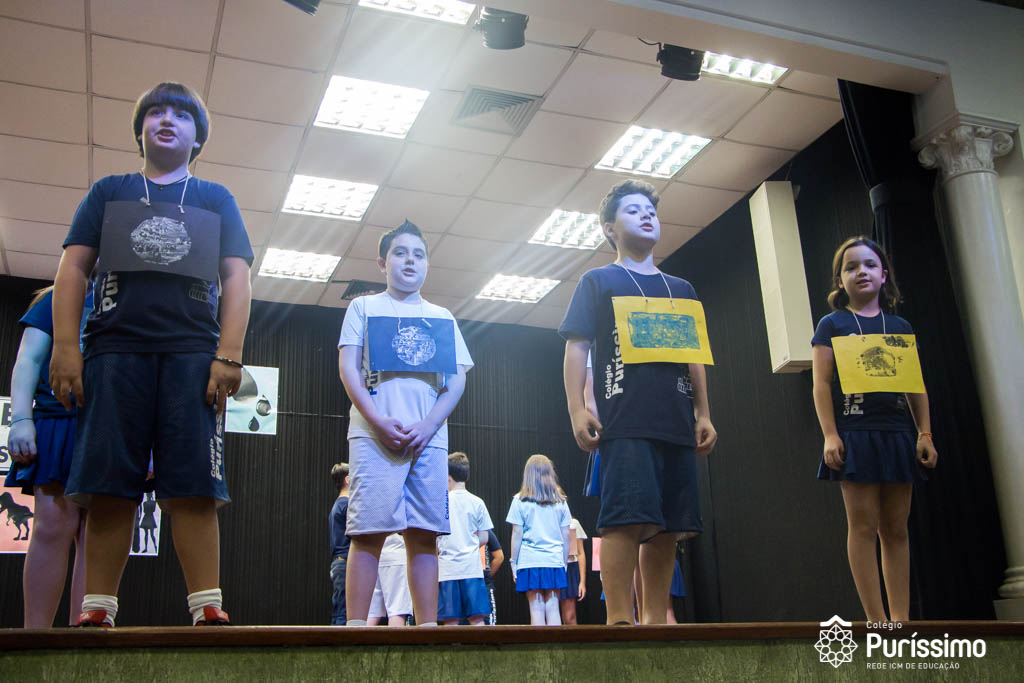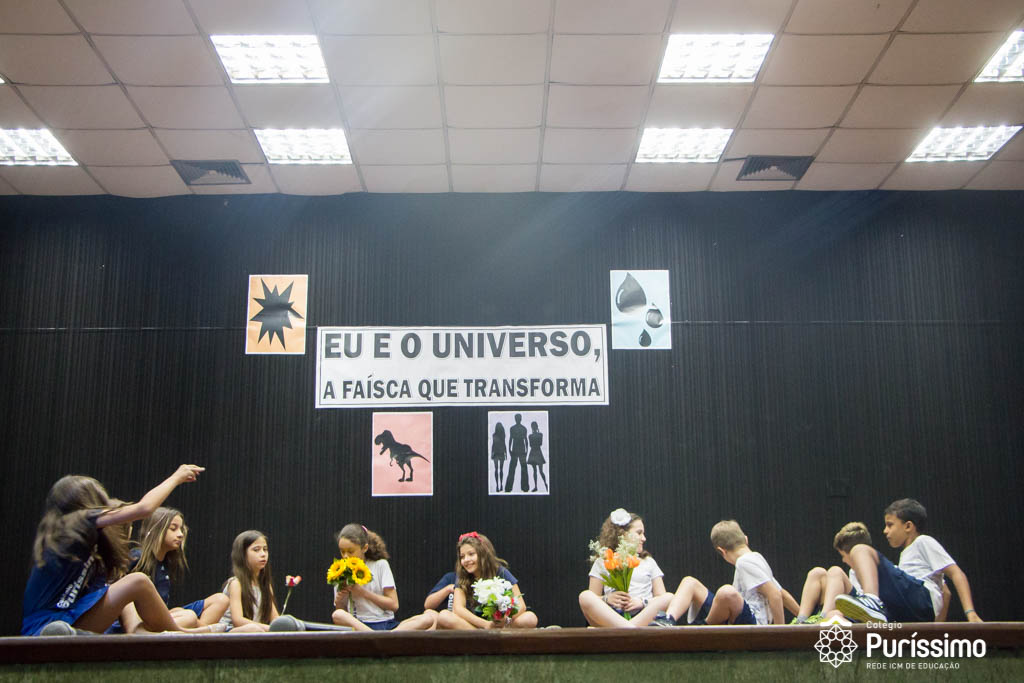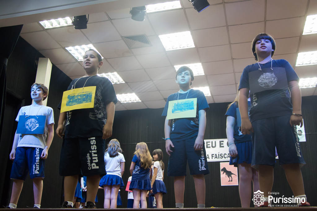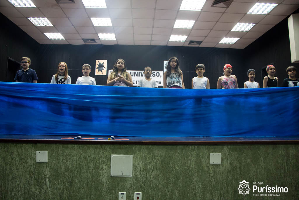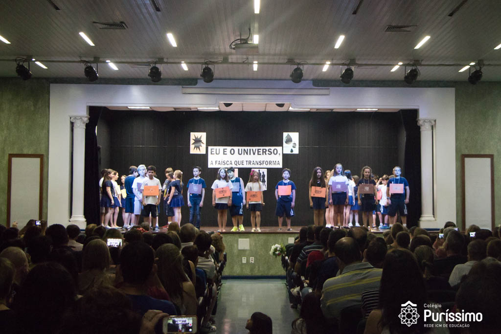 Os alunos dos quartos anos fizeram uma belíssima apresentação de palco na última sexta-feira, 22, com músicas, danças, poesias, gravação de vídeos e teatro, levando a plateia para uma viagem às profundezas da nossa história, desde o surgimento do Universo até os dias atuais.