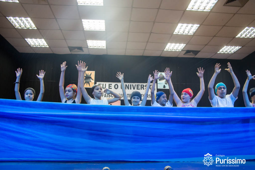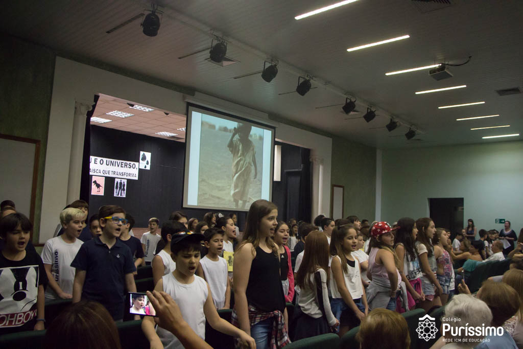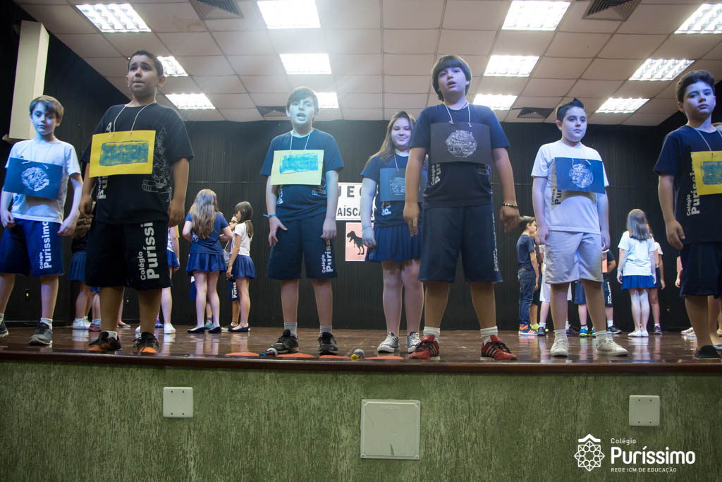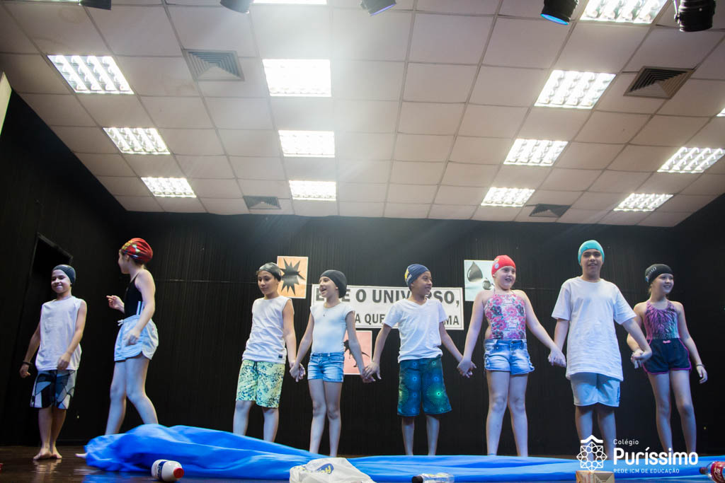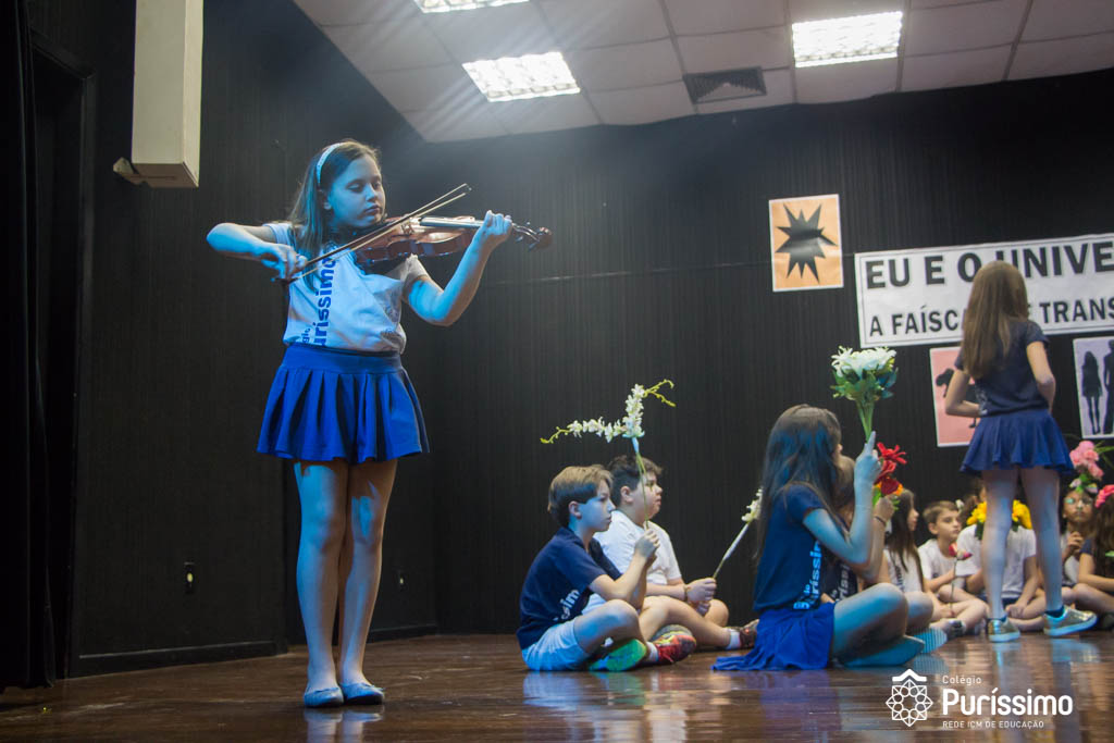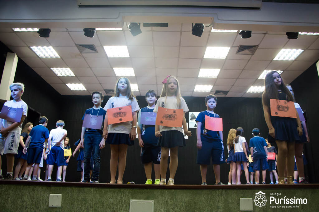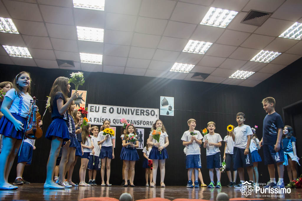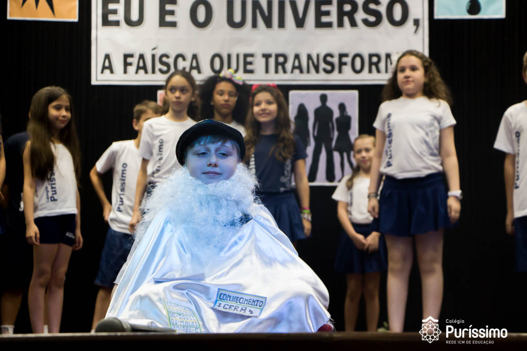 Os alunos dos quartos anos fizeram uma belíssima apresentação de palco na última sexta-feira, 22, com músicas, danças, poesias, gravação de vídeos e teatro, levando a plateia para uma viagem às profundezas da nossa história, desde o surgimento do Universo até os dias atuais.