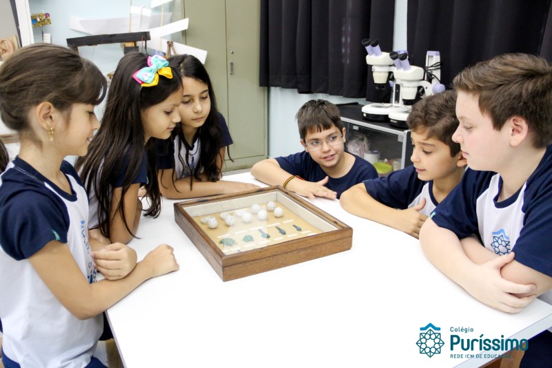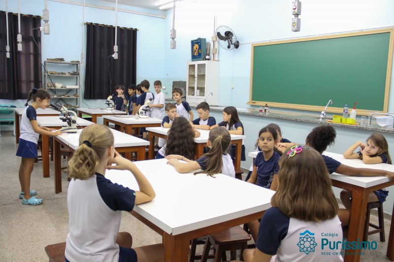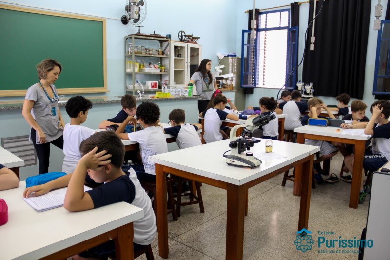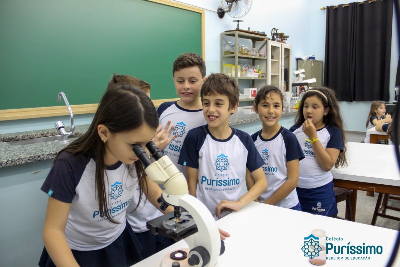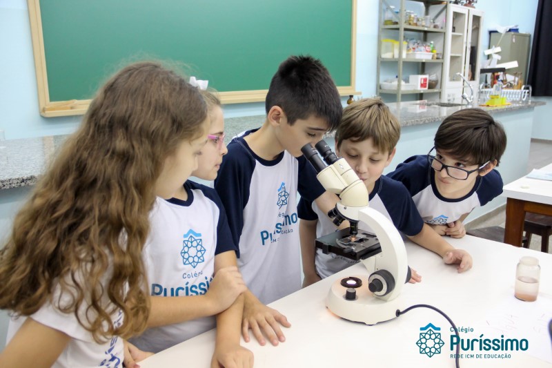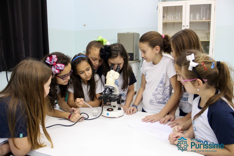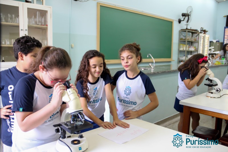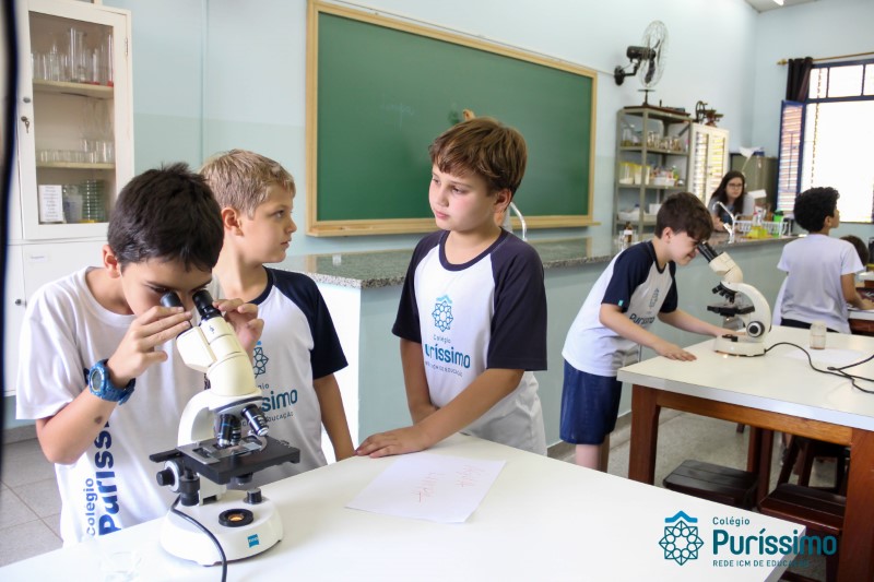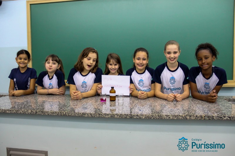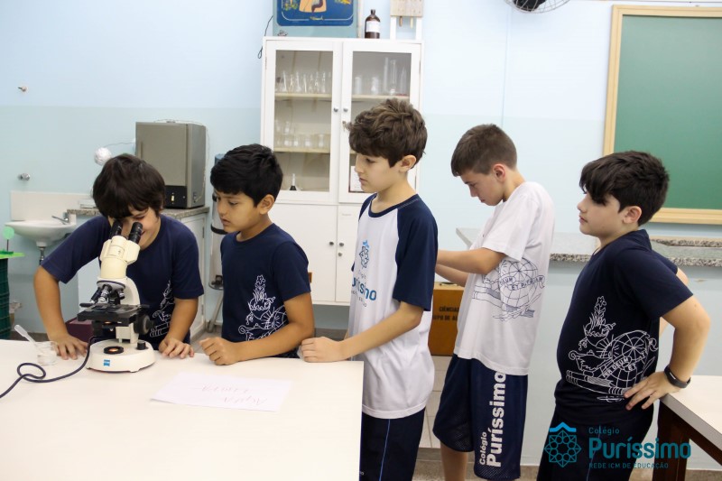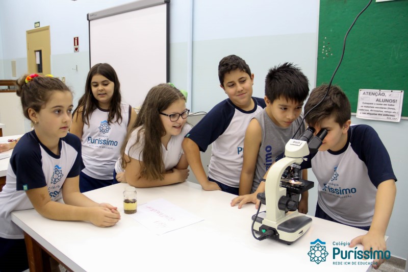 Os alunos dos quartos anos estão realizando diferentes estudos sobre a água e, para que a aprendizagem ocorresse de forma significativa, os alunos estiveram no laboratório de Ciências, onde visualizaram os componentes presentes na água limpa, suja e contaminada.